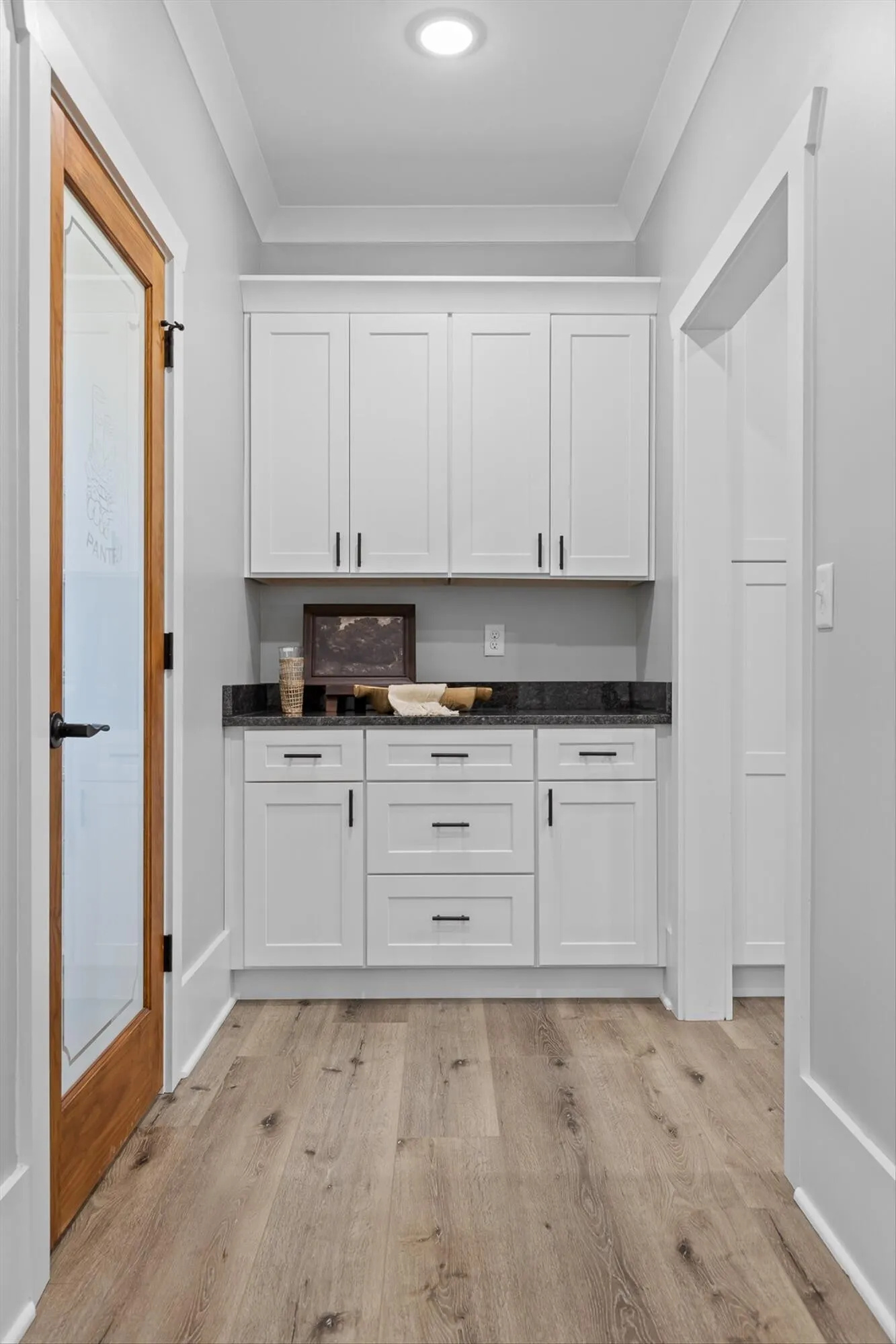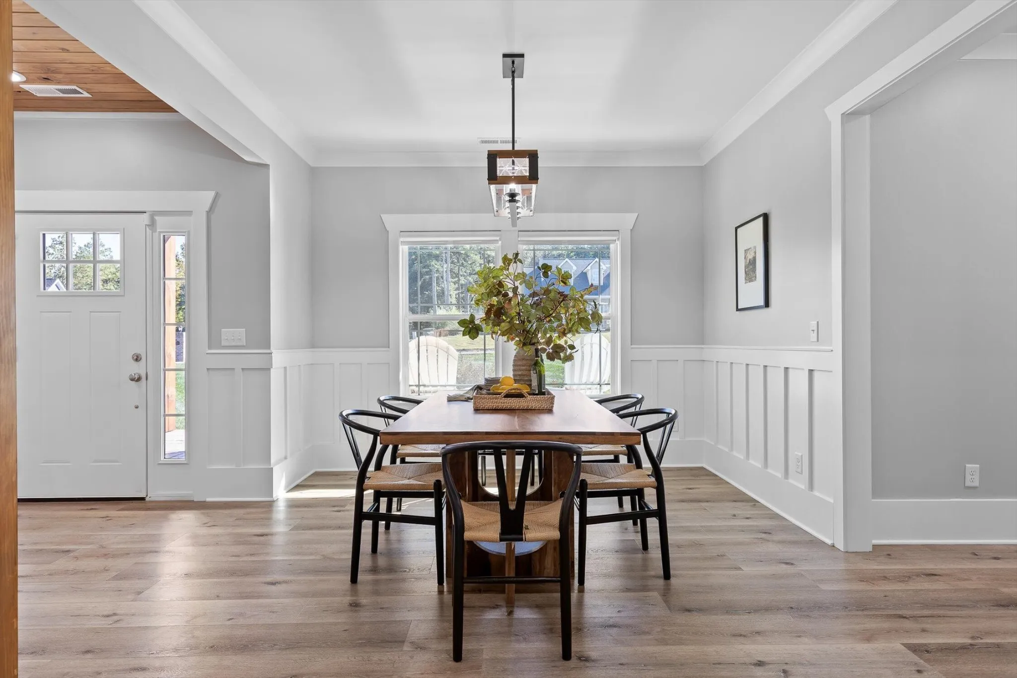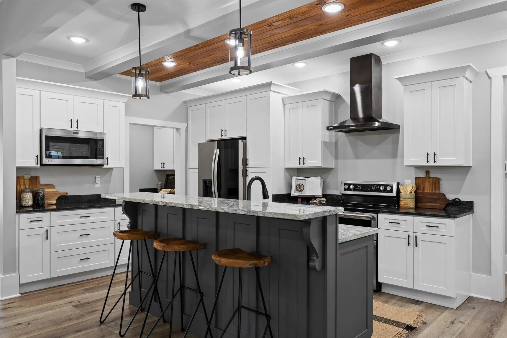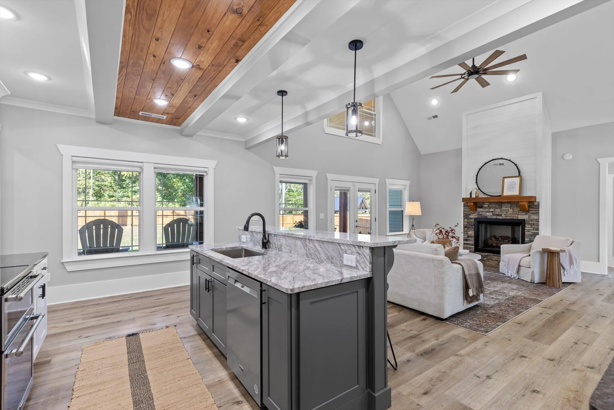 The open kitchen includes a large island, soft-close cabinetry, granite countertops, a stainless steel hood vent, and both a butler’s pantry and walk-in food pantry. A bright dining area sits just off the kitchen, and the great room opens to a covered back porch with stamped concrete flooring, tongue-and-groove ceilings, and heavy timber supports- overlooking the large, newly fenced backyard with plenty of room for play, pets, and outdoor gatherings.