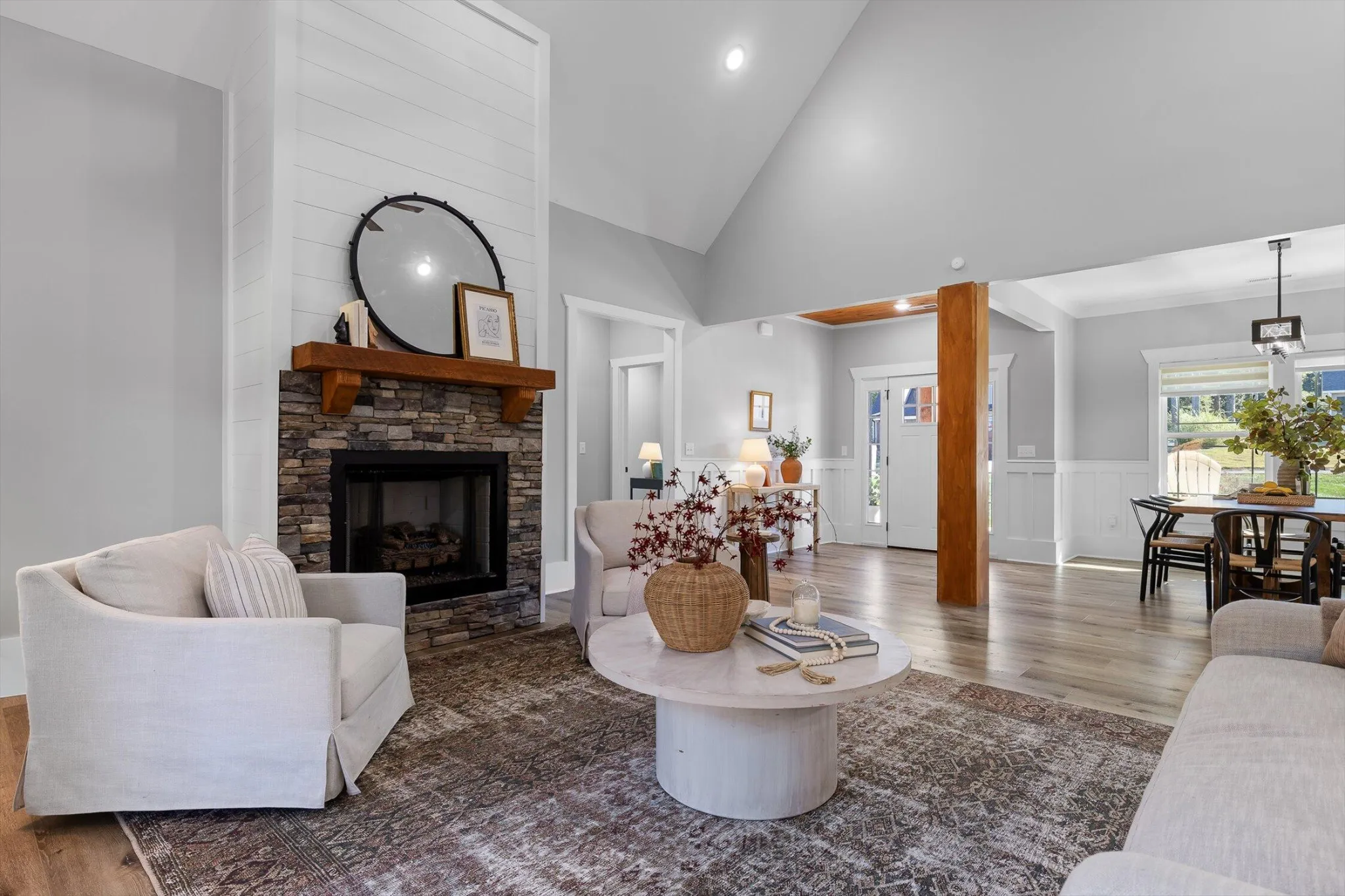 Quality craftsmanship and thoughtful design come together in this beautiful Chickamauga home. Step through the two-toned Craftsman-style front door into a spacious living area featuring a natural stone fireplace with a rough-cut timber mantel and shiplap accents extending to the vaulted ceiling.