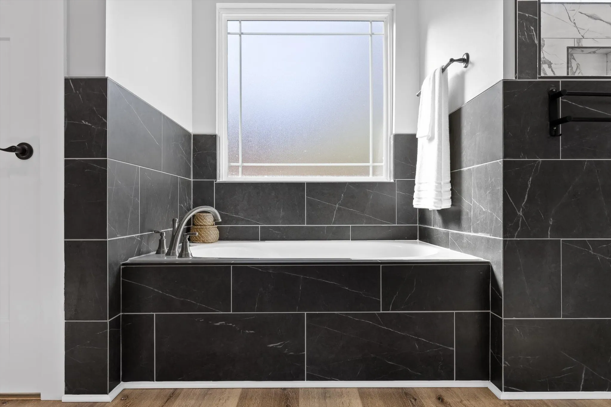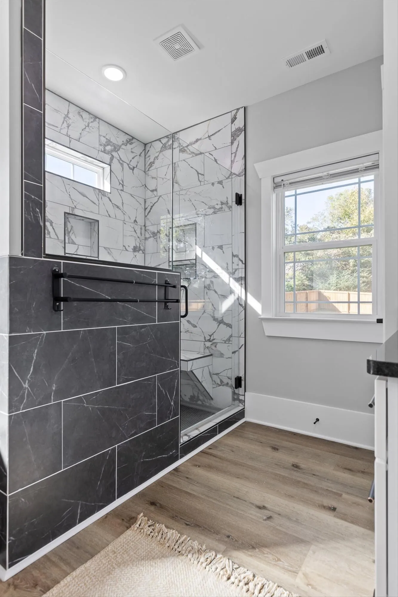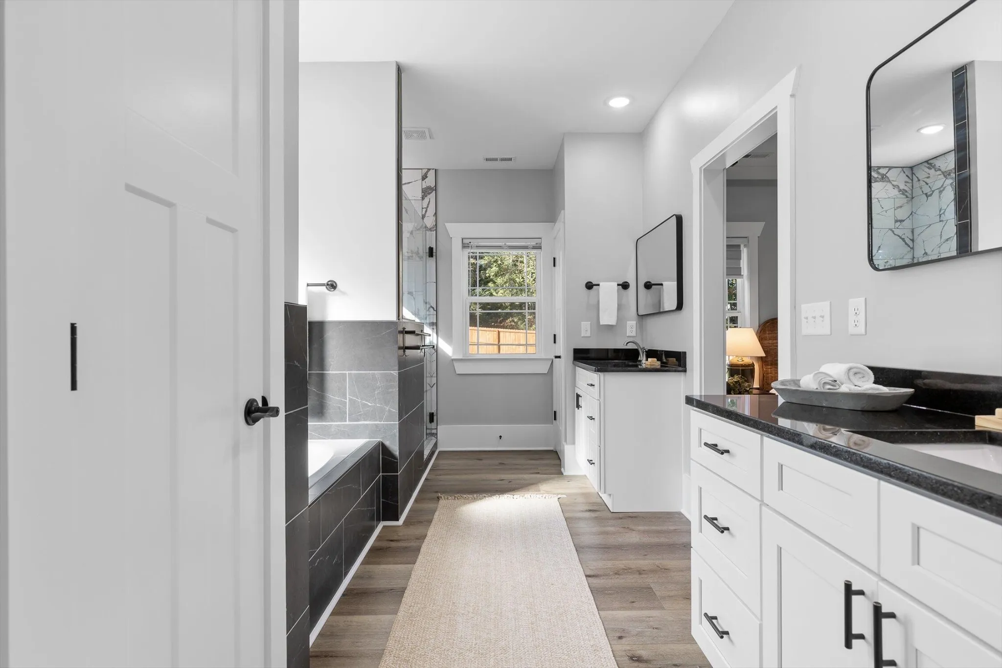 The main-level primary suite overlooks the backyard and features a large bathroom with double vanities, a soaking tub, a walk-in shower for two, and a spacious closet. Two additional bedrooms and a full bath are also on the main level, with a fourth bedroom and private en suite upstairs.