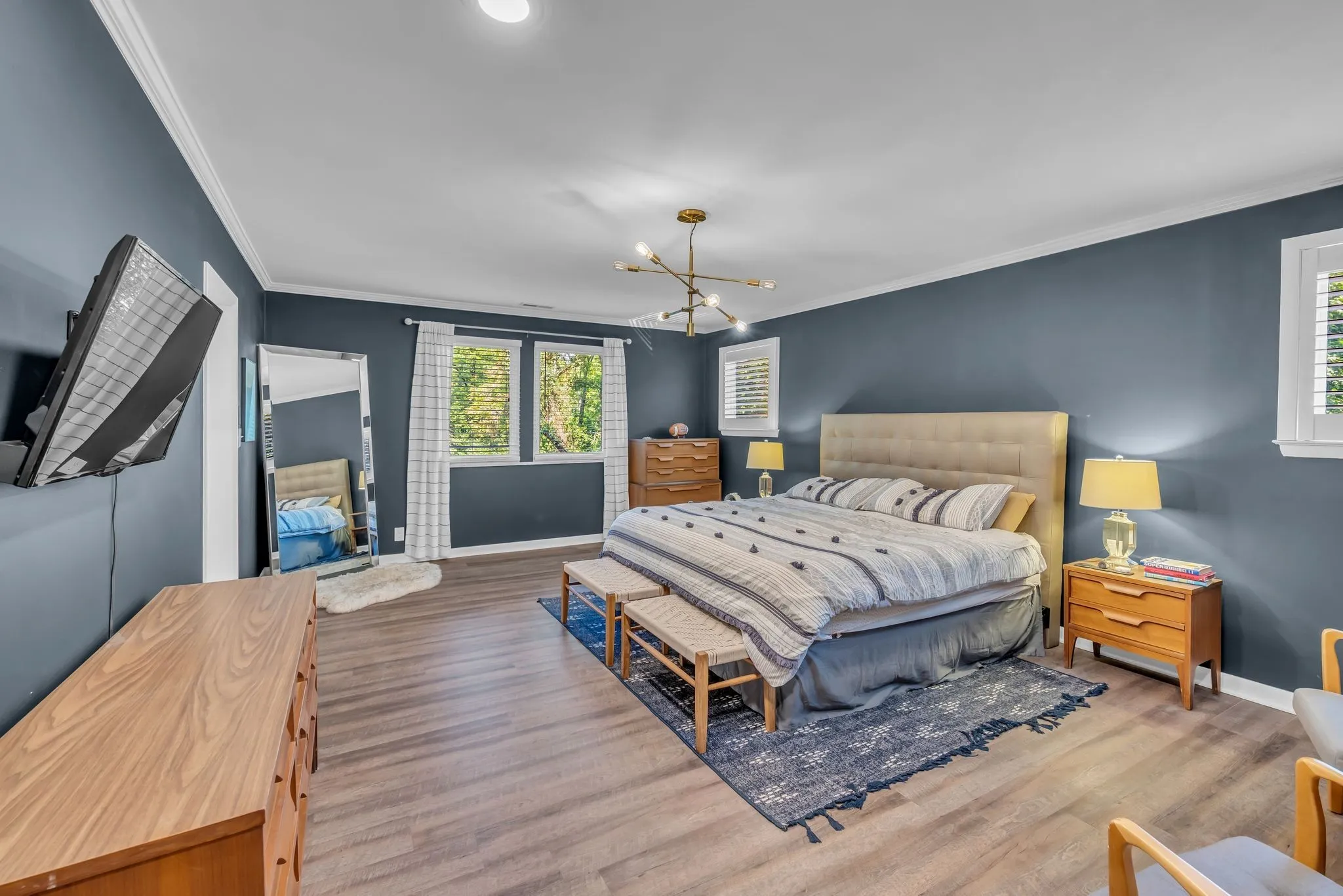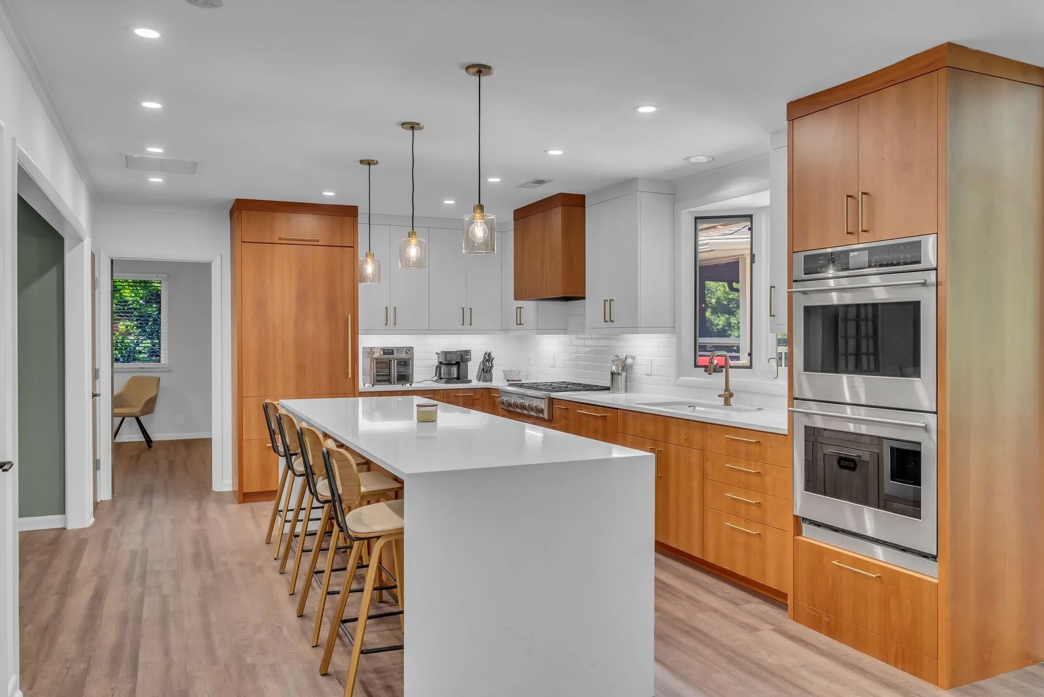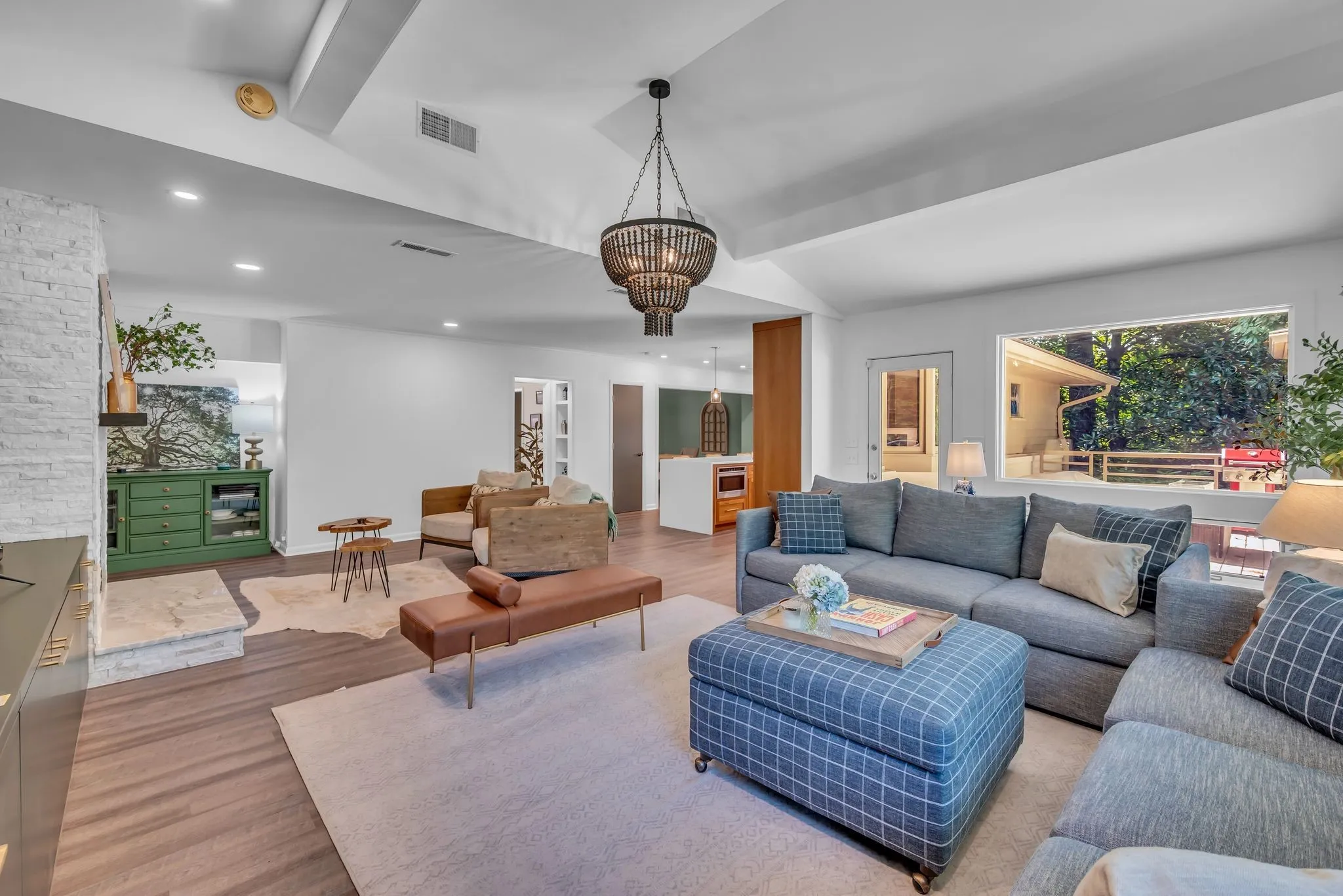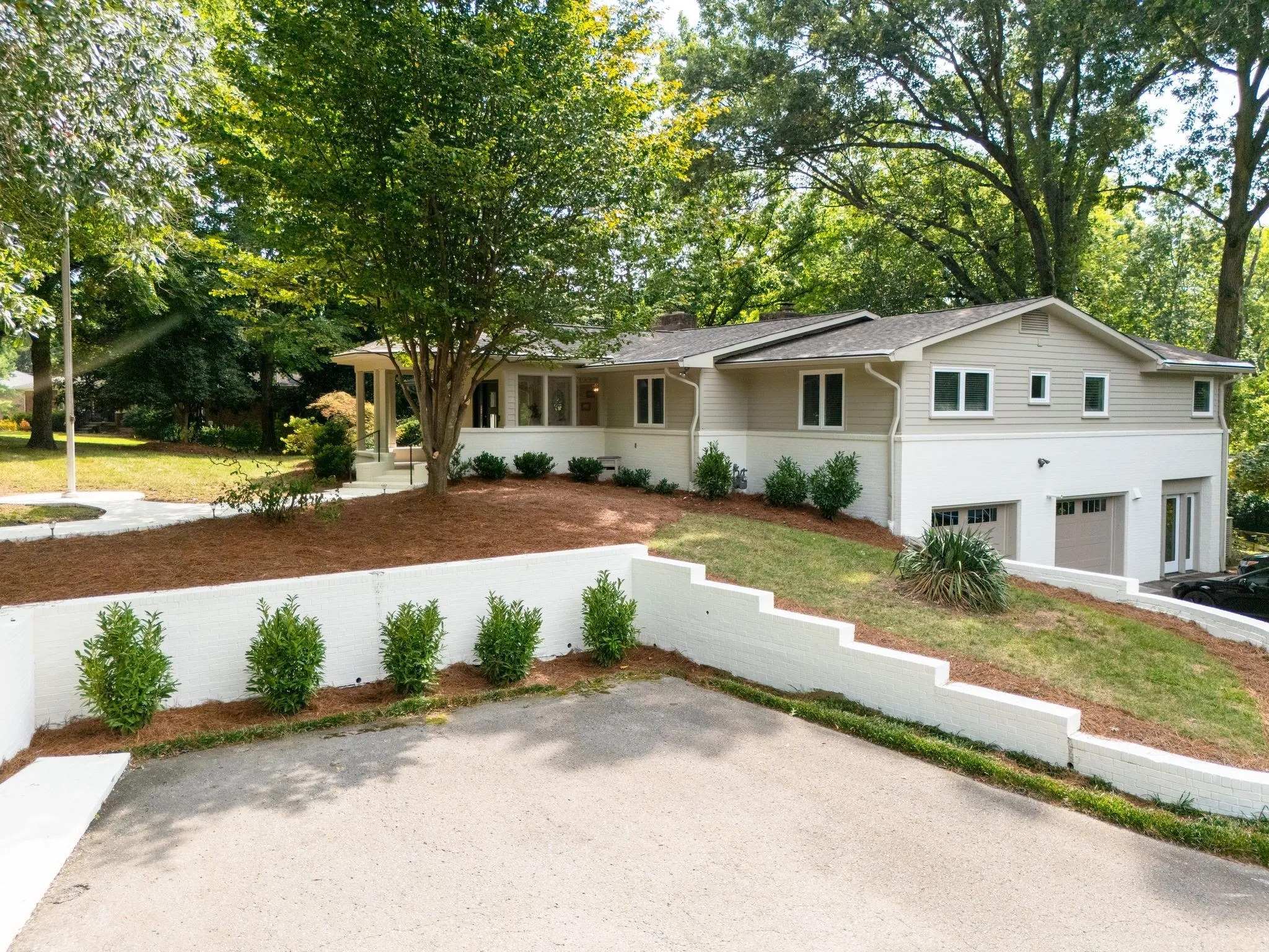 Beautifully renovated Mid-Century Ranch on one of Oak Hill’s best streets. Over 5,500 square feet with 6 bedrooms and 4.5 baths on an amazing acre lot. The home has the updates you are seeking with the Classic Nashville character you desire; even Country Music legend Webb Pierce owned this property in the 1960s. The main floor has a primary suite with two walk-in closets and a large bathroom overlooking the private backyard. Also on the main floor is a second suite hosting its own private bath and two additional bedrooms with another full bath and half bath. The entry foyer is a statement piece and leads to a handsome formal living room with a wall of windows overlooking the front yard. The living room has built ins with a fireplace and a stunning wall of windows looking over the backyard and large oak trees. The kitchen has been completely renovated in recent years with island seating and opens to a formal dining room.