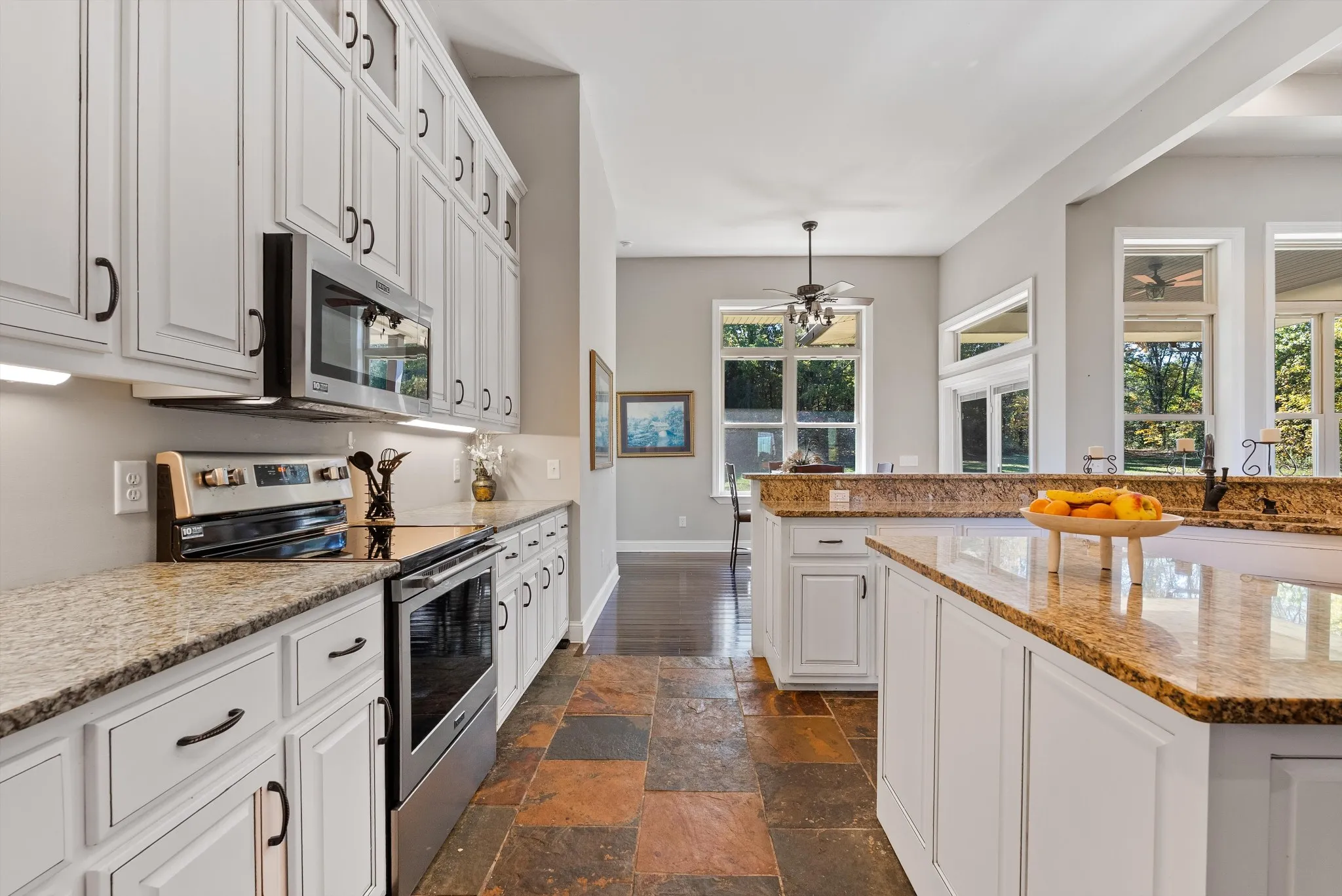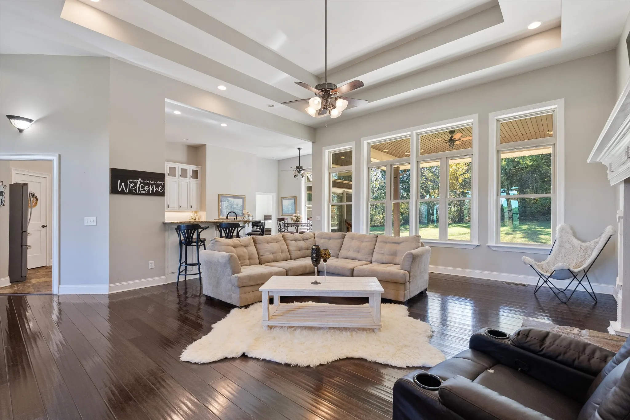 Inside, the main floor delivers pristine luxury with an open living and kitchen layout ideal for everyday comfort and entertaining. Tall ceilings and a stunning stone fireplace anchor the living space, while massive windows flood the home with natural light. Standing in the kitchen, you get a sweeping view of the property, and it genuinely feels like the serenity of the outdoors flows right inside.