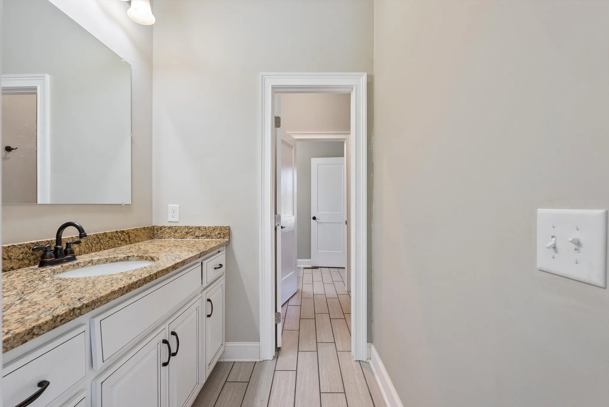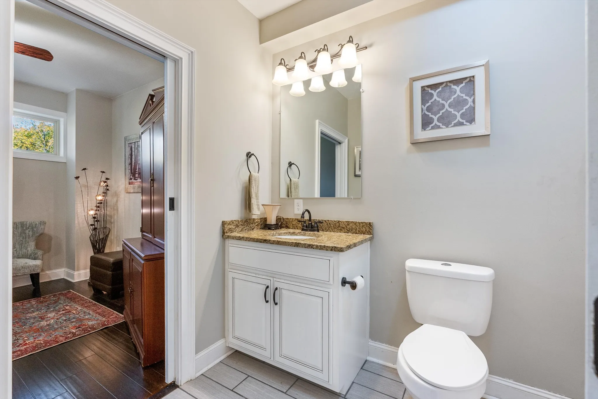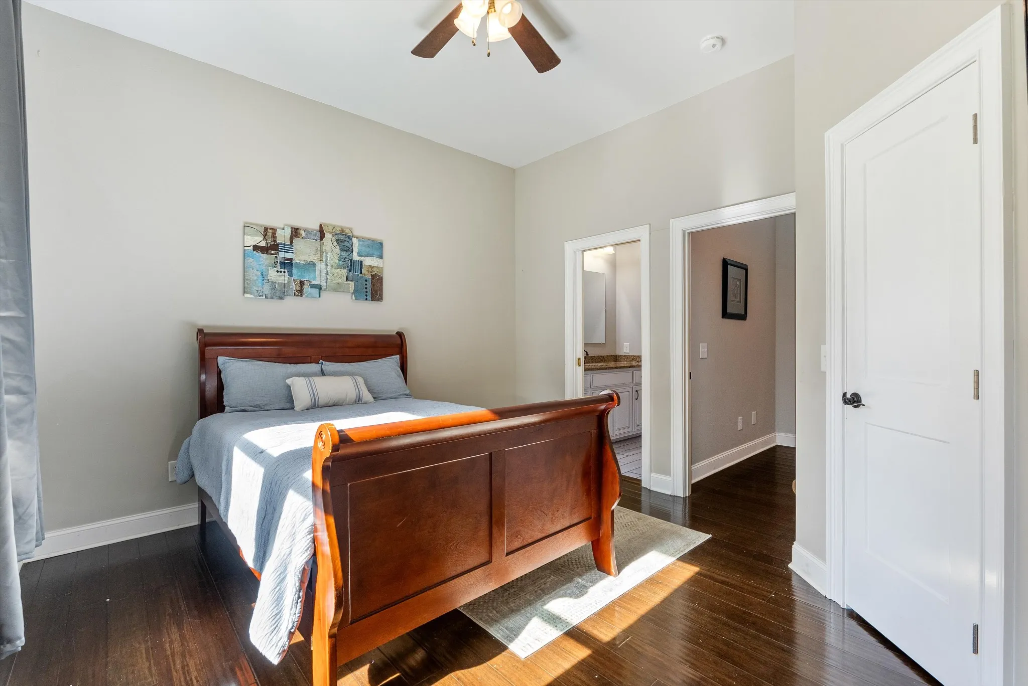 The primary suite brings spa-level relaxation with dual sinks, a huge walk-in shower, and a jetted soaking tub. It also includes direct access to the back patio, giving you a private place to step out and unwind. Two additional main-floor bedrooms add convenience and flexibility. Hardwood floors run throughout these rooms, and every bedroom includes a ceiling fan.