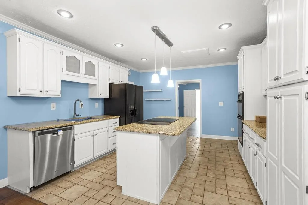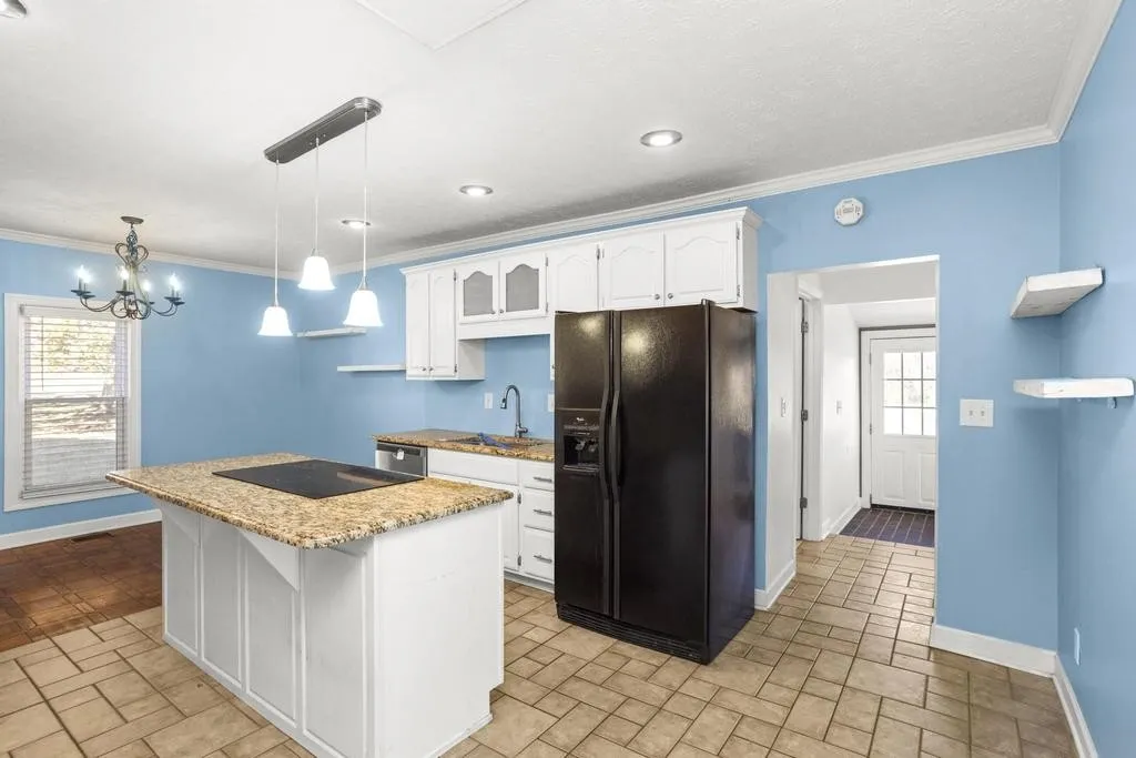 Inside, natural light fills the rooms, highlighting the fresh flooring, crown molding, and cozy fireplace. The living area flows easily into a bright kitchen featuring granite countertops, a large center island, pendant lighting, and crisp white cabinets. The dining area overlooks the yard, making it perfect for casual meals or family gatherings.