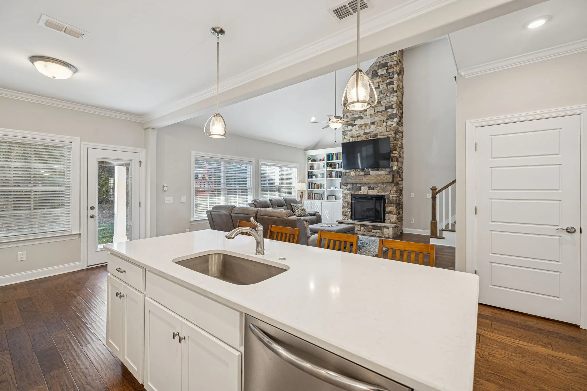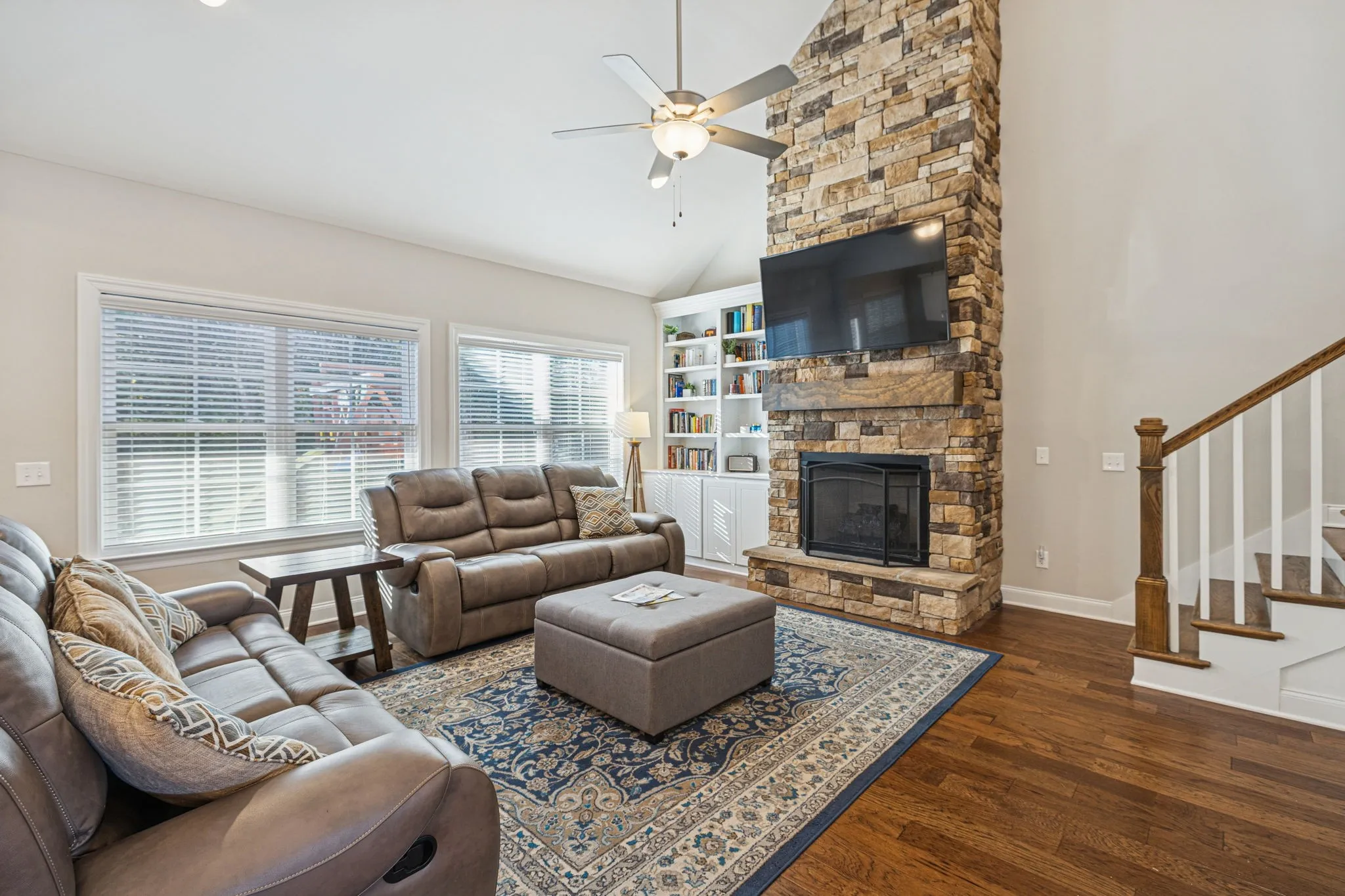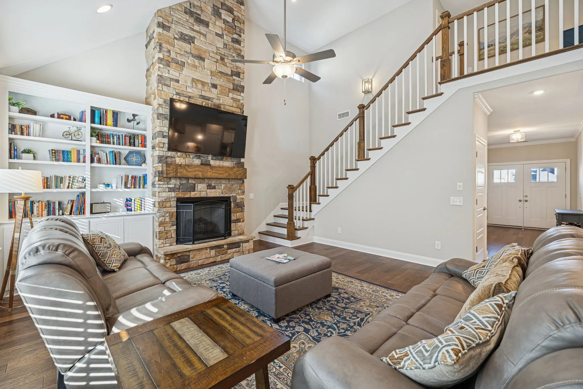 Step into luxury living with this like-new, move-in ready home in the highly desirable Farms community – known for its peaceful, country feel and top-rated Stewarts Creek schools. This stunning 3-year-old residence features an impressive double front door that opens to an elegant foyer and an open-concept floor plan. Step into the living room with soaring vaulted ceilings, built-in shelving, and a cozy gas fireplace that elevates the warm, inviting atmosphere. The gourmet kitchen offers a large center island with sink, sleek cabinetry, recessed lighting, stainless steel appliances, and a pantry for storage. Enjoy a formal dining room with beautiful board-and-batten trim – great for both everyday meals and special occasions. The main-floor primary suite provides a serene retreat with a spacious walk-in closet, double vanity sink, and a large walk-in shower. Upstairs, you’ll find three oversized bedrooms, two full bathrooms, a generous rec room, and convenient attic storage. Additional highlights include a dedicated first floor office space, laundry room, powder room, a spacious side-entry 3-car garage with carriage-style details, and premium water filtration system which remains with the home. Head out back to the covered patio and extended outdoor living space for entertaining! Backing up to a wooded area, this home offers privacy while still giving you access to sought-after community amenities. Perfectly situated between Murfreesboro and Smyrna, with access to commuter routes. Don’t miss your chance to own a luxury Murfreesboro home filled with upgrades – schedule your private showing today!