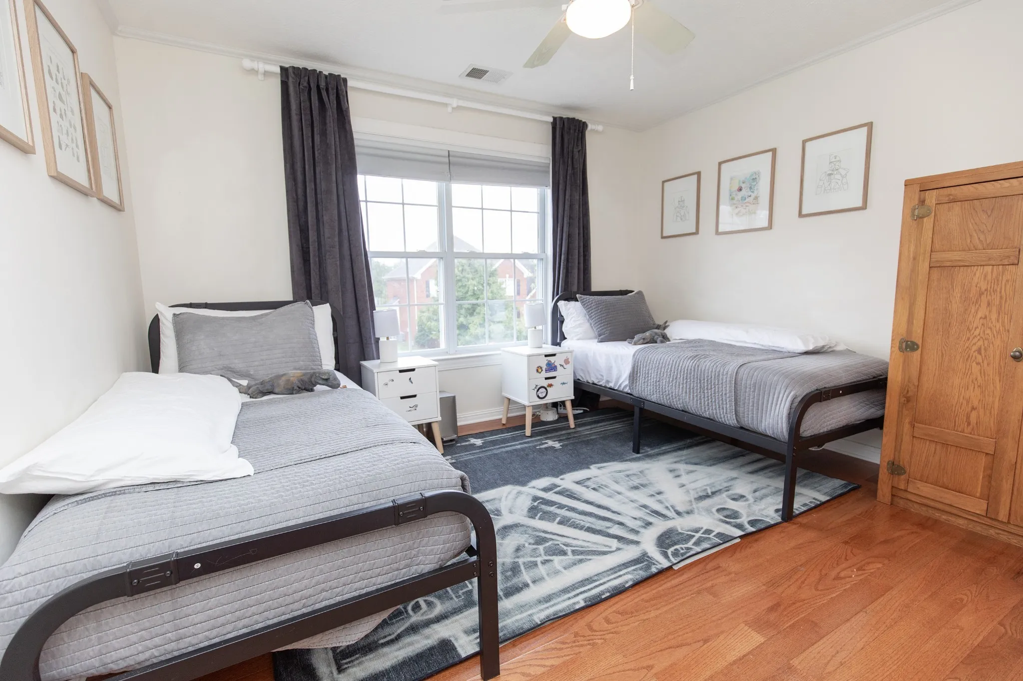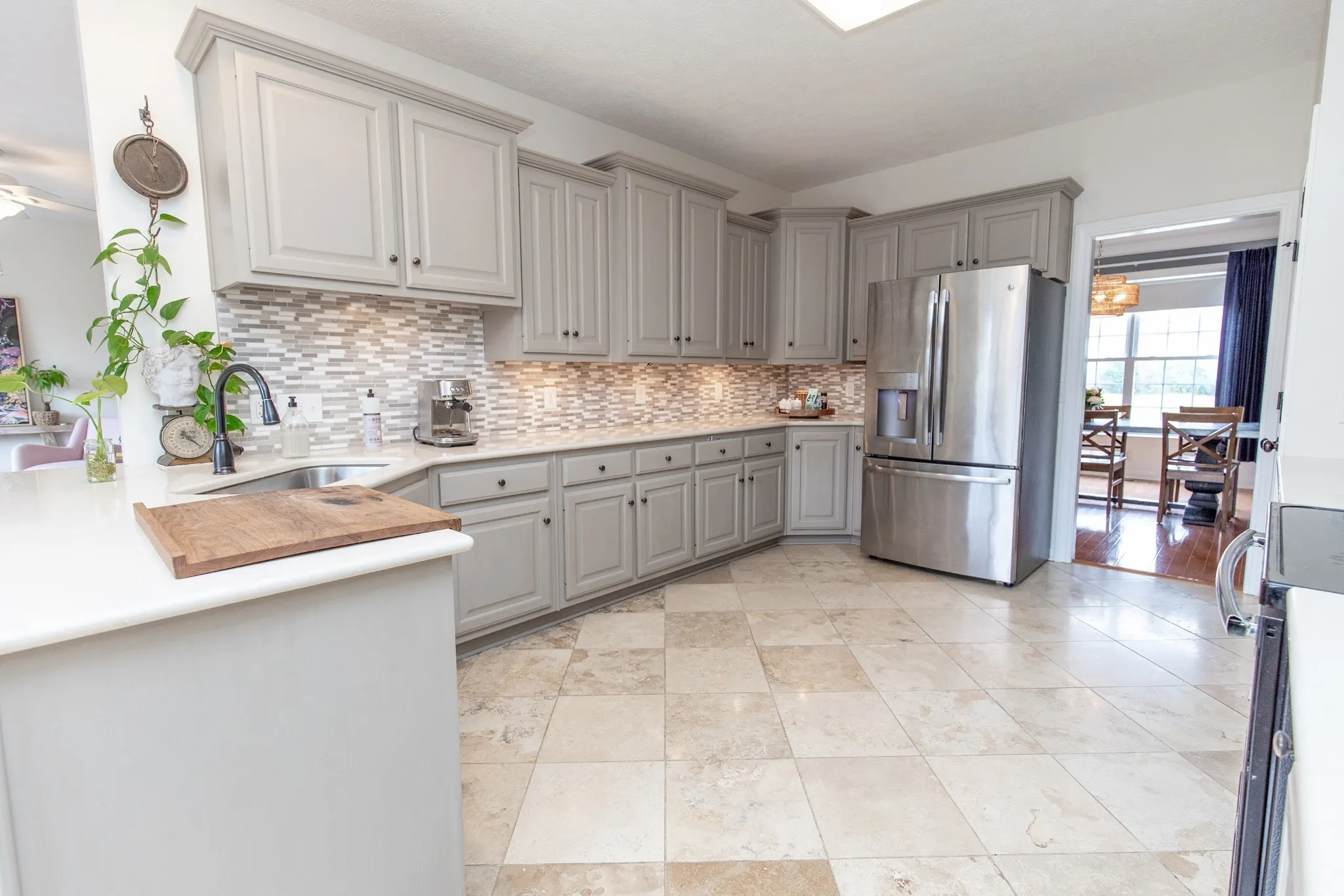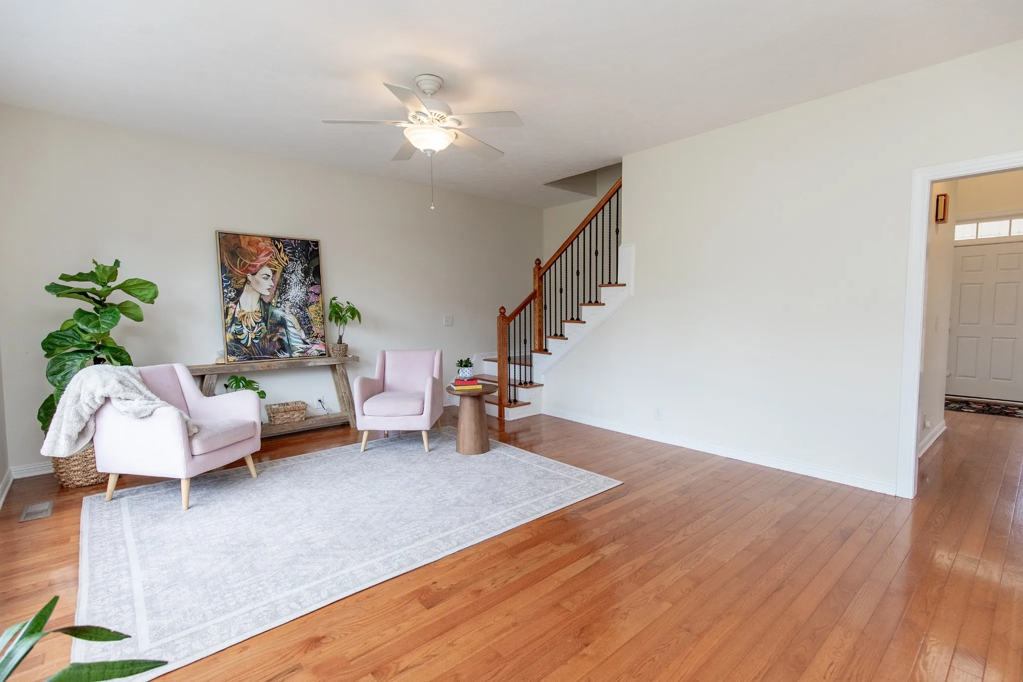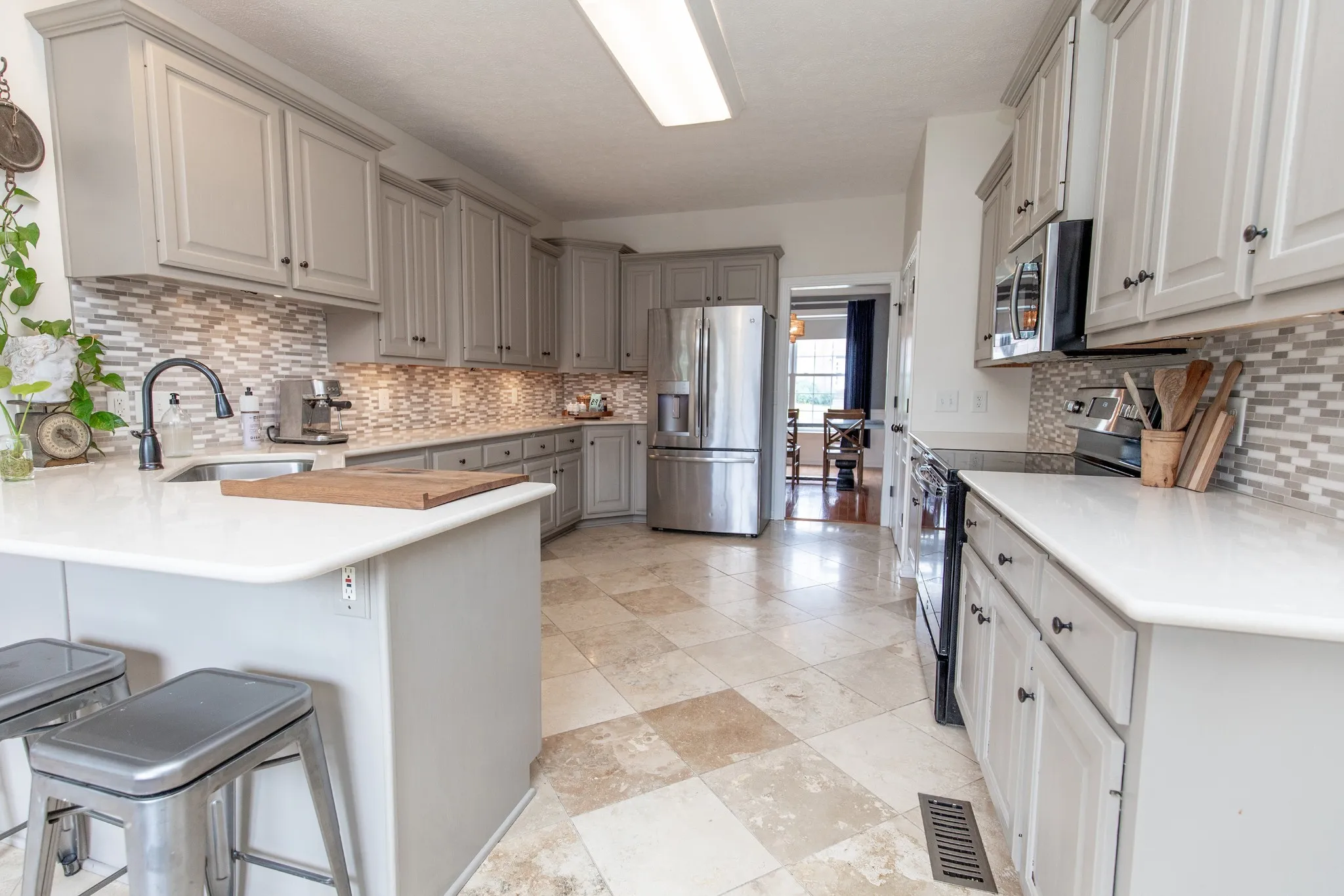 The chef’s kitchen shines with quartz countertops, stylish backsplash, stainless steel appliances, and a refrigerator included. Real hardwood floors flow throughout, leading to a dedicated office, elegant dining room, and spacious living room.
