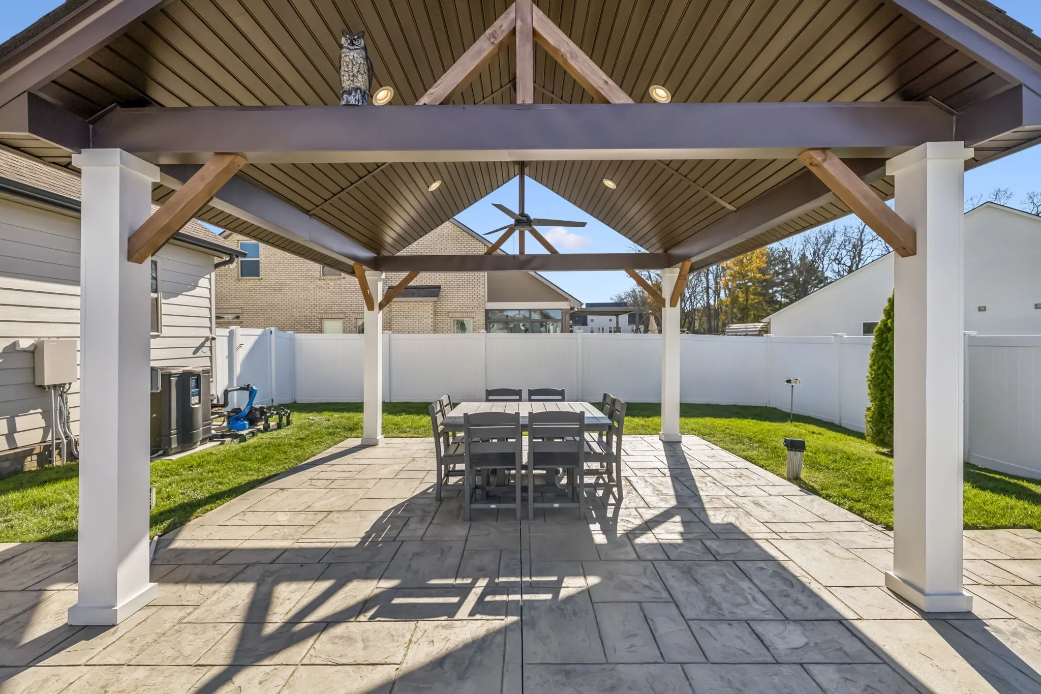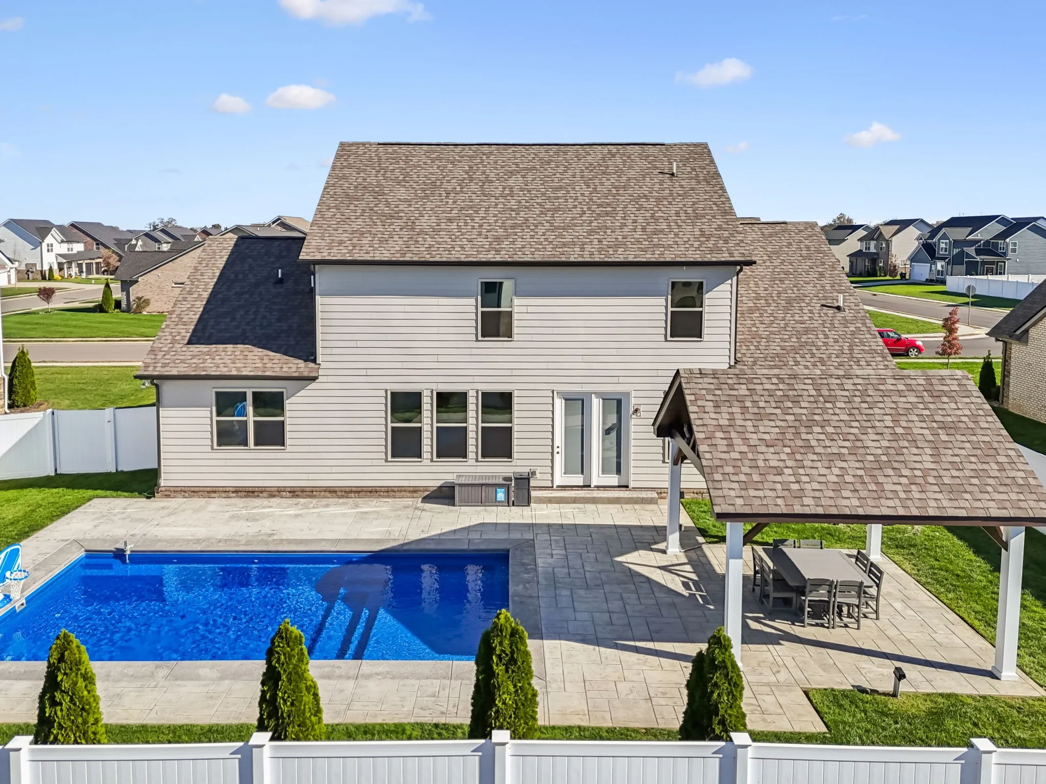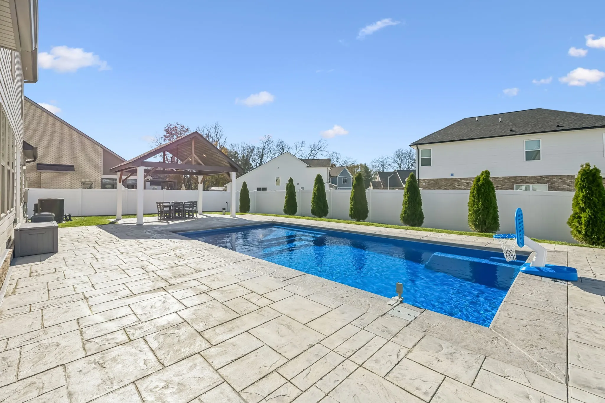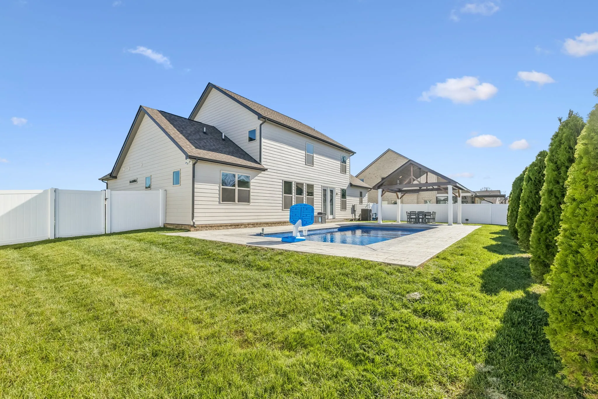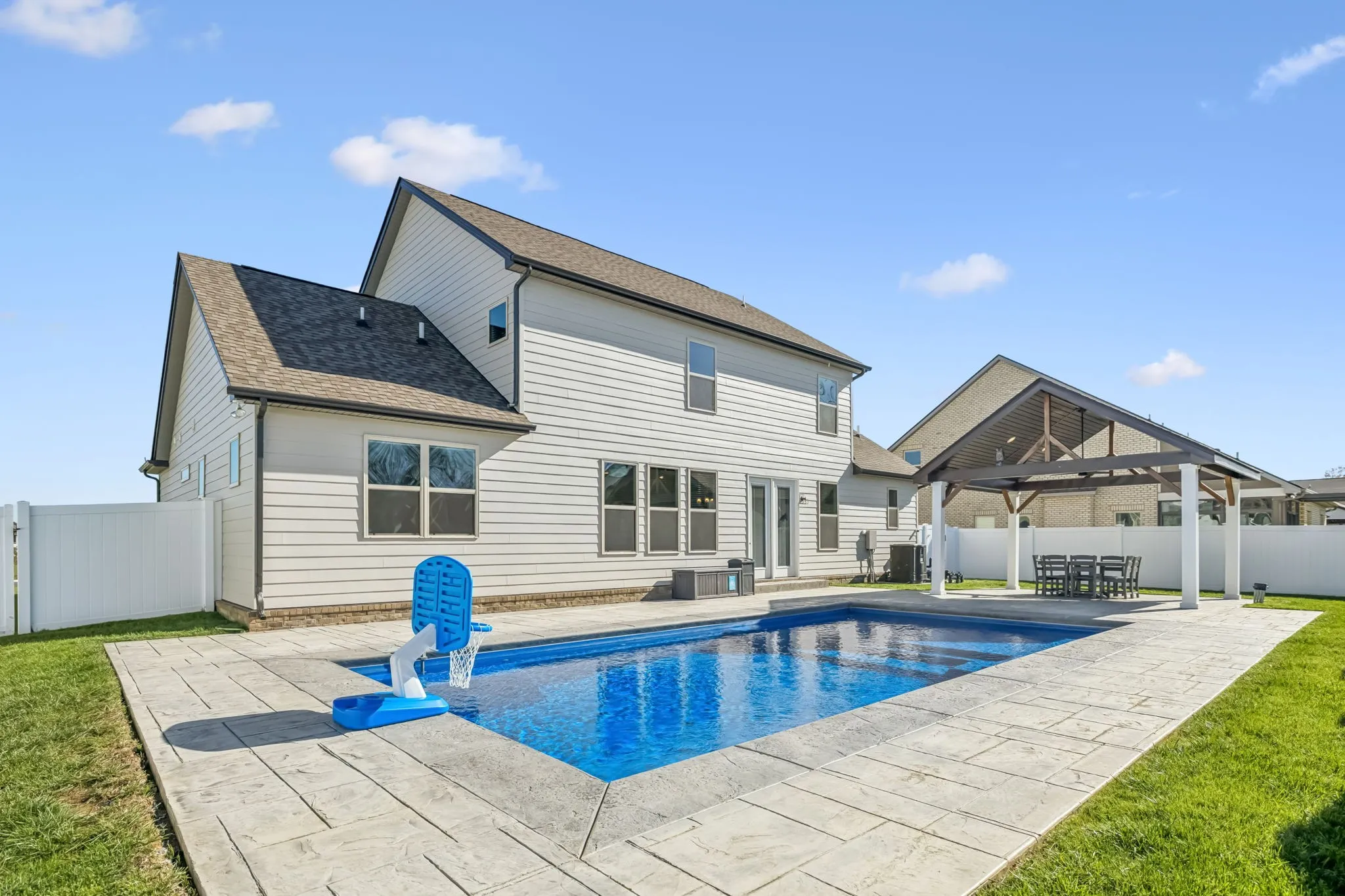 Step outside to your private backyard retreat! The sellers invested over $125,000 in the outdoor oasis just two years ago, featuring a new inground saltwater pool ($95,000) and a beautiful pavilion ($30,000), ideal for entertaining or relaxing year-round. The backyard is fully fenced with attractive white vinyl privacy fencing for added peace of mind.