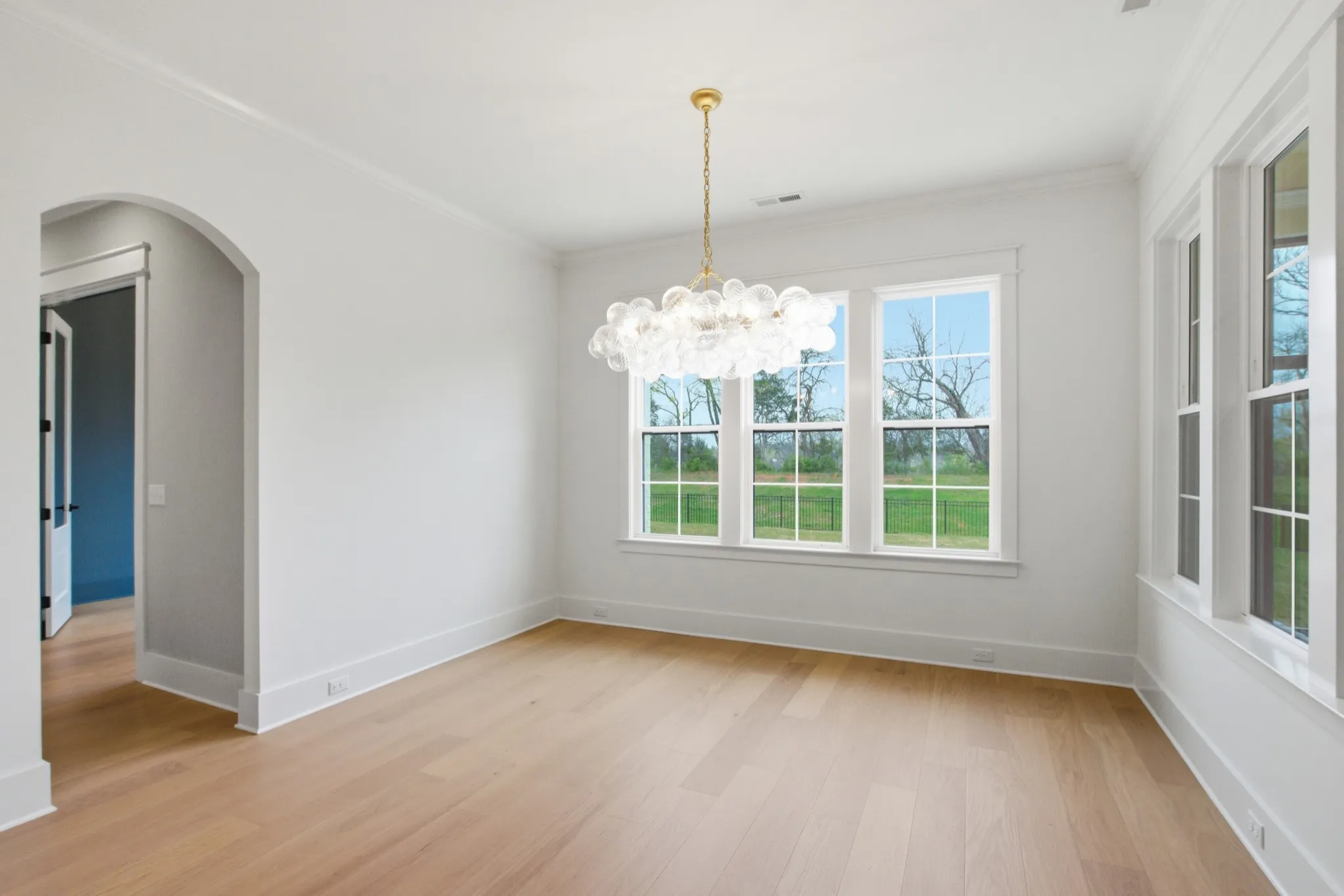 The gourmet kitchen is a showstopper with cabinetry extending all the way to the ceiling, a spacious 10’ island with quartz countertops, double ovens, a gas cooktop, and an impressive walk-in pantry featuring additional quartz countertops and cabinetry. The dining room is filled with natural light through windows overlooking the private backyard—where no neighbors are behind you.