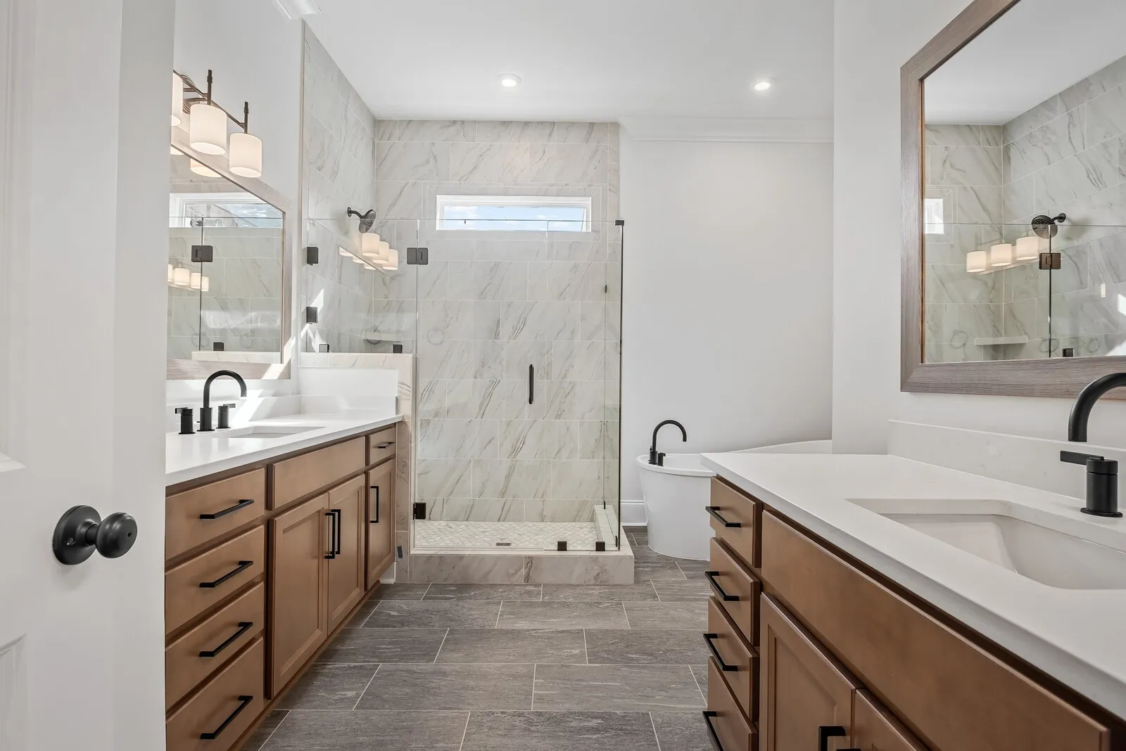 The luxurious primary bath invites relaxation with a stand-alone tub, a tile shower with a frameless glass door, and separate sinks for added comfort and functionality.