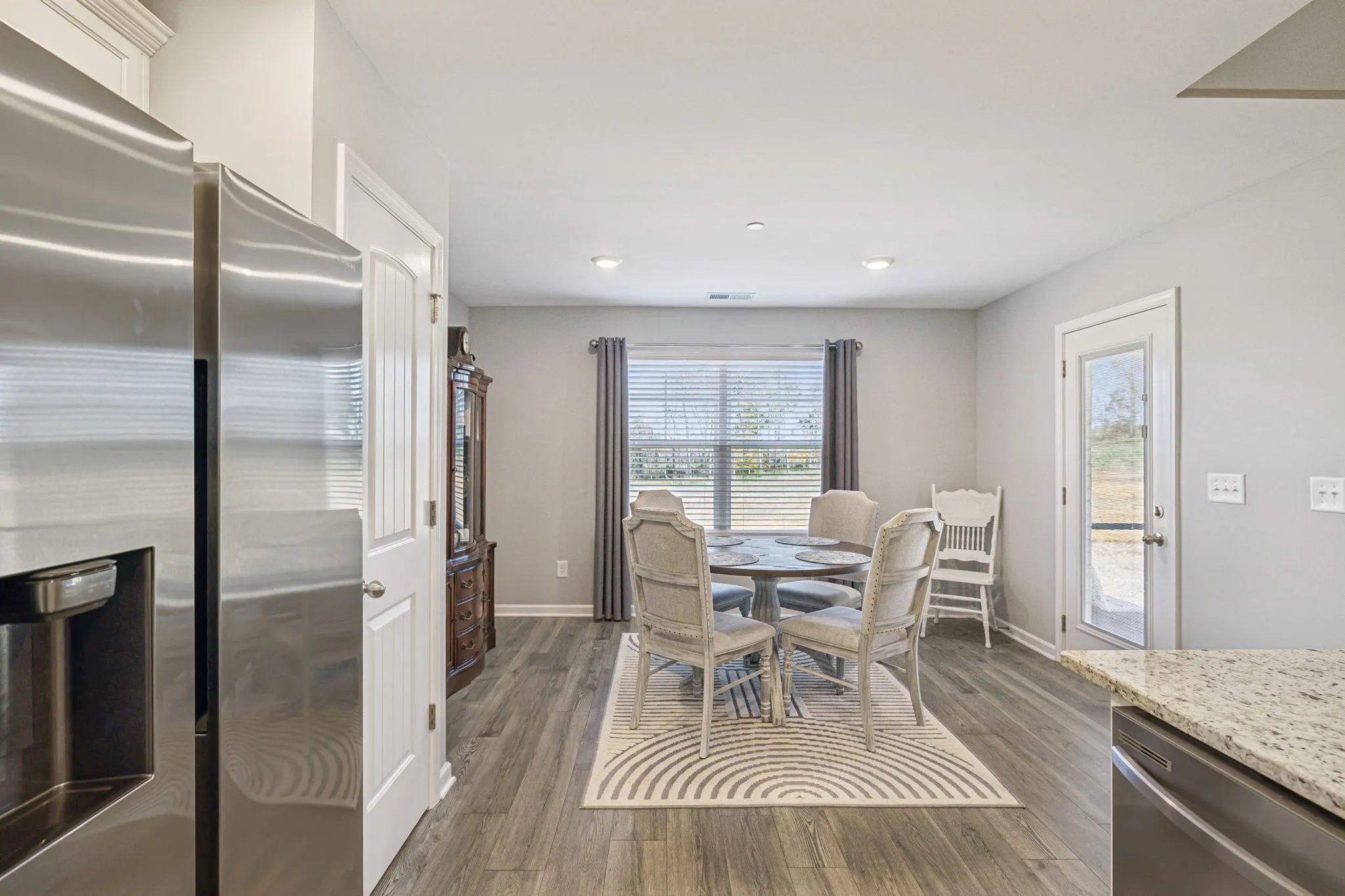 Step inside to find a bright and airy family room with vaulted ceilings, creating an open atmosphere that flows seamlessly into the dining and kitchen areas—perfect for entertaining. The kitchen offers granite countertops, a single-basin stainless steel sink, range, built-in microwave, dishwasher, and a pantry, providing everything you need in a functional and stylish space.