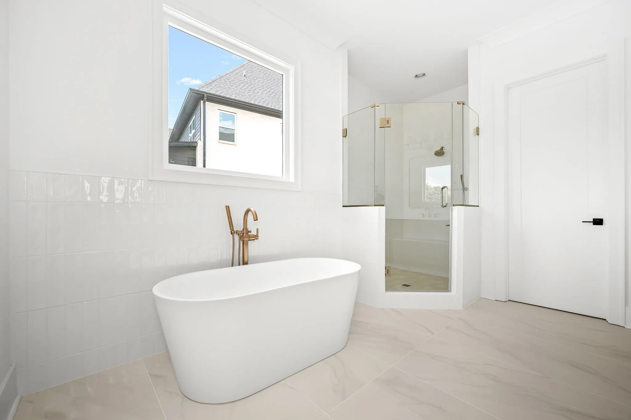 The luxurious primary ensuite includes a large tile-and-glass shower, a soaking tub, and premium finishes. Beautiful wood flooring flows throughout the main level, including the staircase and upstairs landing.
