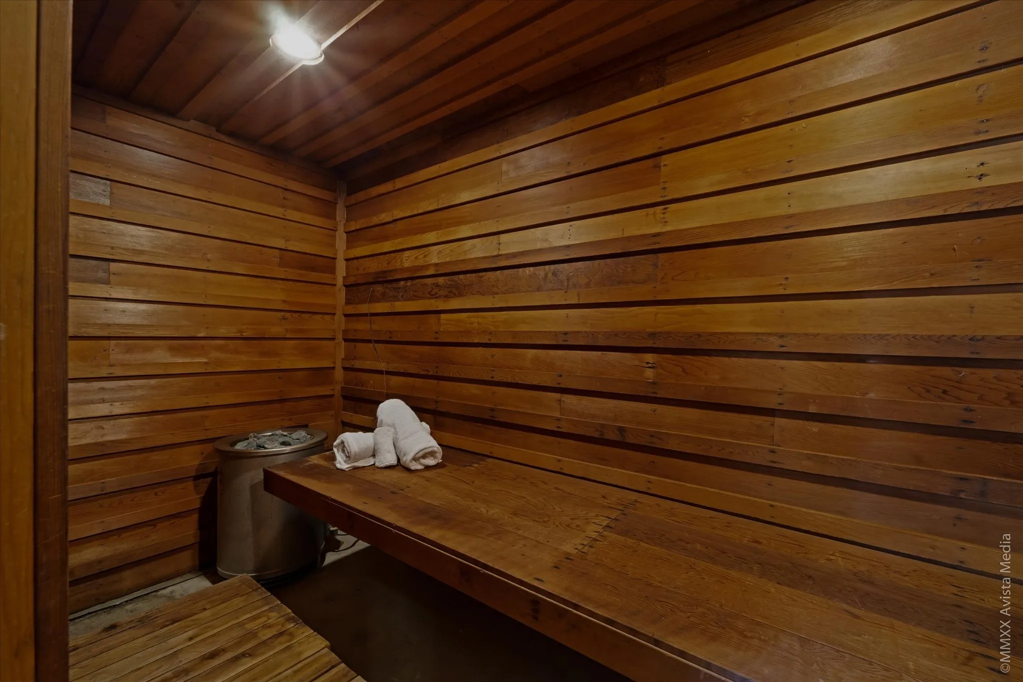 The home is designed for comfort and luxury, featuring two primary bedrooms (one on the main level and one downstairs), two cozy fireplaces, and a rejuvenating sauna.