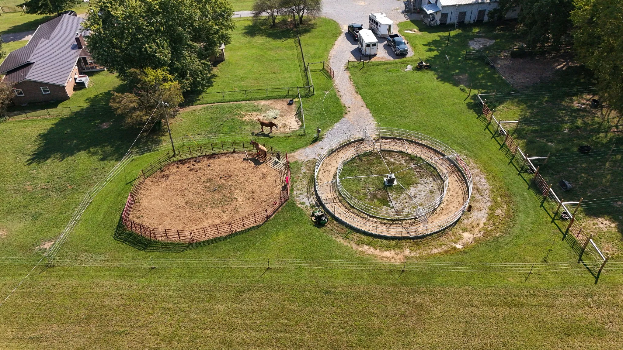 This charming all-brick 2 bed / 2 bath home features a 2-car garage and bonus/office room, plus durable metal roofs on both the house and barn. The land offers 5 fenced horse pastures, multiple storage sheds, lean-tos, a barn with 9 stalls, a tack room, and a hay loft. Ideal for trainers, the property includes a riding arena with its own driveway access, along with a round pen and negotiable horse exerciser. An RV pad with full hookups adds extra functionality for guests or traveling riders.