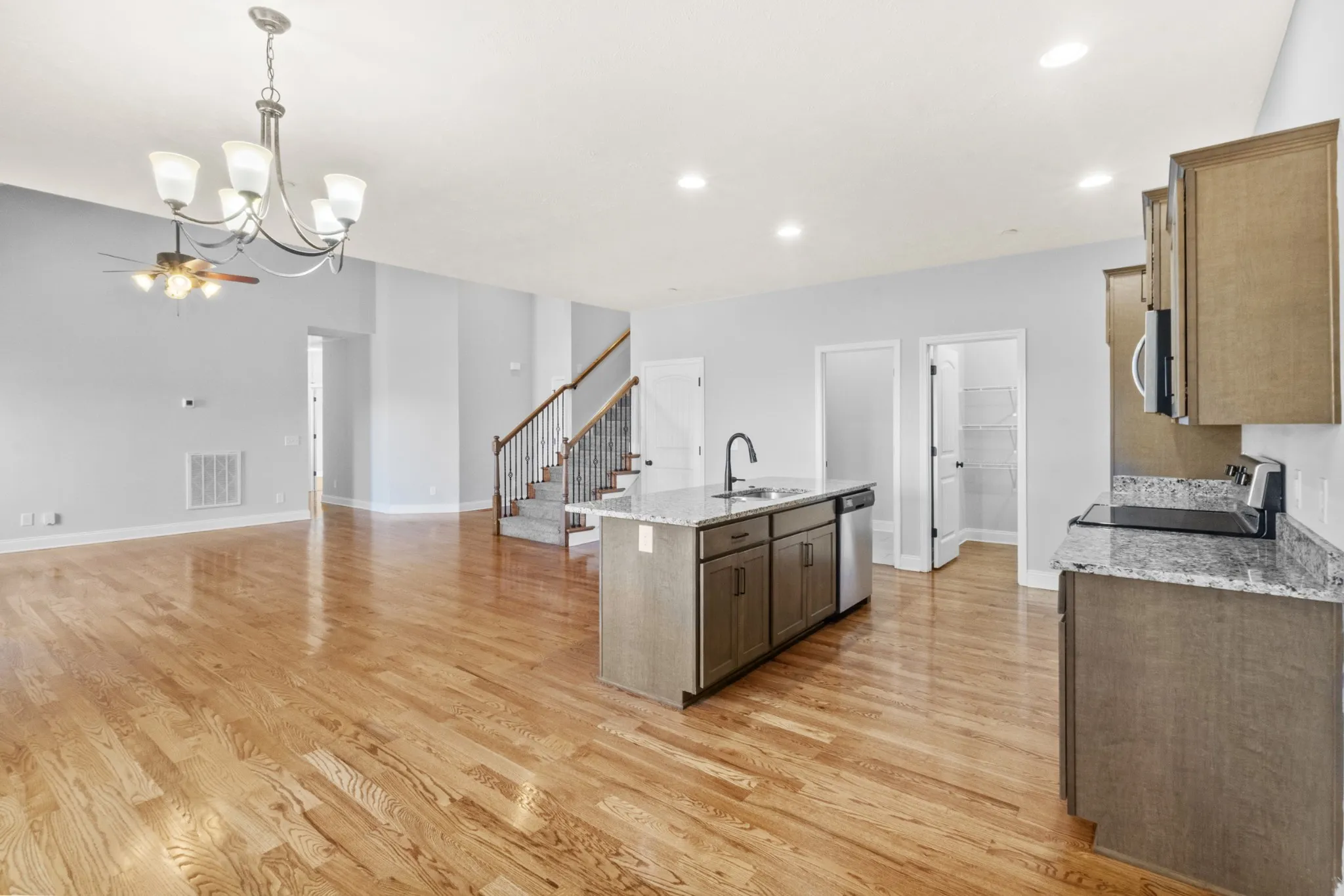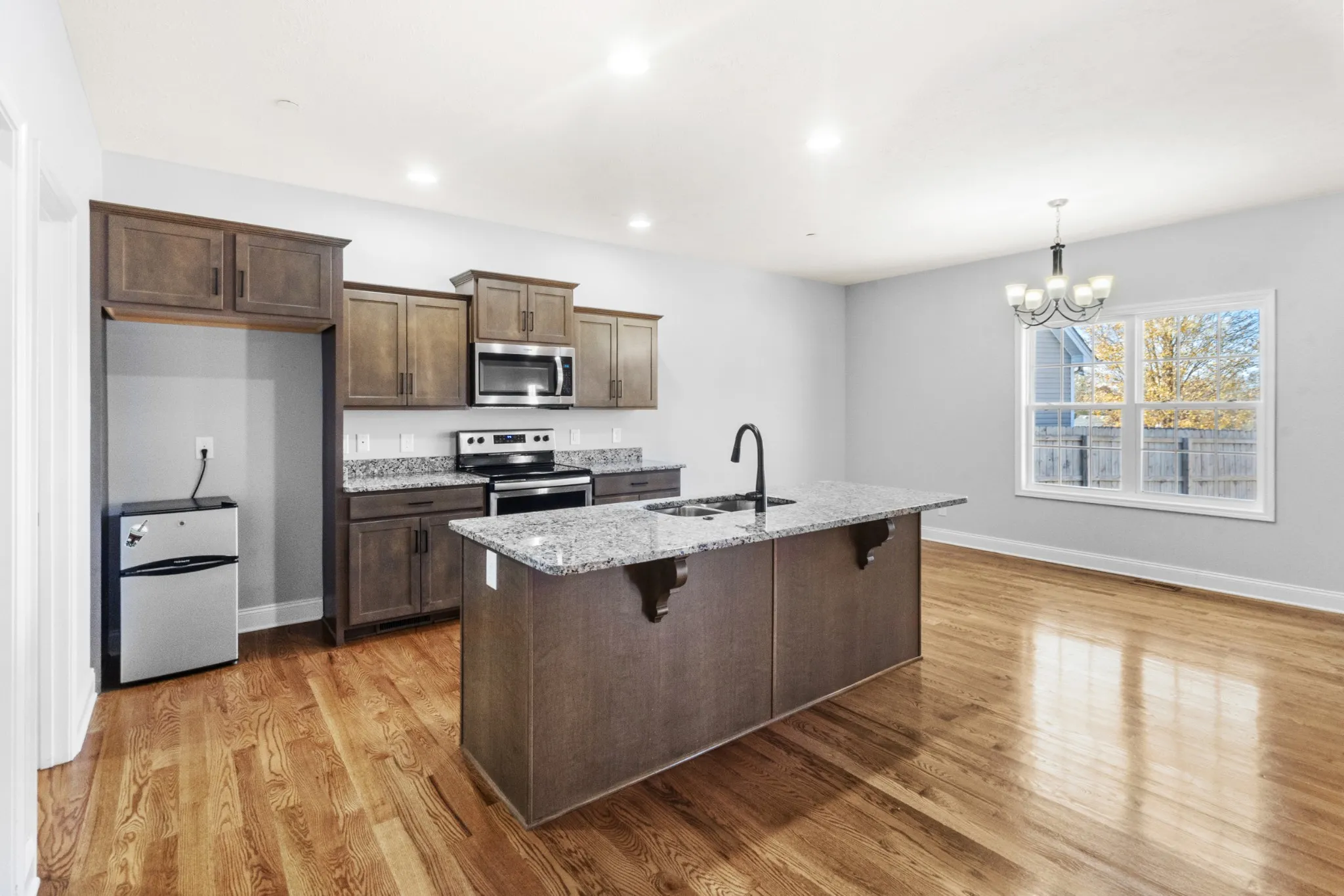 • Sophisticated open-concept kitchen and living area showcasing gleaming hardwood floors