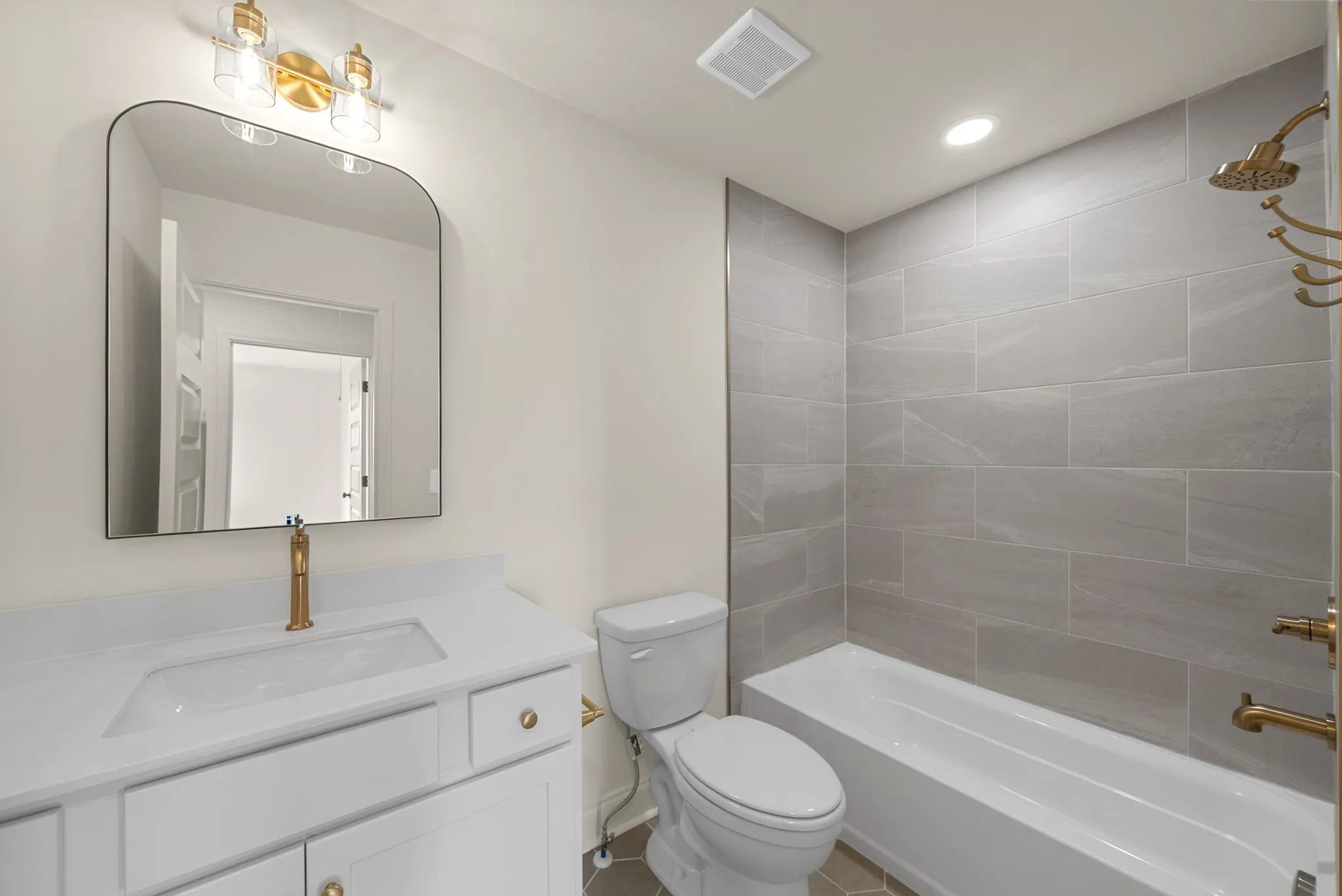 Upstairs, the home offers three comfortable bedrooms, including a serene primary suite with custom-tiled walk-in shower. The guest bath features a beautiful tile tub surround, and all bathrooms are finished with upgraded tile flooring and designer detailing. Ample closet space throughout ensures both style and function.
