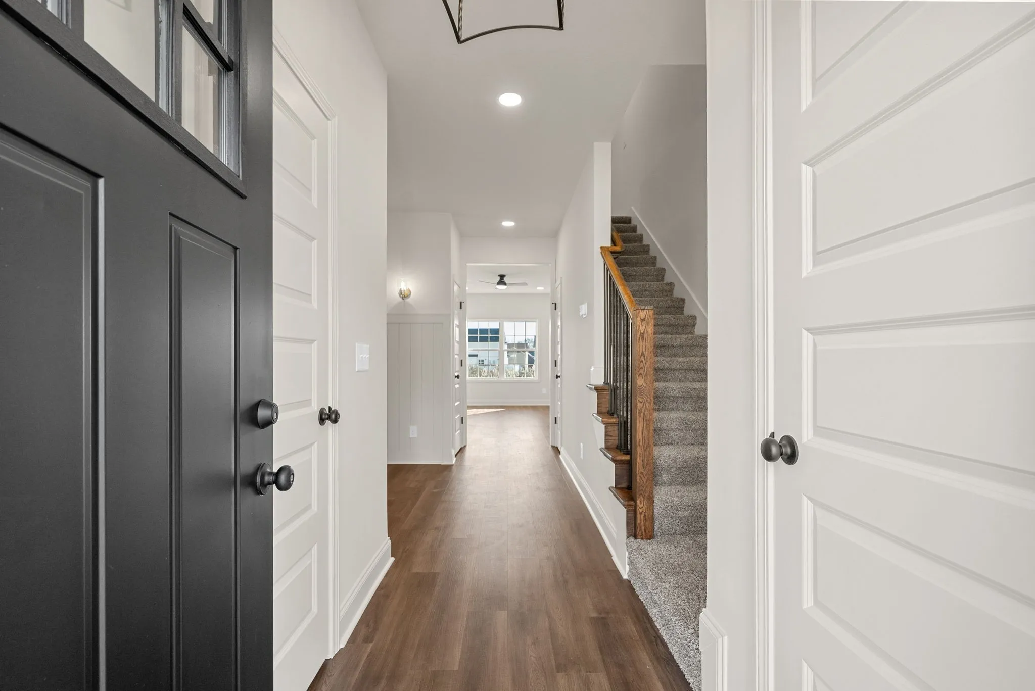 Beautiful modern farmhouse combines style, comfort and quality in a location close to town yet tucked away from the hustle and bustle. Its inviting mix of board-and-batten and shake siding create a charming curb appeal. Inside you’ll find an open and thoughtful layout with 9-foot ceilings and high quality LVP flooring on the main level. The welcoming foyer includes a convenient drop zone and half bath. The spacious living and kitchen areas flow seamlessly together. It features elegant quartz counter tops, a large peninsula with generous seating, classic white cabinetry and upgraded plumbing fixtures throughout. Sliding glass doors lead to a covered patio and a spacious back yard, perfect for relaxing or entertaining.
