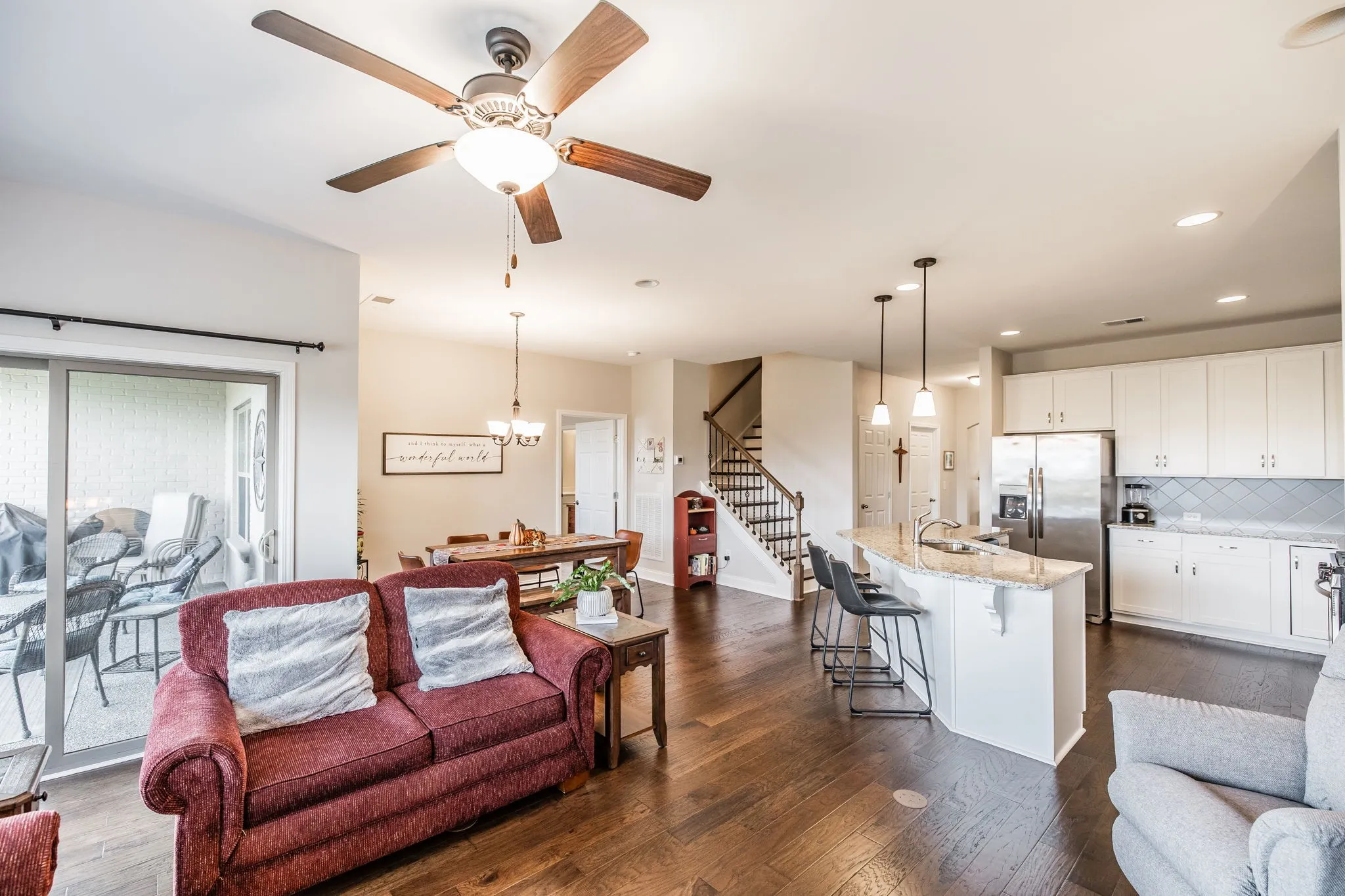 This is it! Welcome to a beautiful villa nestled inside a truly wonderful community that has so much to offer- such as a resort style pool, playground, park, walking trails, fitness center, clubhouse, planned activities and events. Well maintained and practically like new, this spacious home is designed to take advantage of natural light, views and comfort within an open floor plan filled with upgrades! Charming details from the moment you walk through the arched covered entrance, foyer leads to a guest room and full bath and onto a flex room currently used as an office. The primary suite, located at the back of the home for added privacy, features a large en-suite bathroom complete with an oversized walk-in shower, double vanities and a huge walk-in closet. The heart of the home is indeed the all white gourmet kitchen with an oversized island, soft close cabinetry, walk in pantry, gas range and stainless appliances. Ideal for entertaining, the family room and dining area are combined with the kitchen into one enormous great room! Staircase off of dining area leads to the second floor with a private third bedroom and full bath. There is also a large unfinished walk-in attic that is waiting for your design imagination- many neighbors have converted this area into a bonus/rec room! One of the features the sellers will miss most about this home is enjoying the peaceful mornings and evenings, sitting on the covered back patio and watching the birds and wildlife, in the wooded common area.