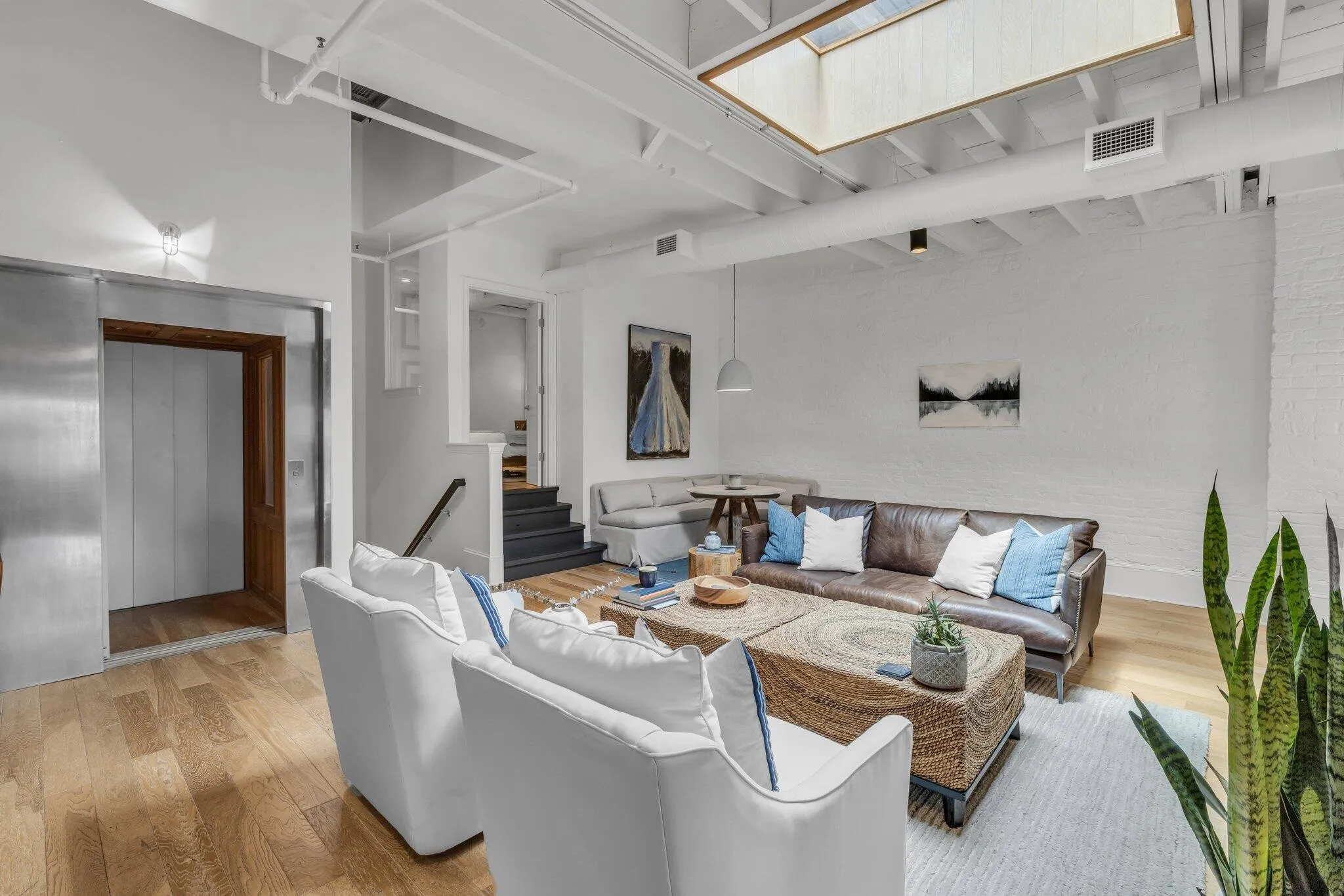 The main living area welcomes you with soaring ceilings, exposed brick walls, and a gas log fireplace, offering warmth and character from the moment you step inside. A skylight above the living room floods the space with natural light, enhancing the open, airy feel. Freshly painted throughout, the home features a clean, modern palette that complements the original architecture.\r\n