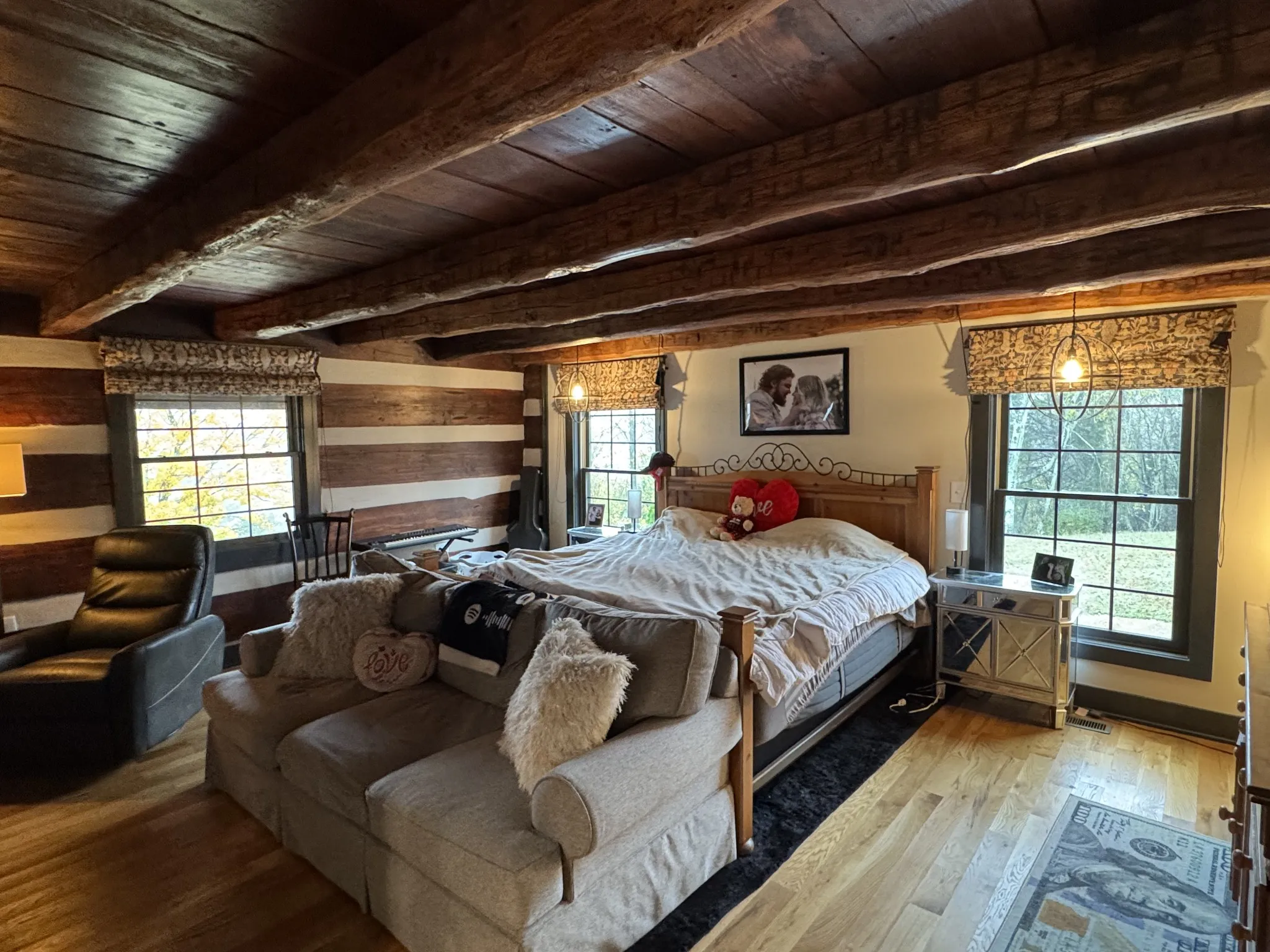 Expanding beyond the original cabin, the home’s centerpiece is a stunning state-of-the-art chef’s kitchen boasting a 10-foot marble island, premium appliances, and a spacious butler’s pantry. The primary suite offers a spa-like escape with a fabulous copper soaking tub and a walk-through marble rain shower. Upstairs, you’ll find additional bedrooms and a guest suite, all designed with comfort and style in mind.
