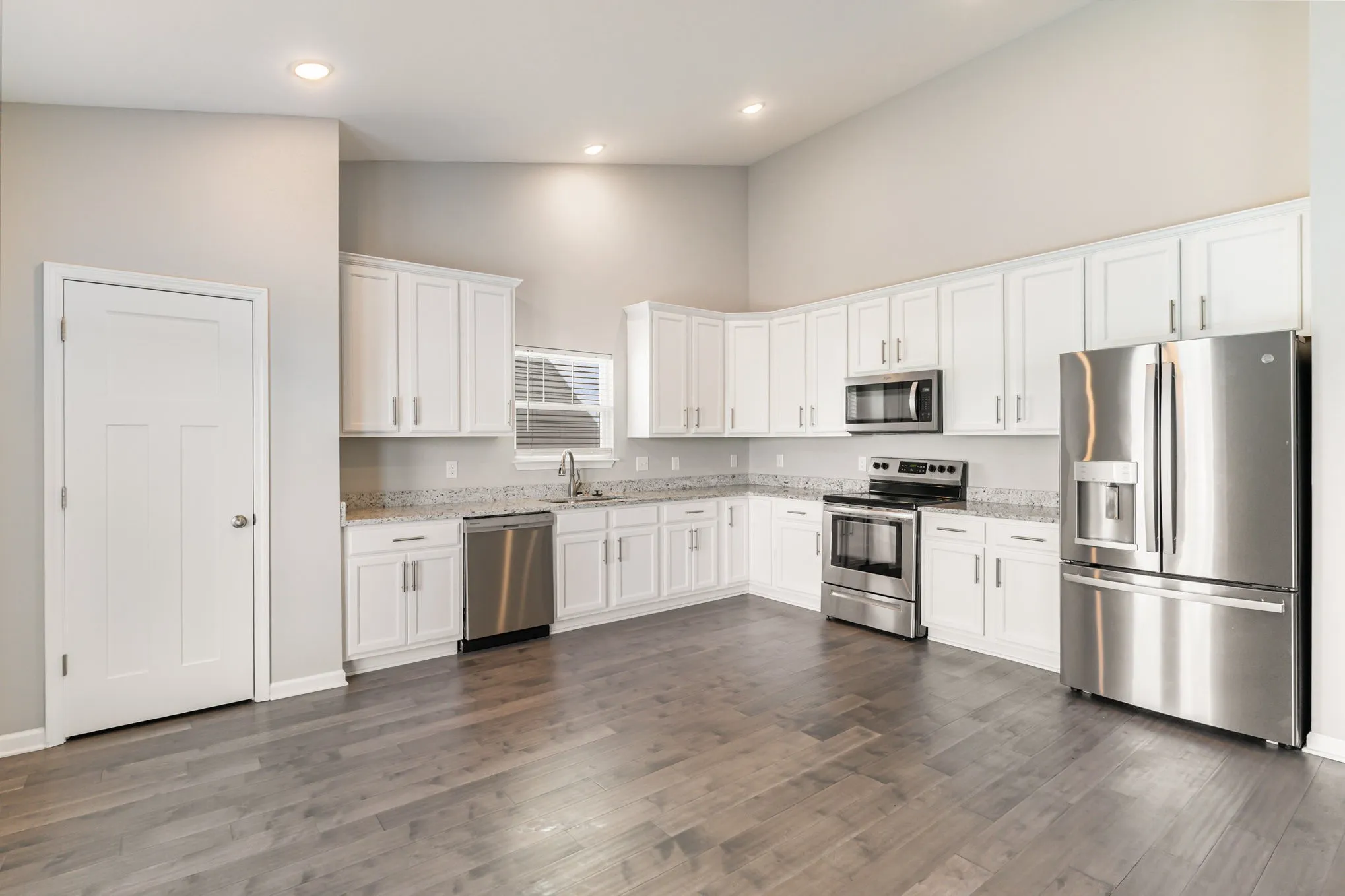 kitchen featuring stainless steel appliances and granite countertops throughout. A rear