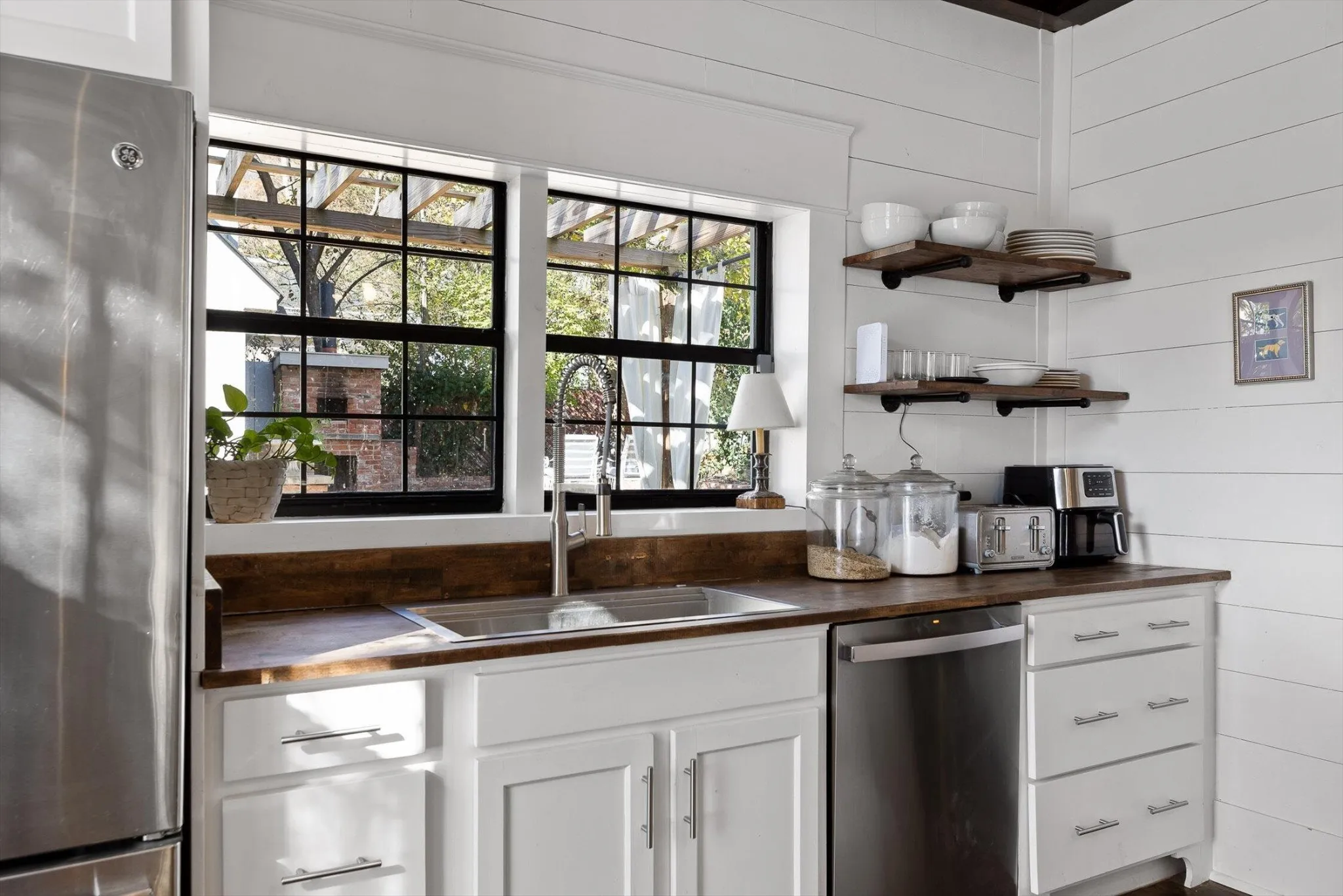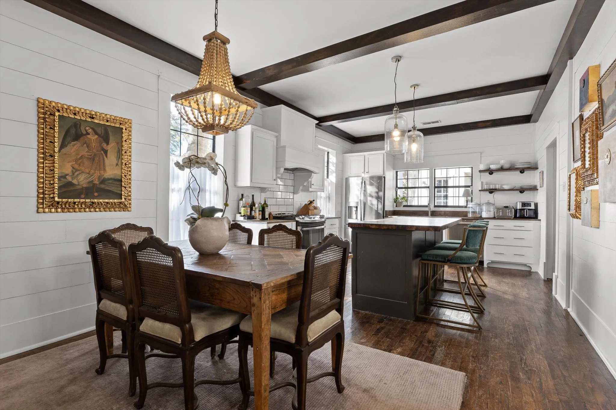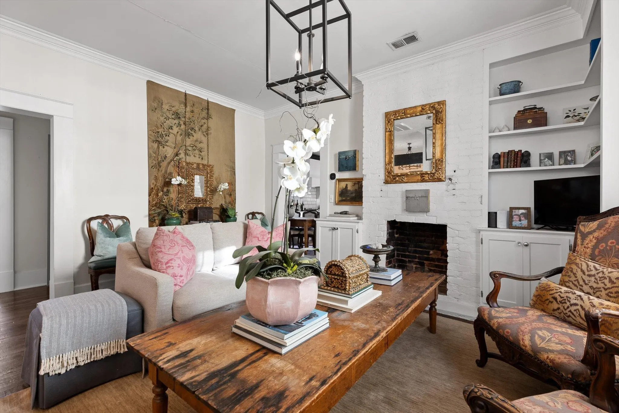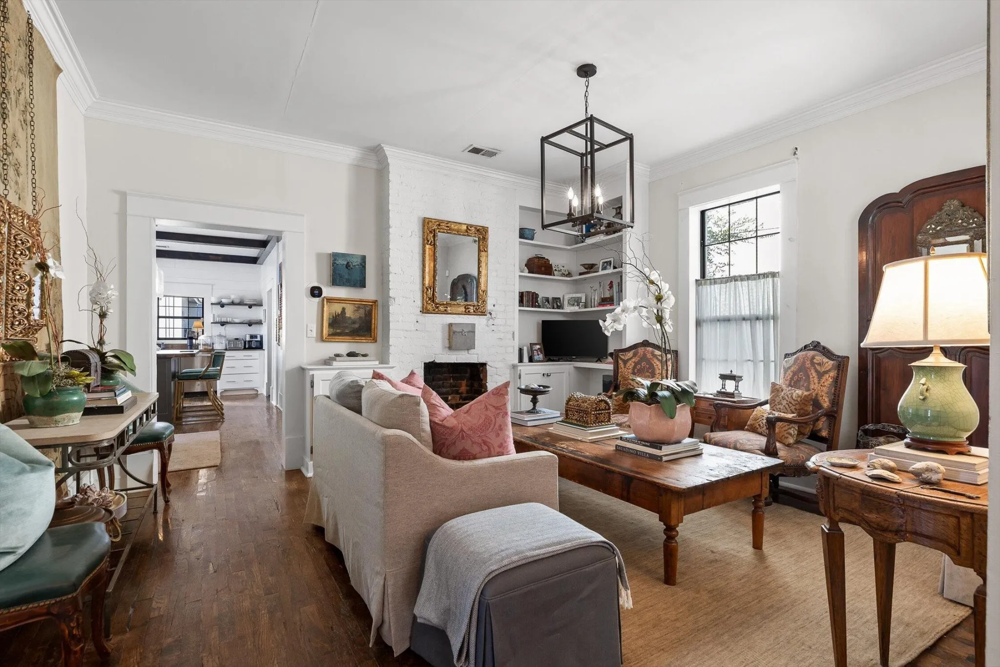 The main house features thoughtfully updated spaces that maintain the home’s historic integrity: 2 bedrooms, and 2 fully updated bathrooms including tiled showers. The kitchen provides a spacious environment for baking or entertaining, featuring custom cabinetry, gas range, floating shelves, ample countertop space, and a large island.