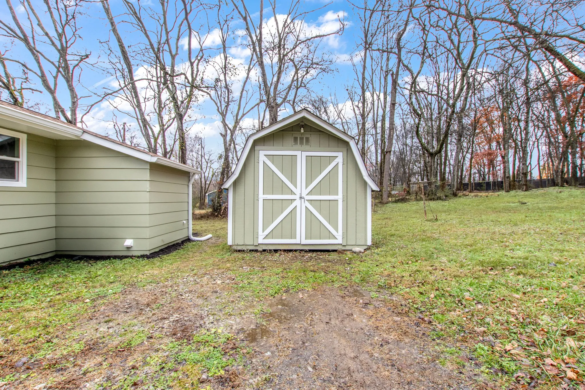 The exterior includes a freshly painted storage shed for tools and equipment.