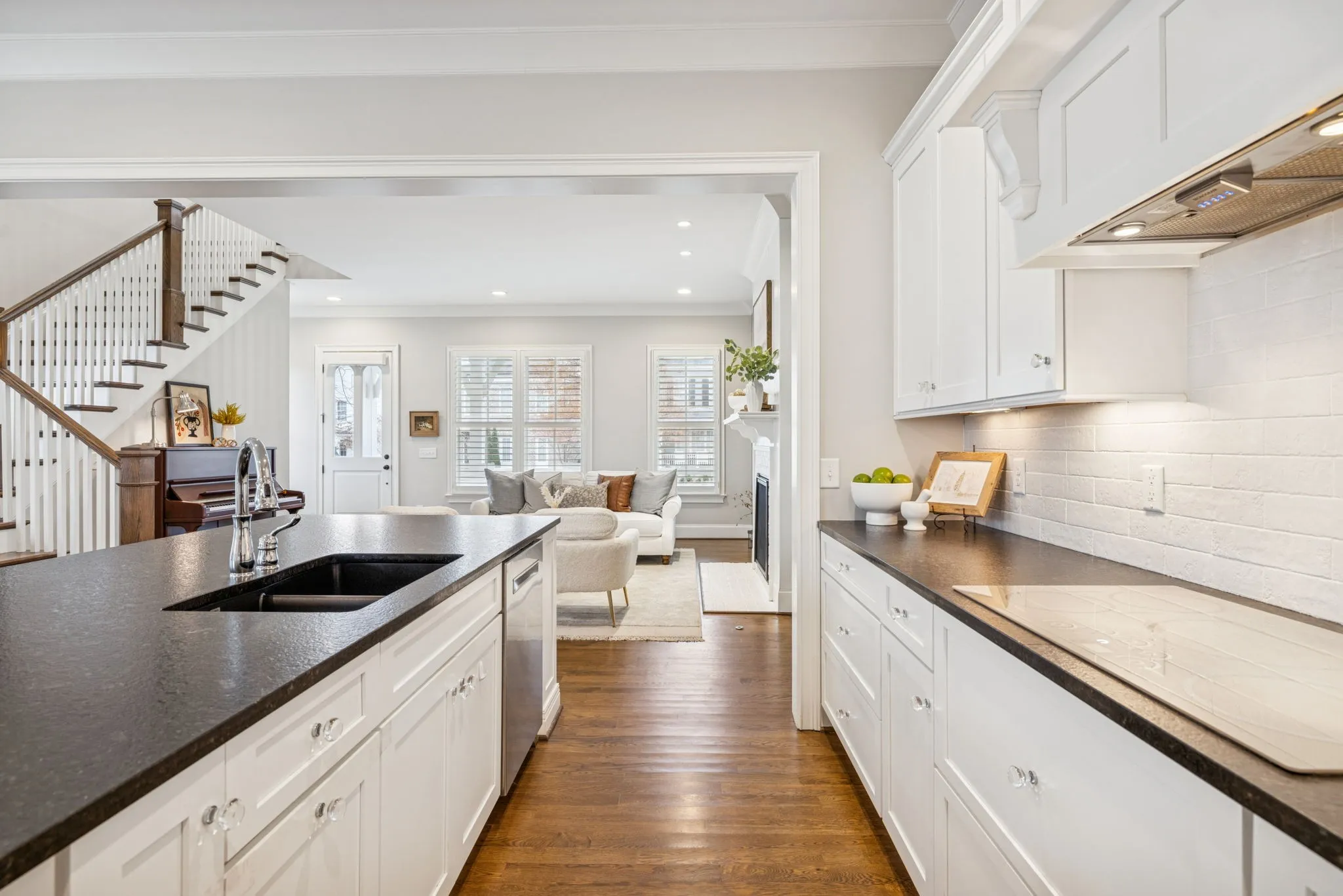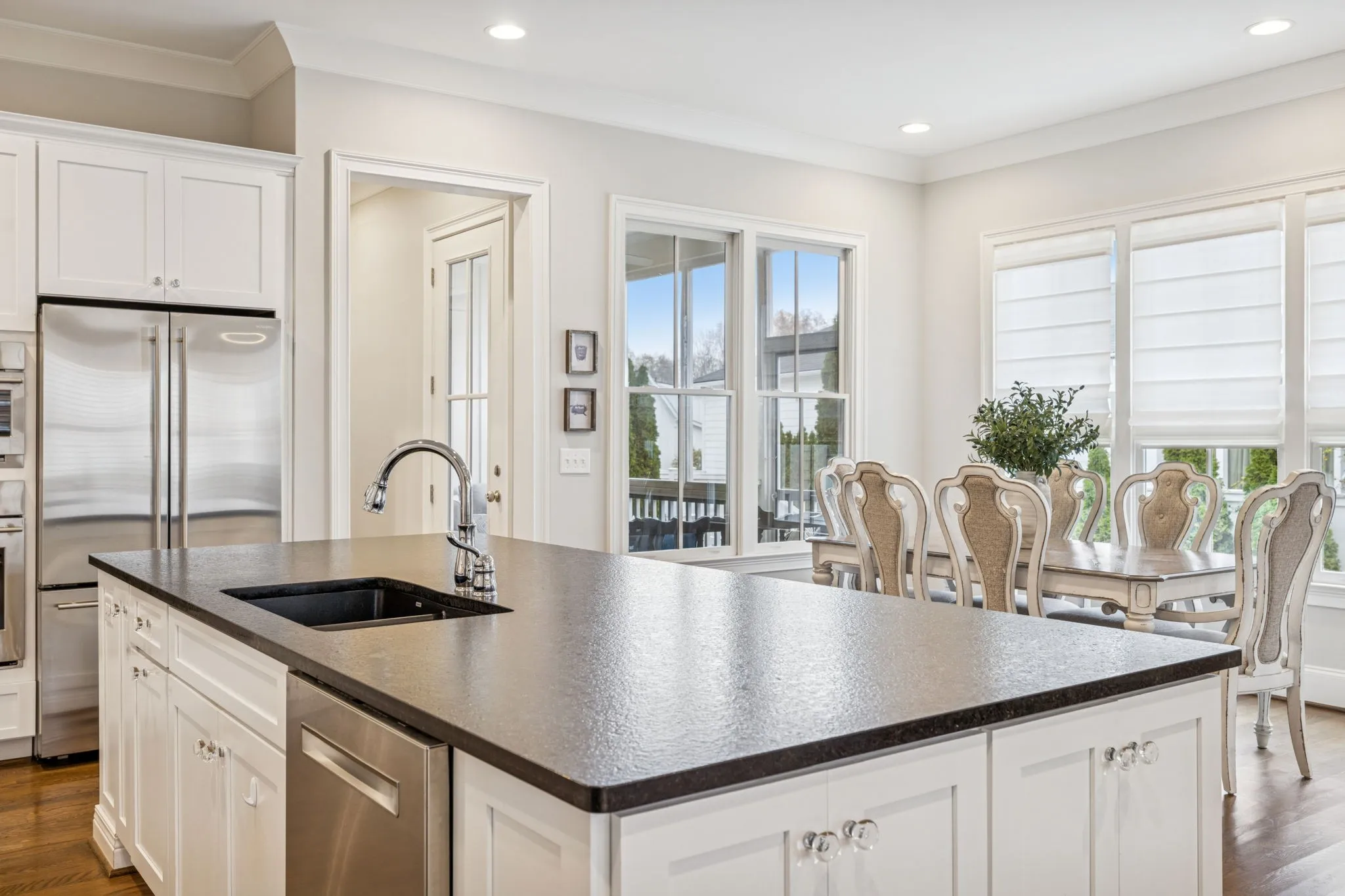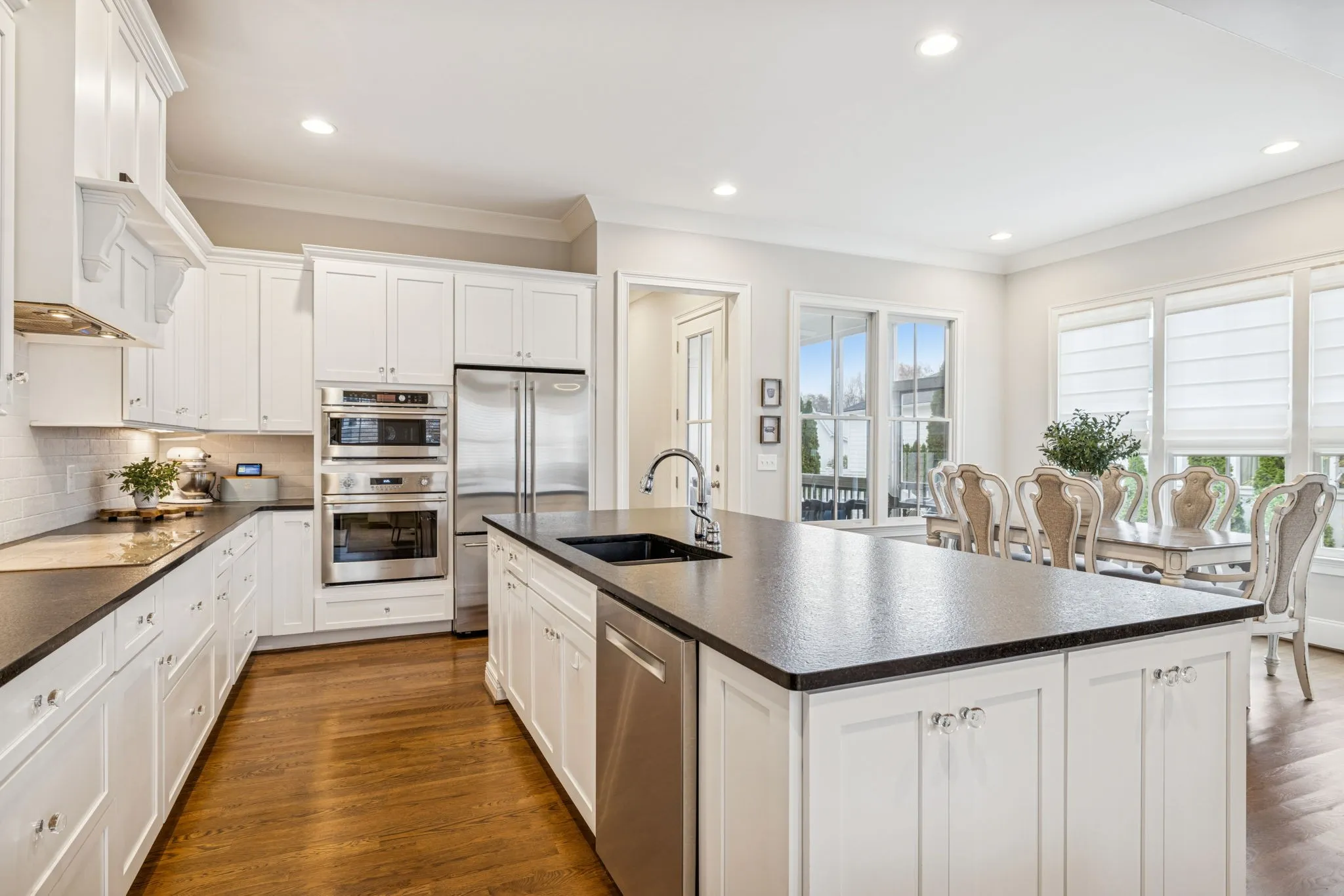 • Designer Kitchen & Bath: Custom kitchen designed by an independent designer, featuring Monogram appliances—including an induction cooktop and built-in double ovens and Blanco sink.