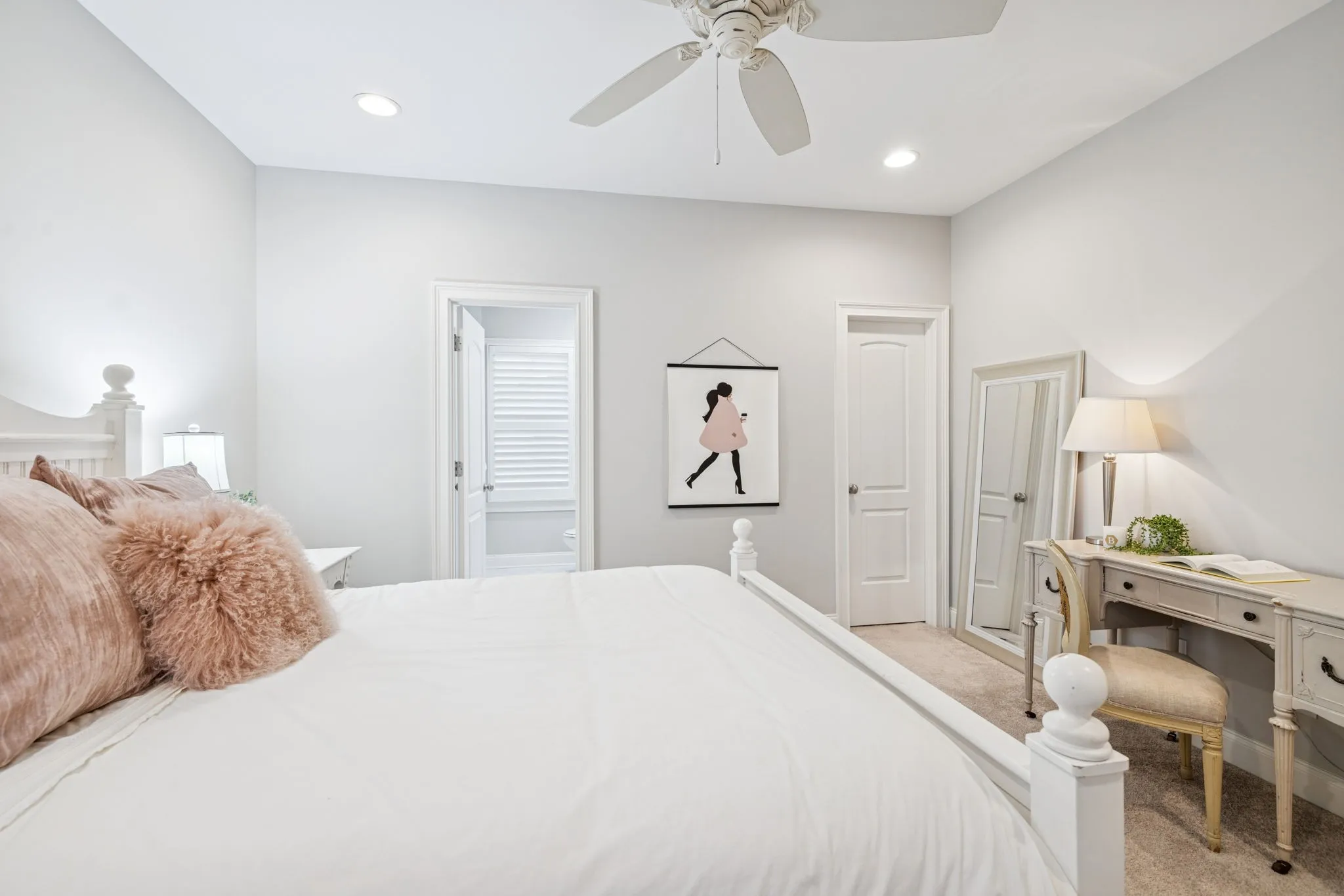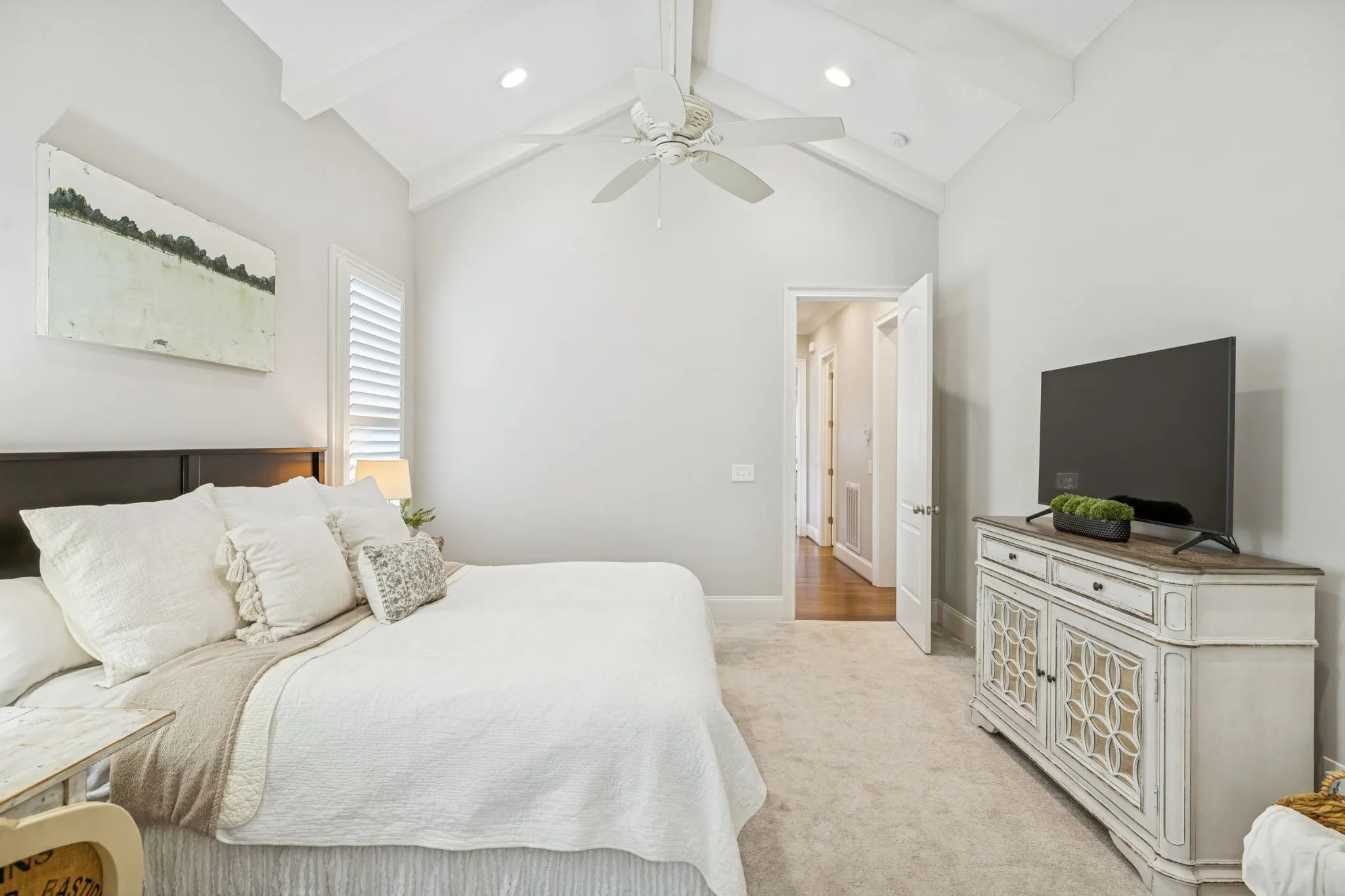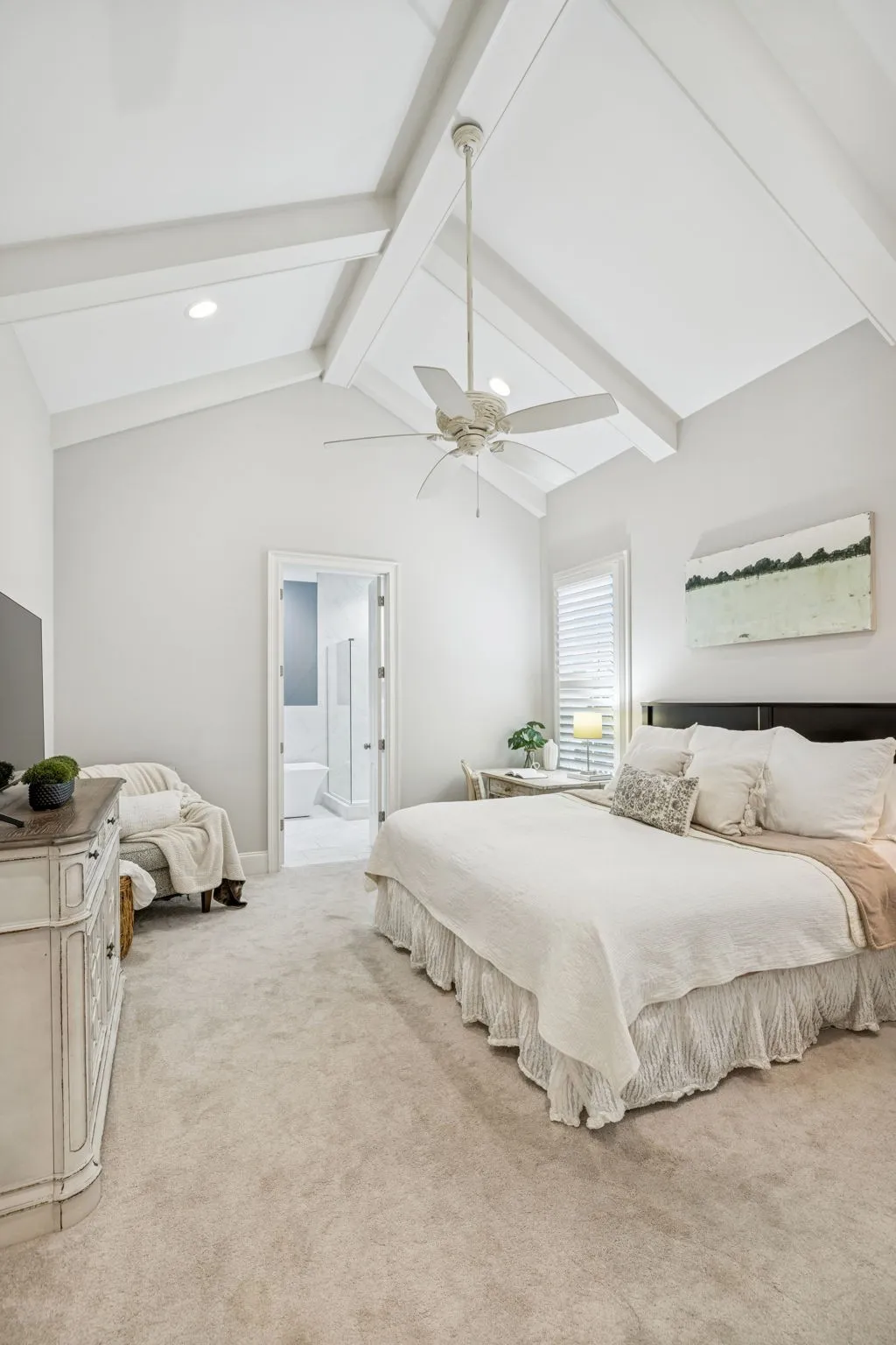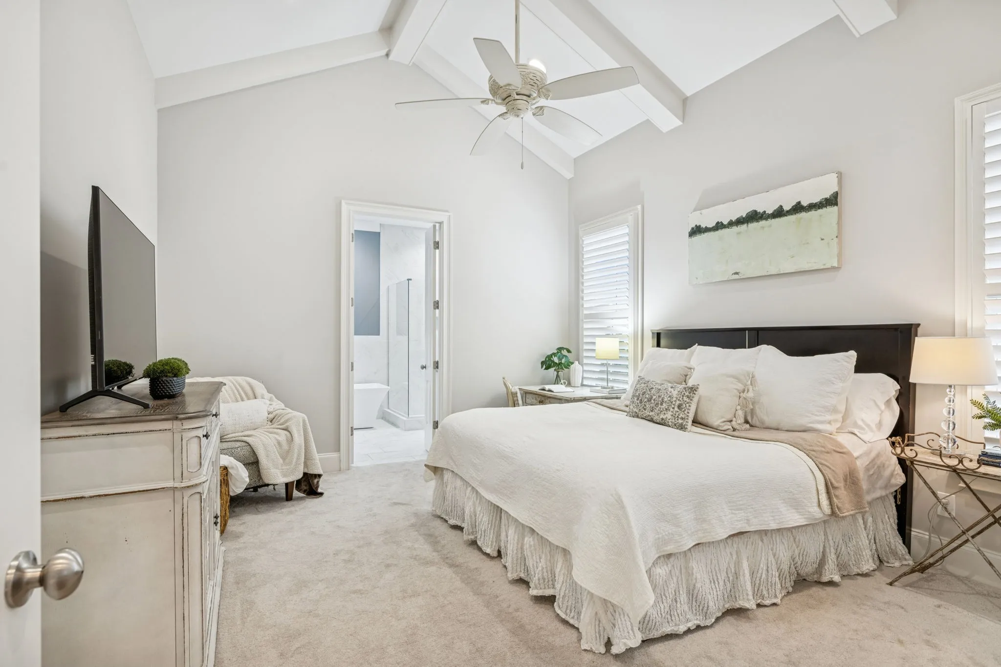 • Primary Suite Retreat: The main-floor primary bedroom boasts a vaulted ceiling with beams, a luxurious bath also custom designed with extra built-in cabinetry. All closets are professionally built out by California Closets.