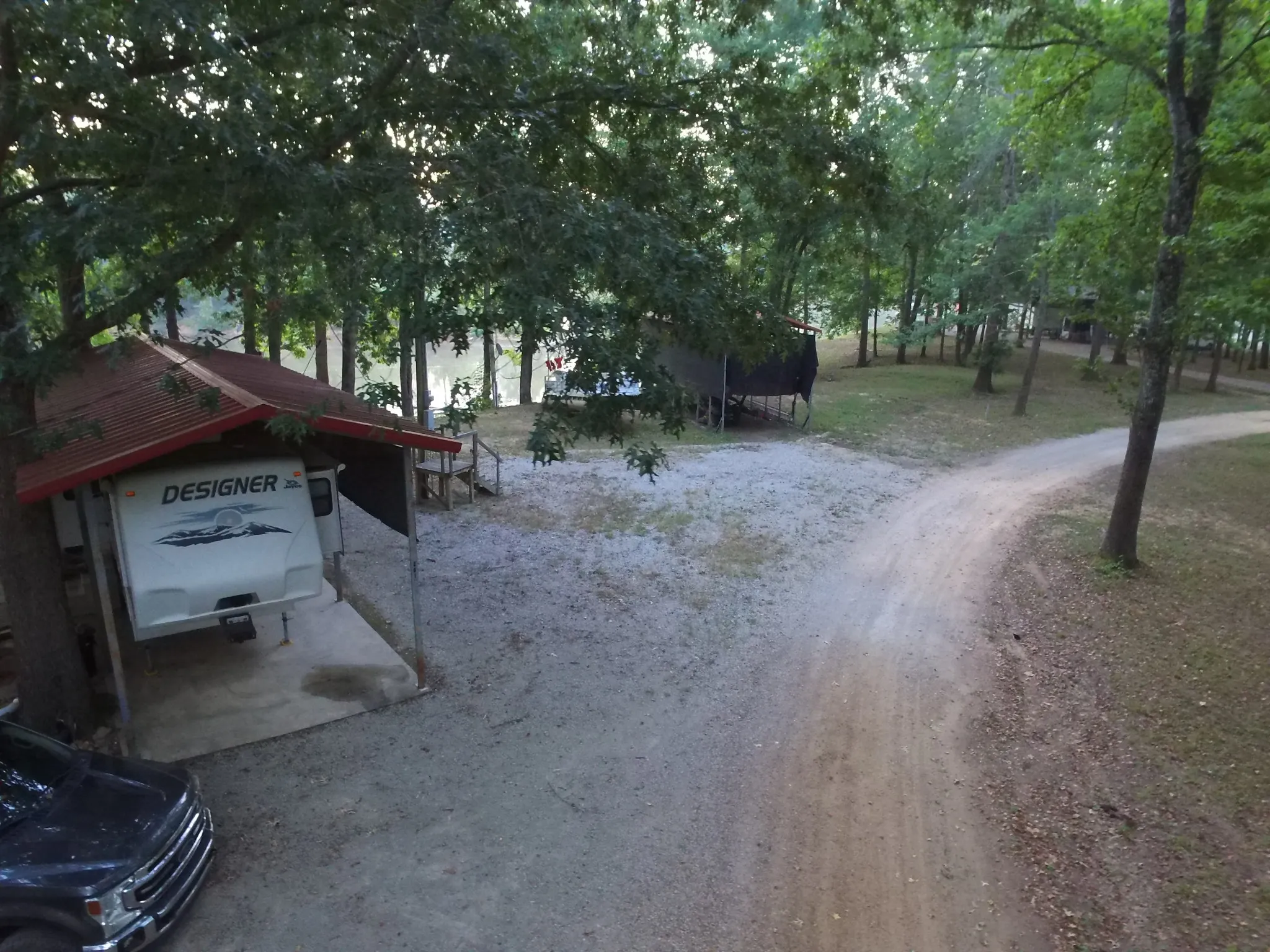 Large gravel parking area for boats, trailers, guests