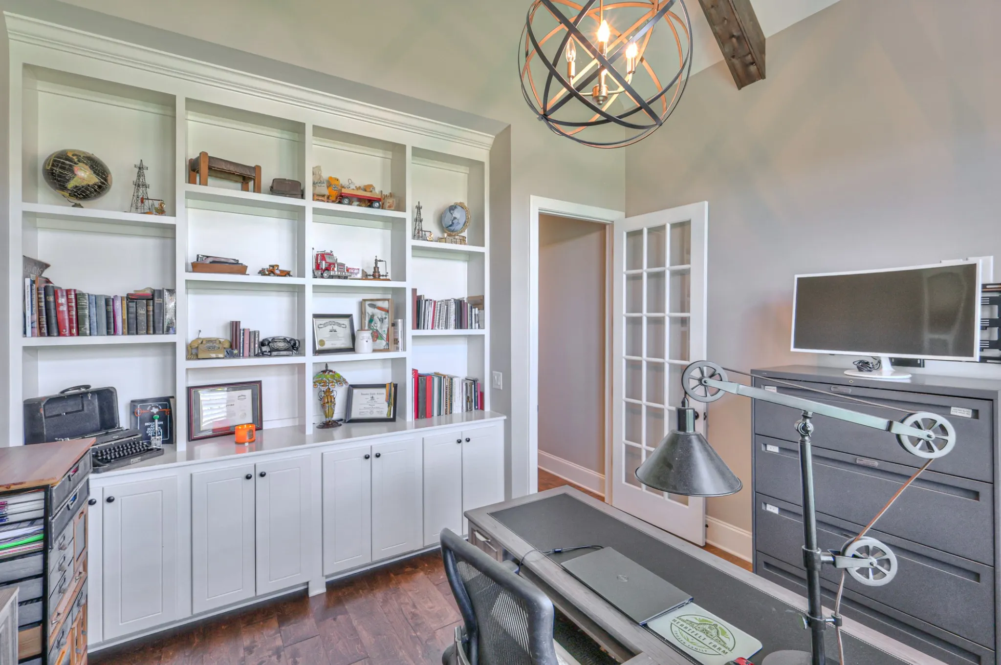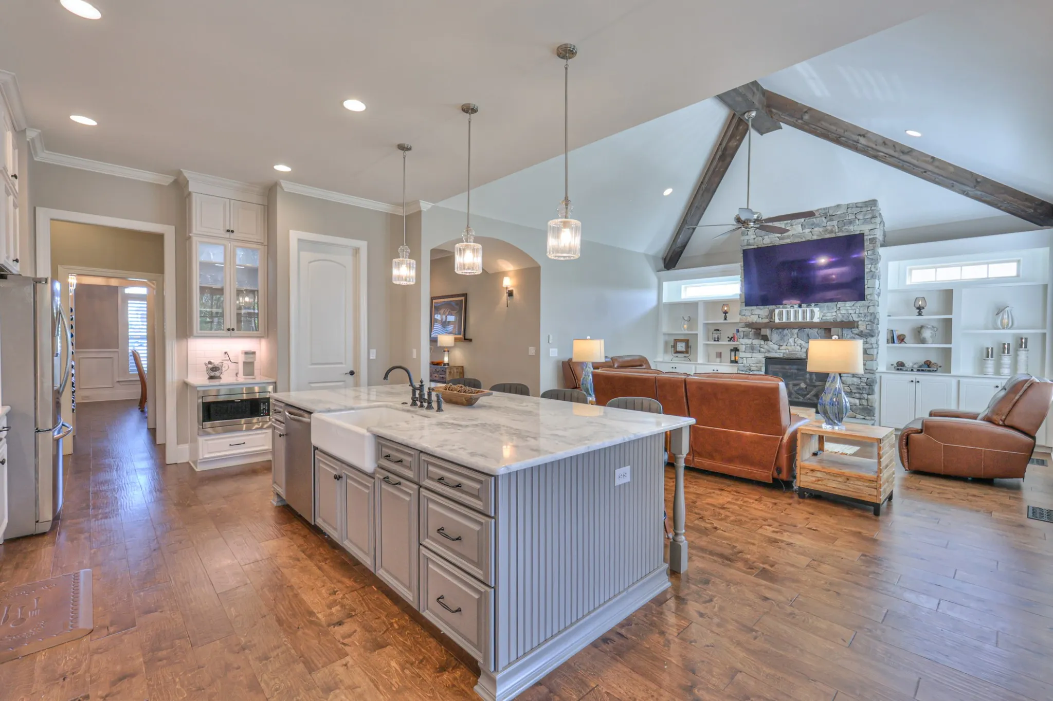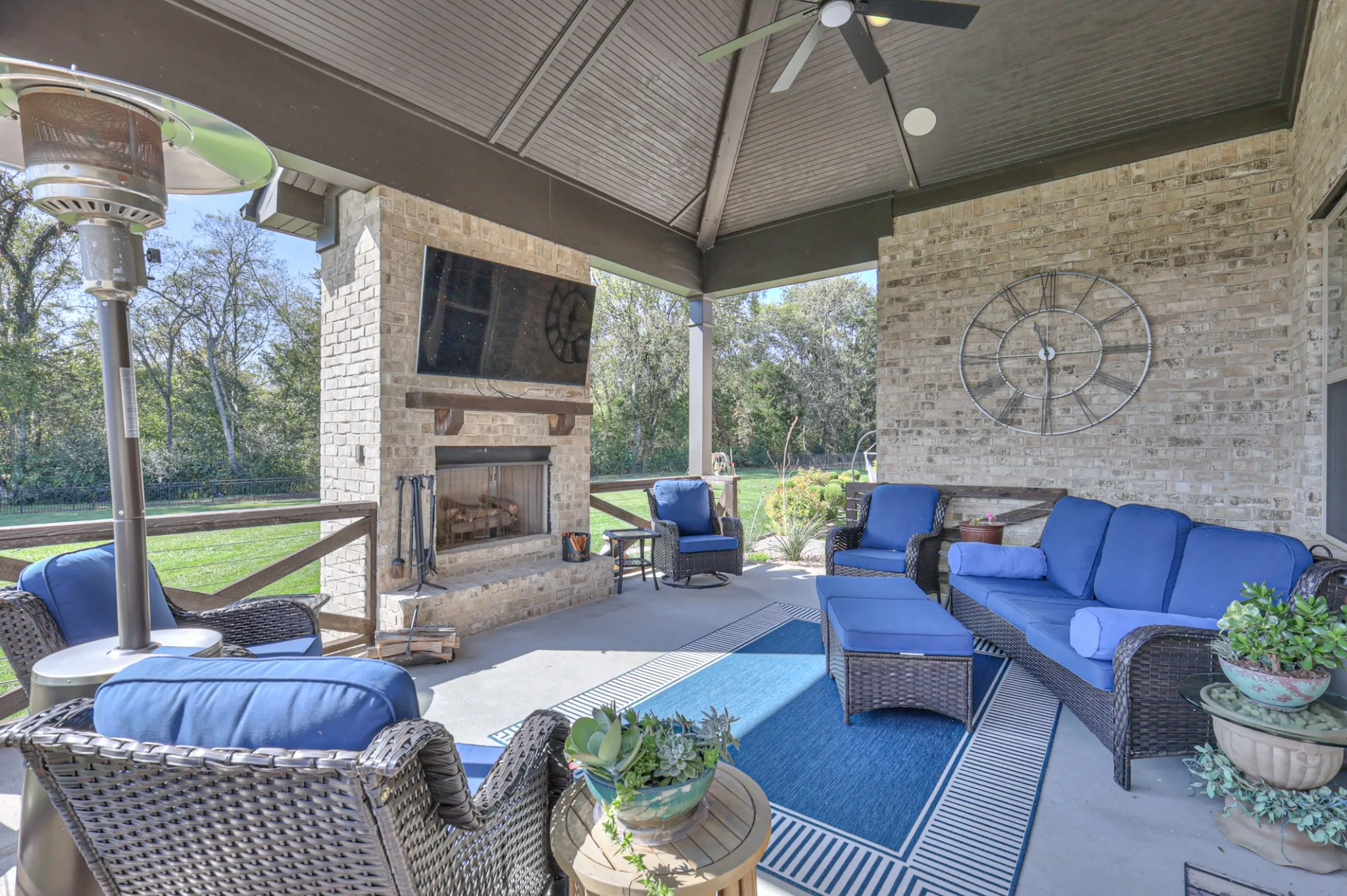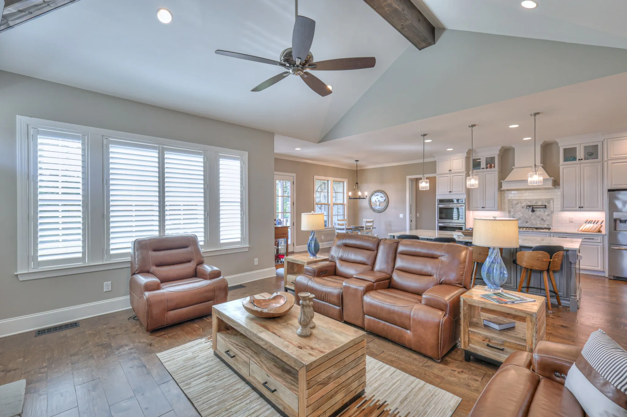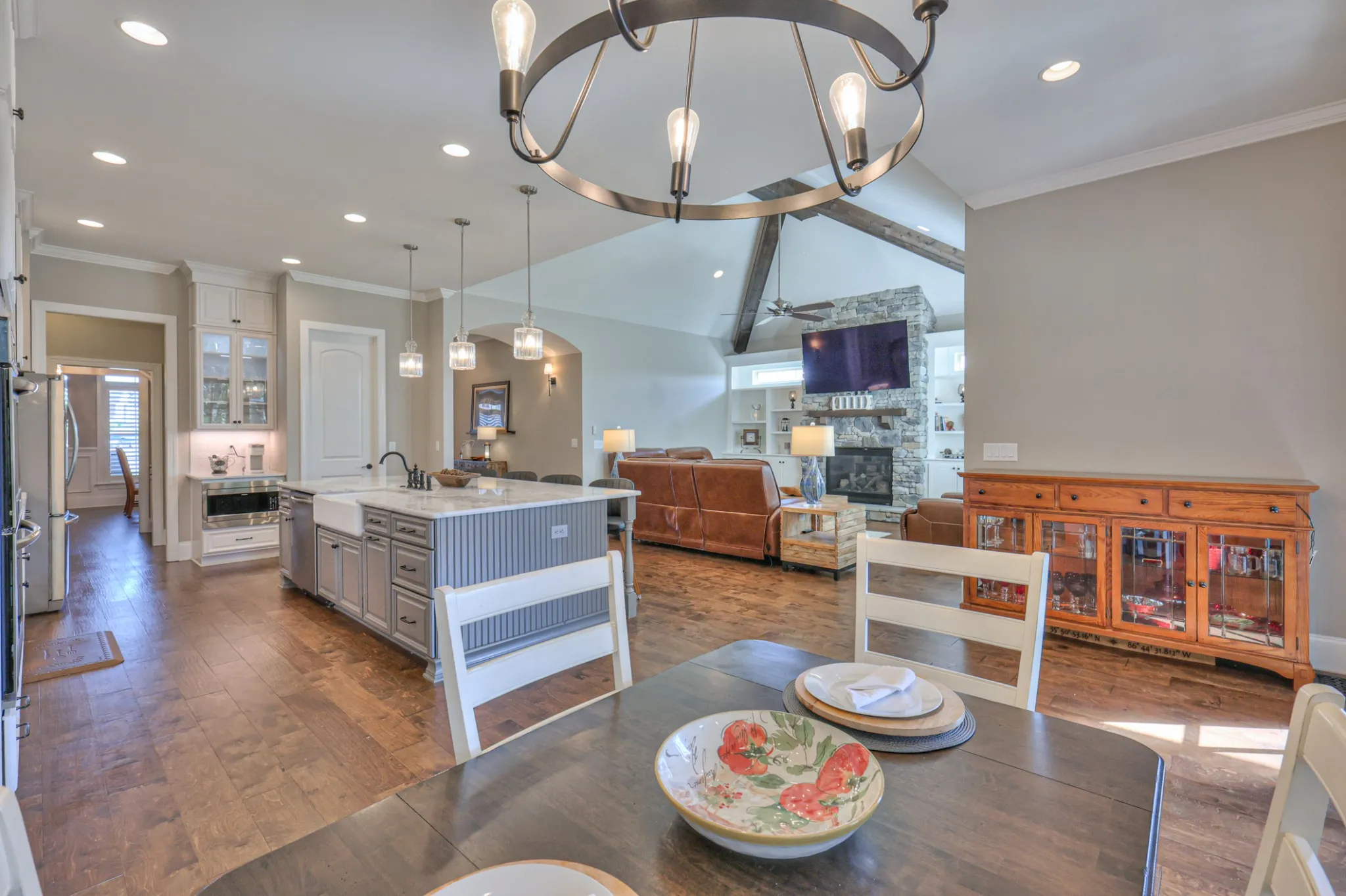Experience luxury living at its finest in this beautifully upgraded home set on a private acre lot. Thoughtfully designed with high-end finishes throughout, this residence offers both elegance and functionality. The vaulted ceiling with striking accent beams creates a stunning focal point in the main living area, complemented by one of the home’s two fireplaces. A formal dining room showcases a gorgeous coffered ceiling, perfect for hosting gatherings with style.
