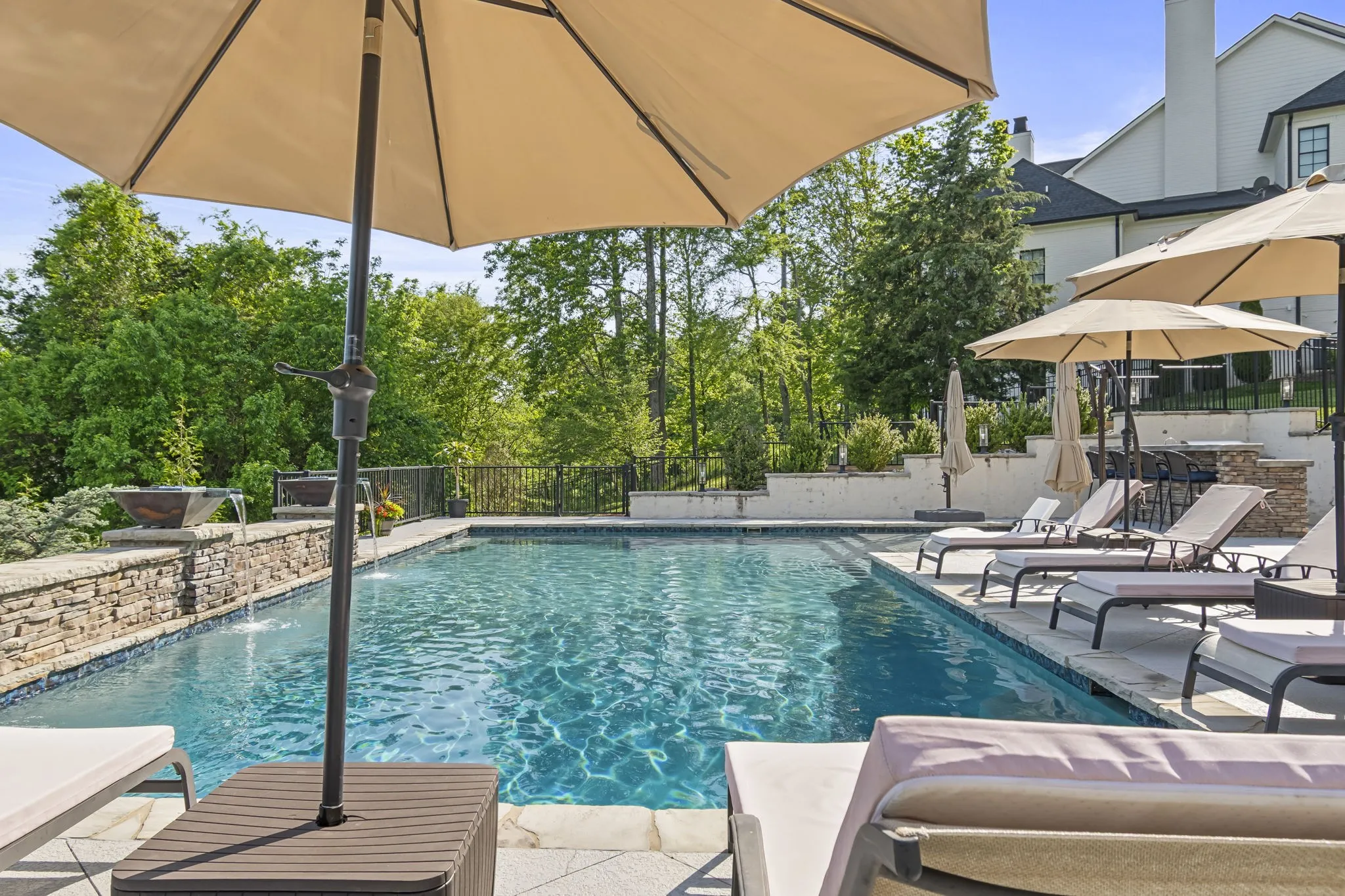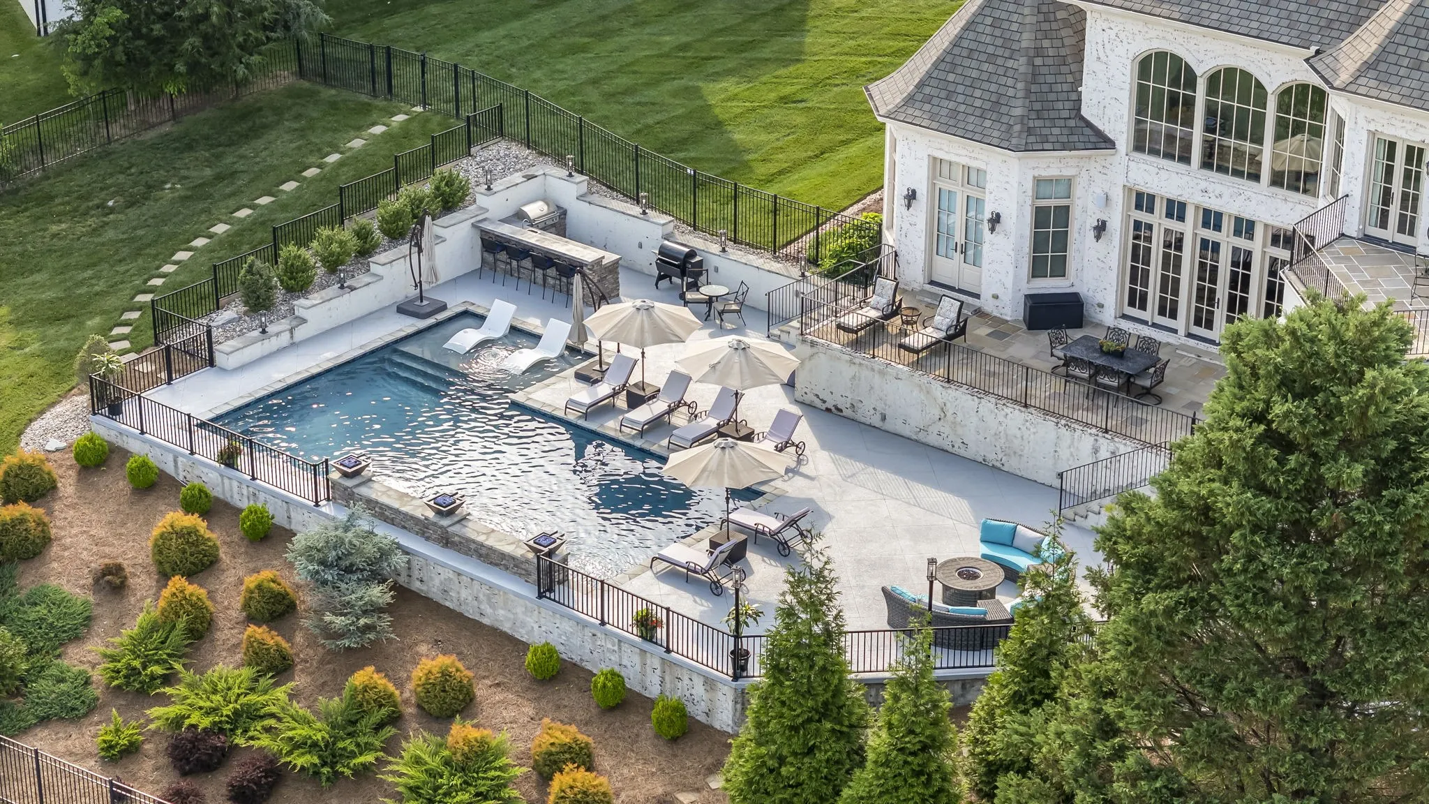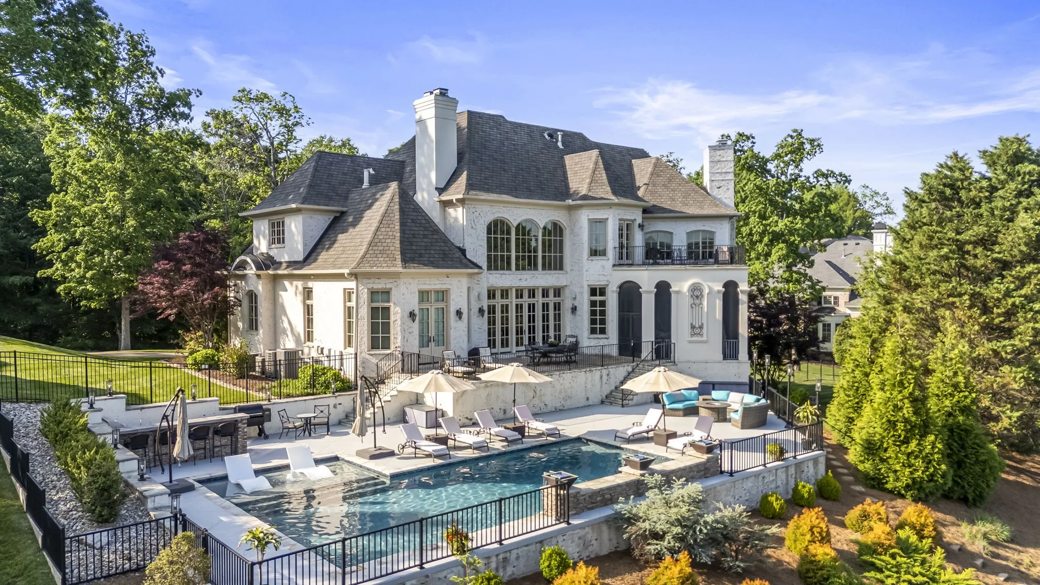 The chef’s kitchen features professional-grade appliances, Taj Mahal quartzite counters, custom cabinetry, an Archistone range hood, and generous island seating. The great room extends the entertainment space and includes another gas log fireplace. The primary suite offers privacy and sophistication with its Archistone fireplace, double French doors to the terrace, spa bath, and custom closets.\n