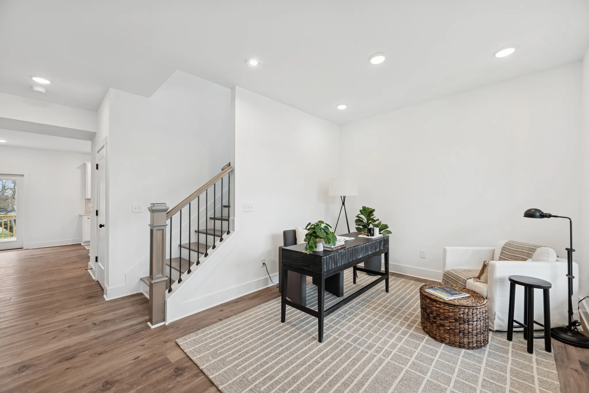Step into a spacious foyer that opens to a flexible study or formal dining room, ideal for hosting or working from home. The open-concept kitchen and living area features quartz countertops, upgraded cabinetry, and a layout that easily accommodates a second dining space. A large walk-in pantry, under-stair storage, and a mudroom off the garage add everyday convenience and keep clutter out of sight.