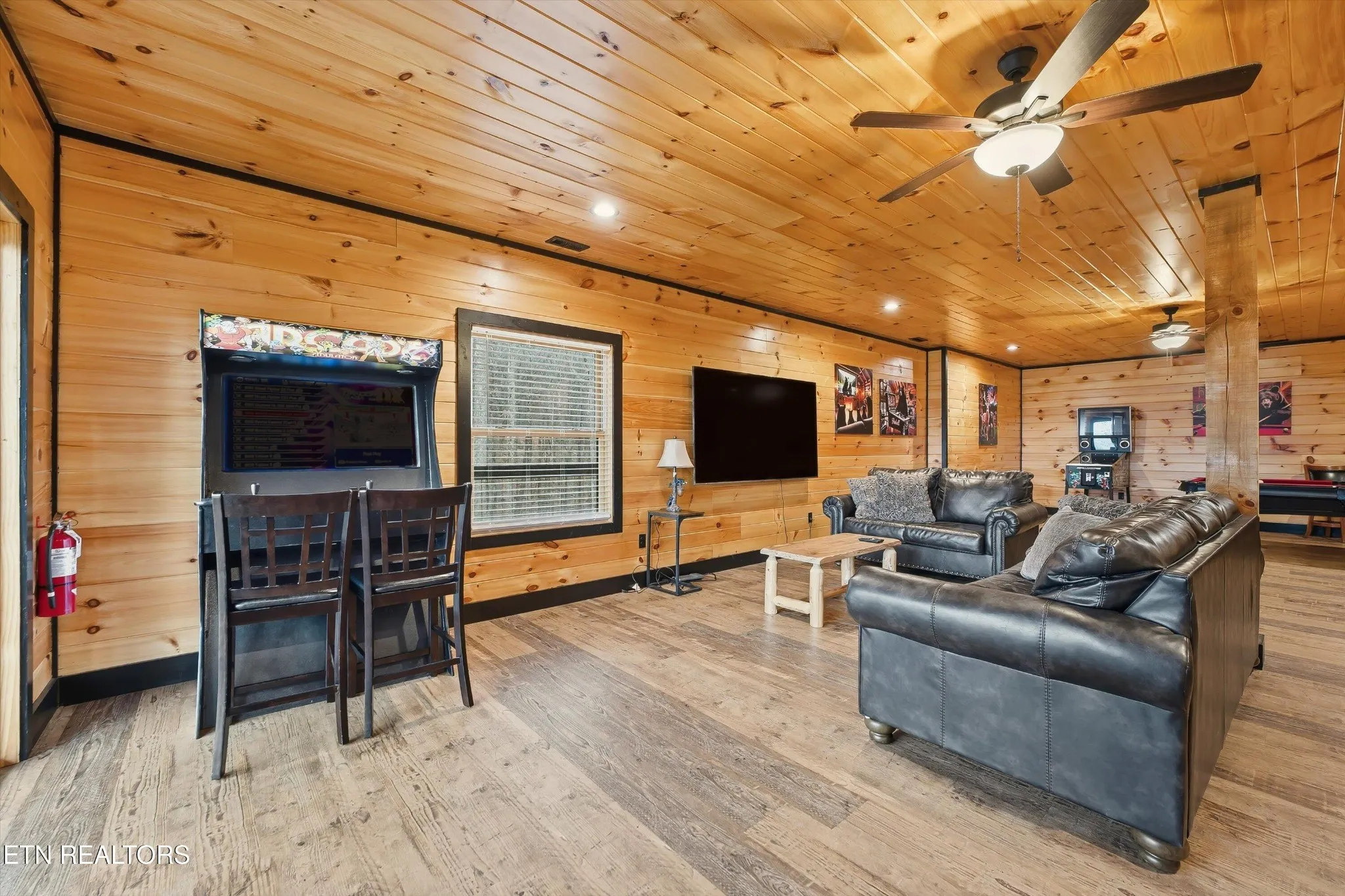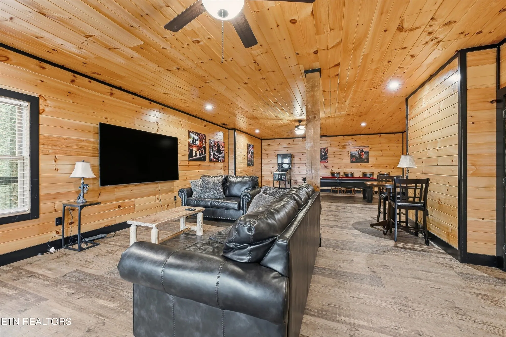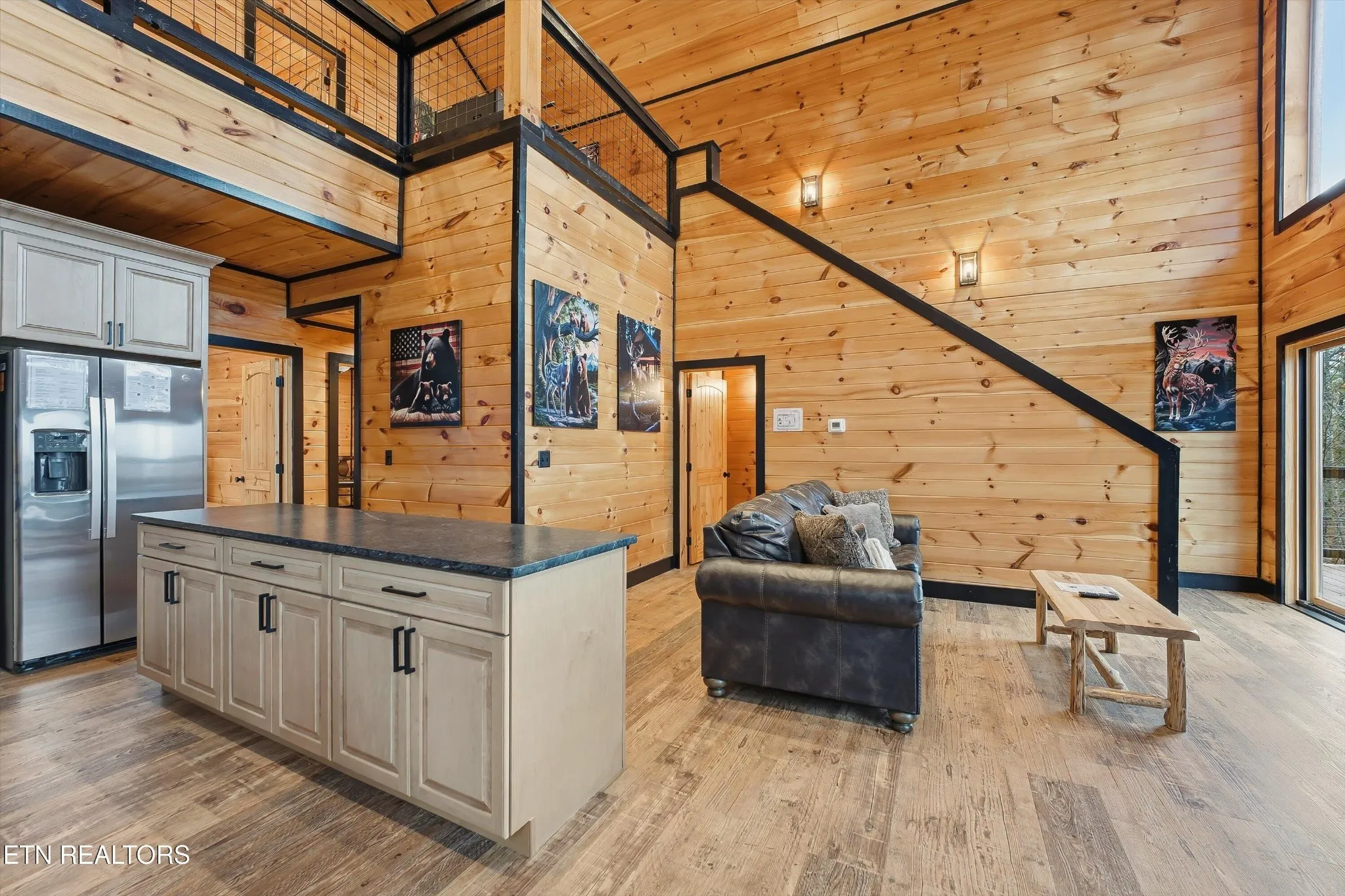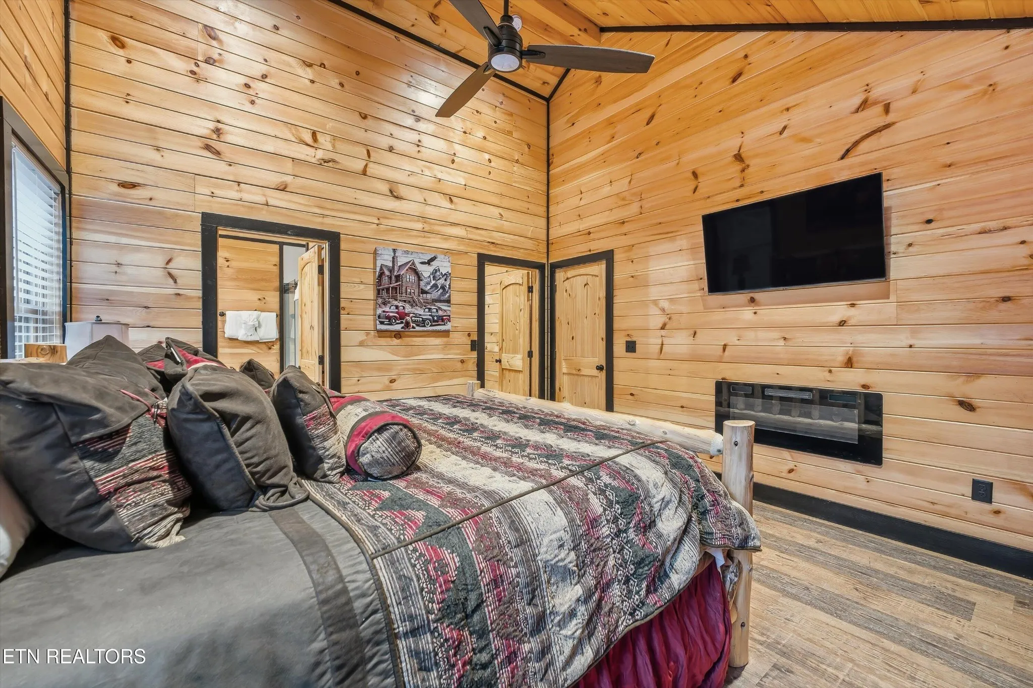 Inside, luxury vinyl plank flooring flows throughout, complemented by warm wood walls and ceilings with sleek black accents that balance a cozy rustic feel with contemporary touches. The living room features vaulted ceilings, abundant natural light, and a fireplace—perfect for relaxing while taking in the spectacular scenery. The primary bedroom also boasts its own fireplace, creating a warm, intimate retreat.