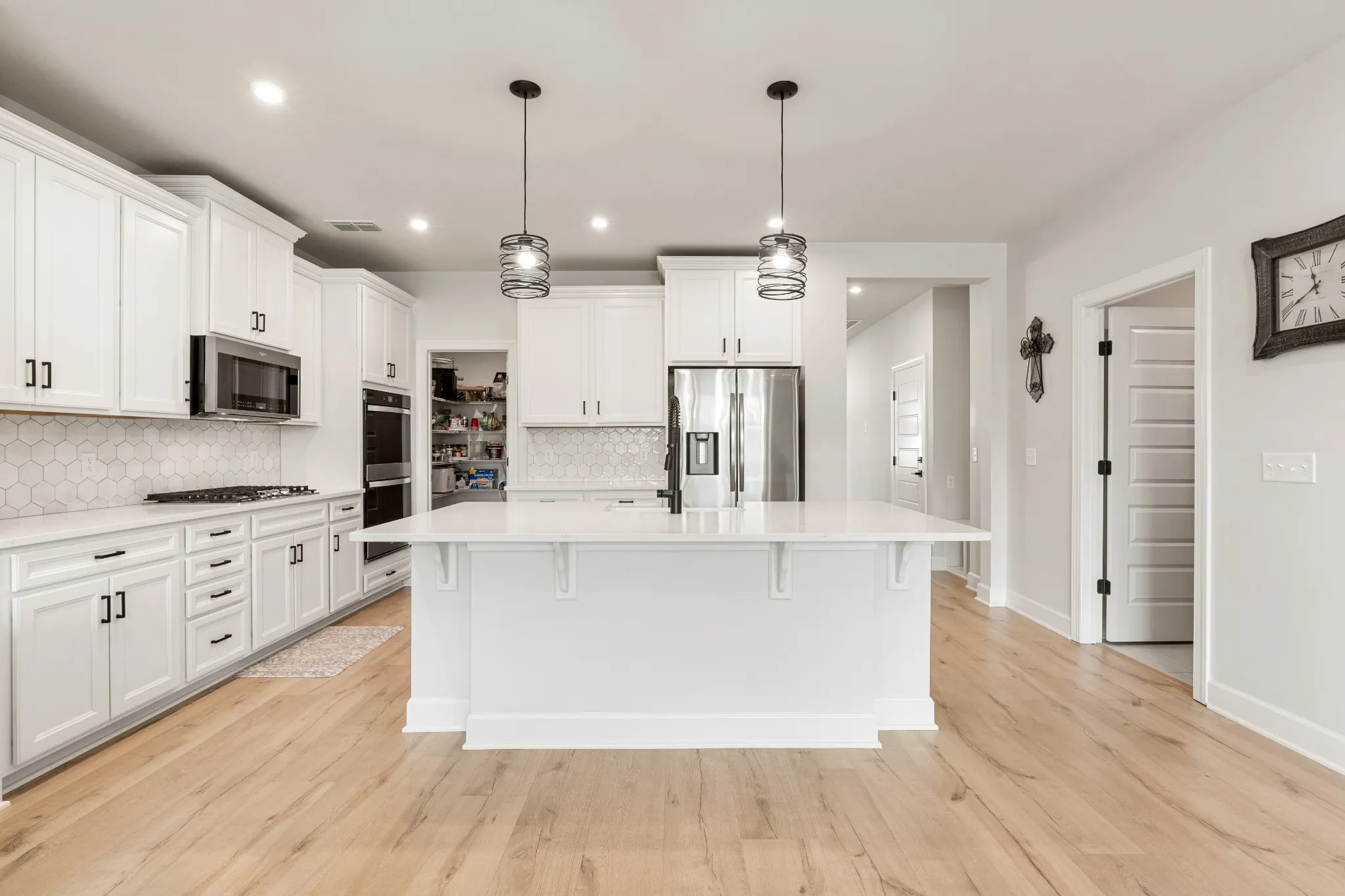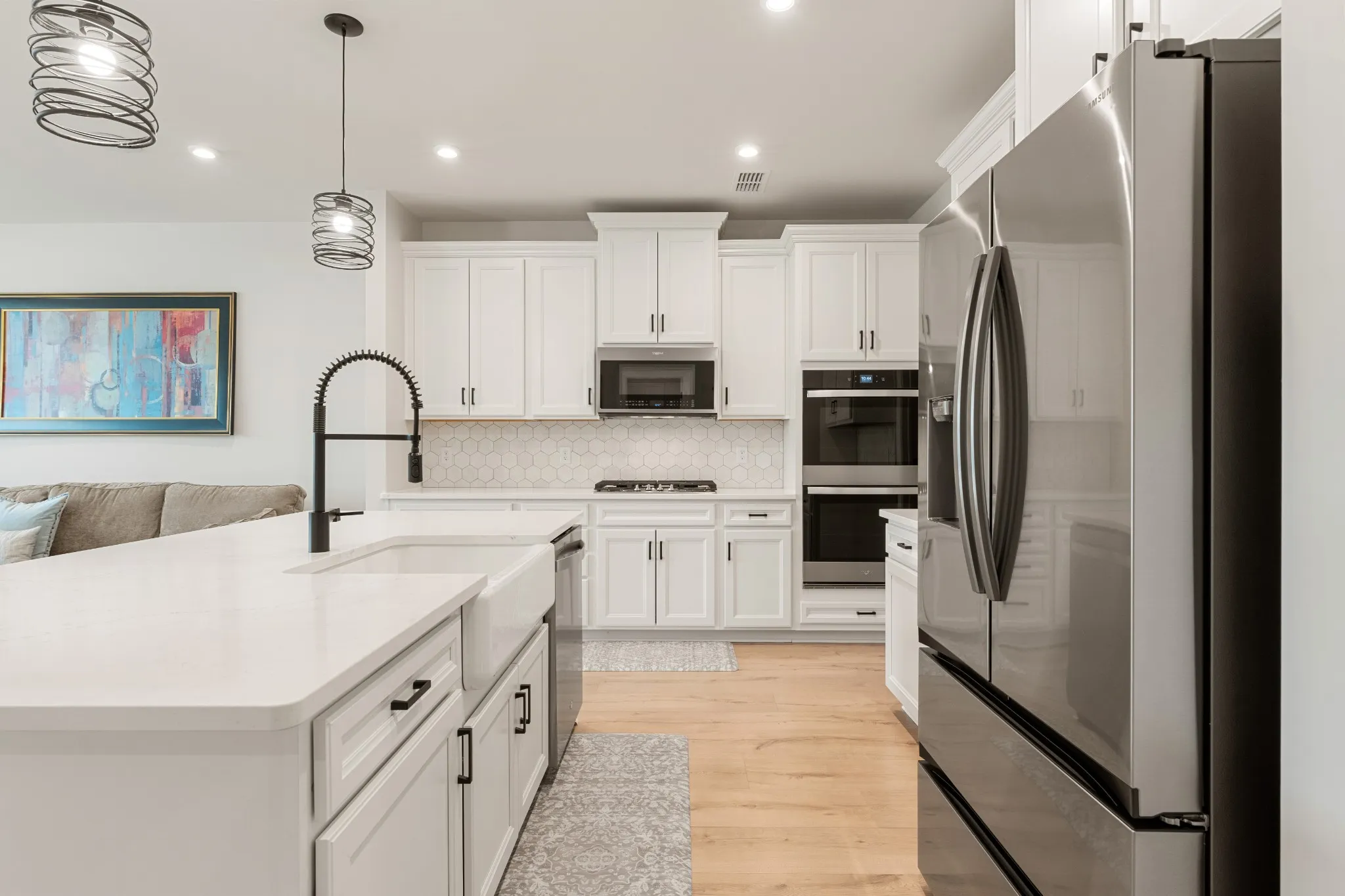 • Modern kitchen featuring quartz countertops, white cabinetry, farmhouse sink, gas range, double ovens, and large center island