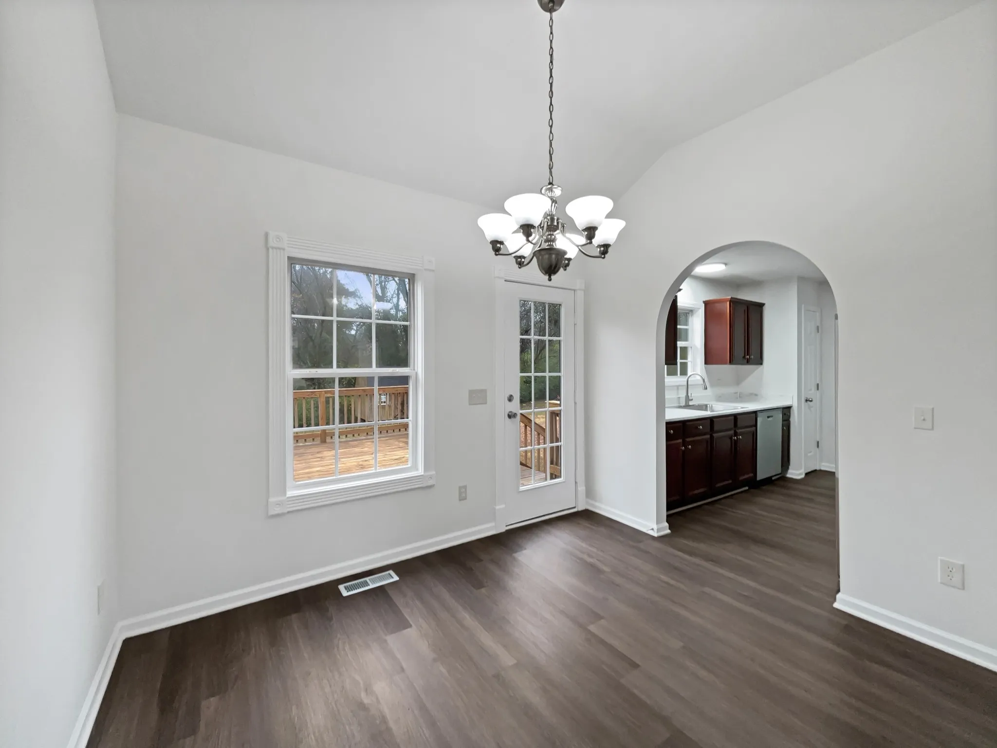 architectural arches and beautiful flooring throughout. The kitchen comes complete with