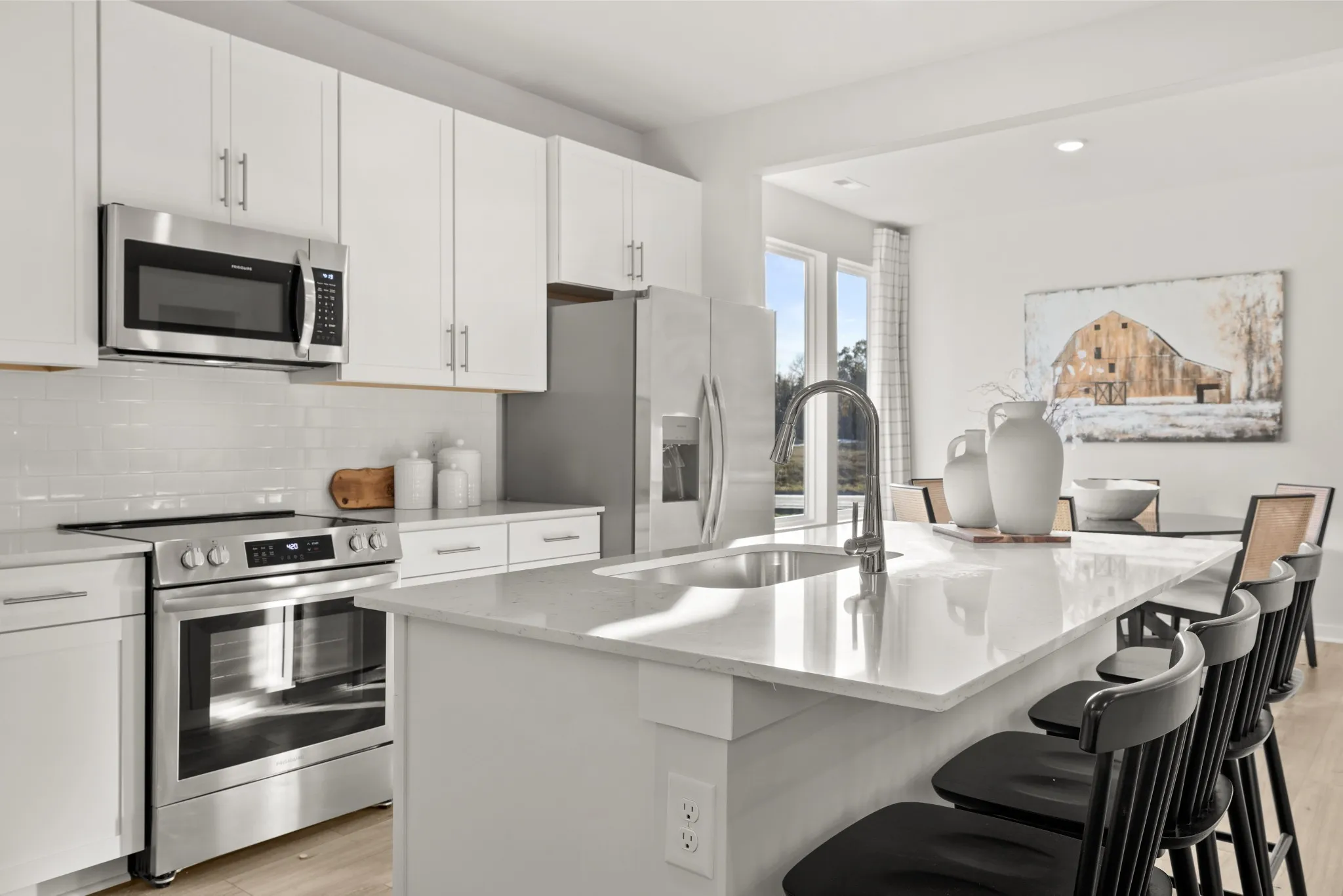 LOT #70 – Mayflower floorplan. The heart of this two-story home is the open family room, kitchen and dining room on the first level. The first floor is also host to a convenient office and a bedroom perfect for overnight guests. Upstairs, three more bedrooms and a loft offer extra living space on the second floor. *Images from a furnished model of this home. Actual configuration and features may vary.