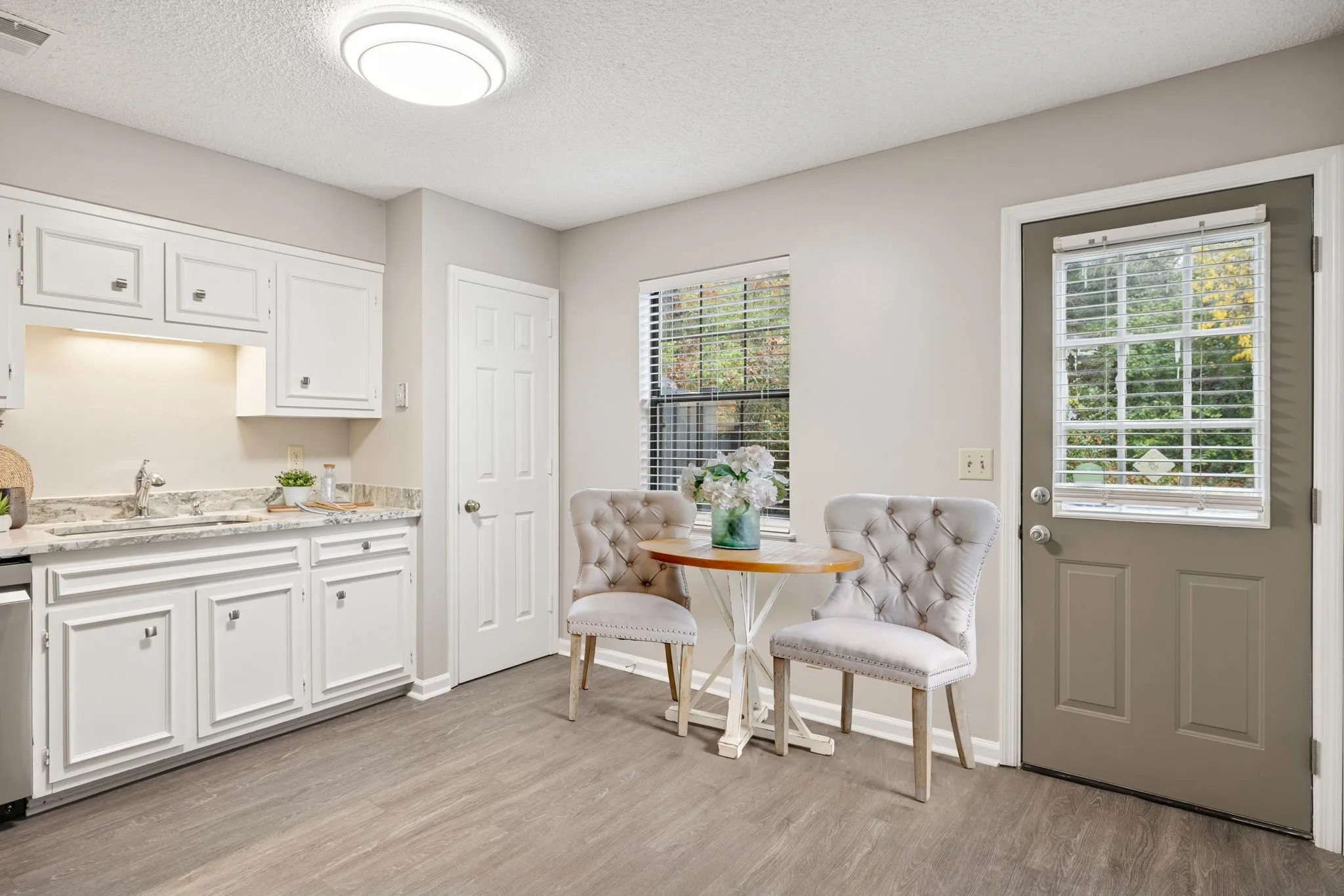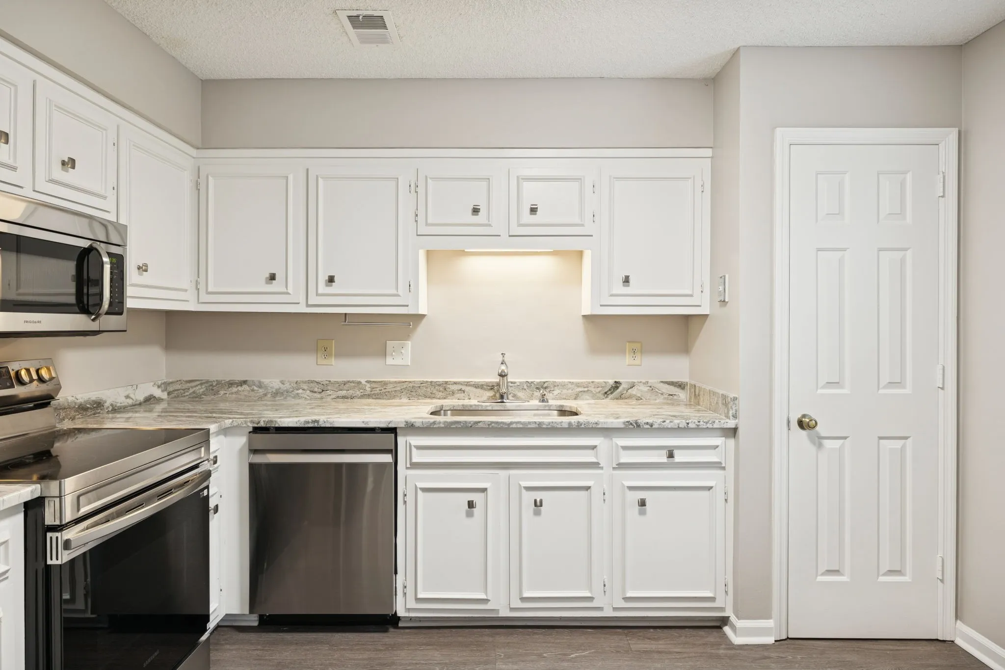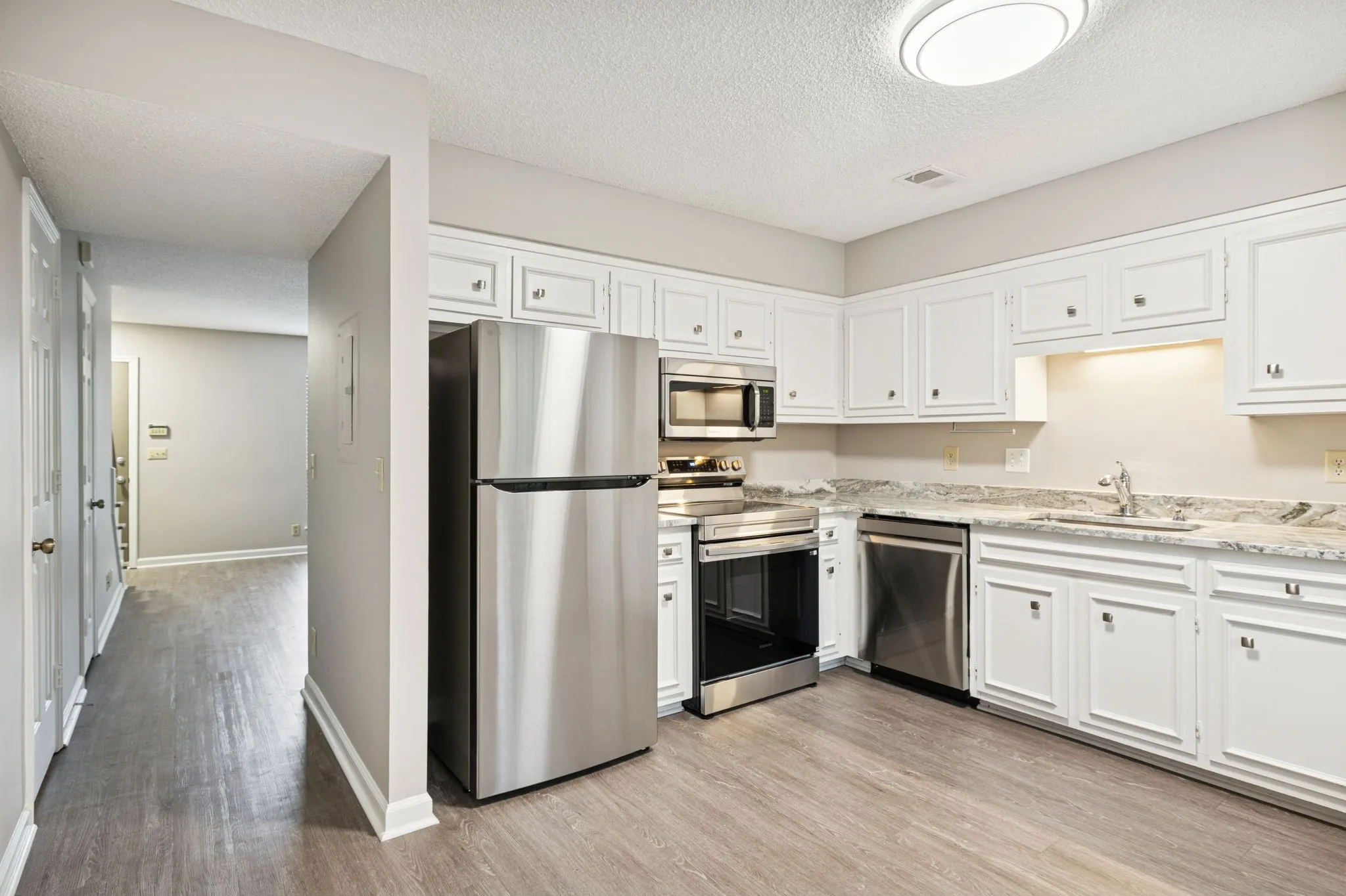 Absolutely phenomenal location with super quick access~brand new granite in kitchen (2025)~large sink~HVAC+water heater replaced in 2019~brand new paint (2025)~newer LVP flooring throughout~newer refrigerator (2024)~new dishwasher+range (2025), newer fixtures throughout~built in desk nook~great, private location right across from greenspace and backs to trees~freshly cleaned carpet on the steps~renovated full bath, newer toilets. This one is ready to go!