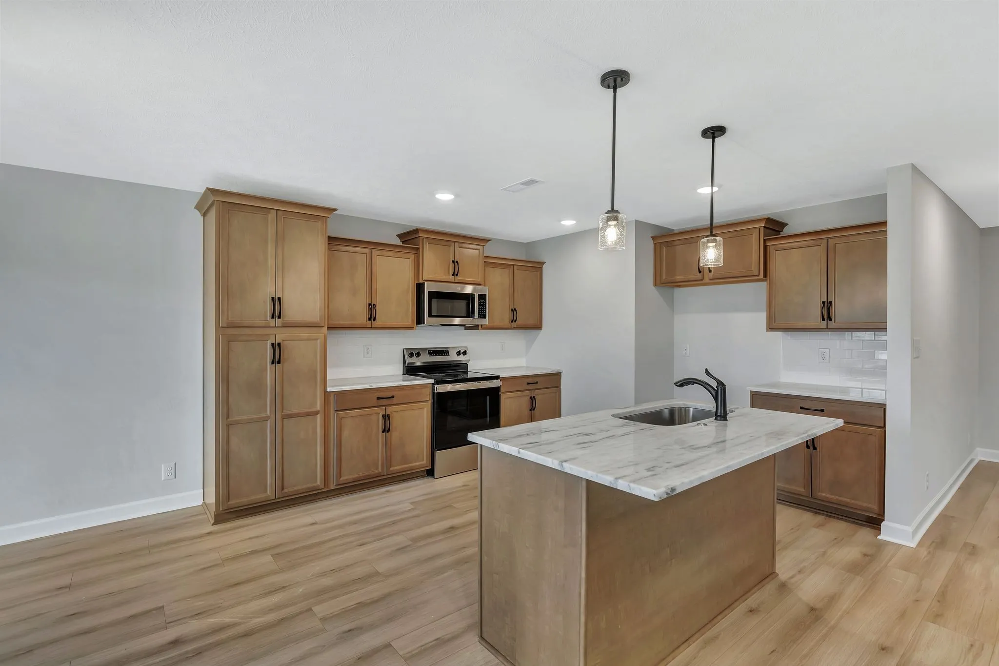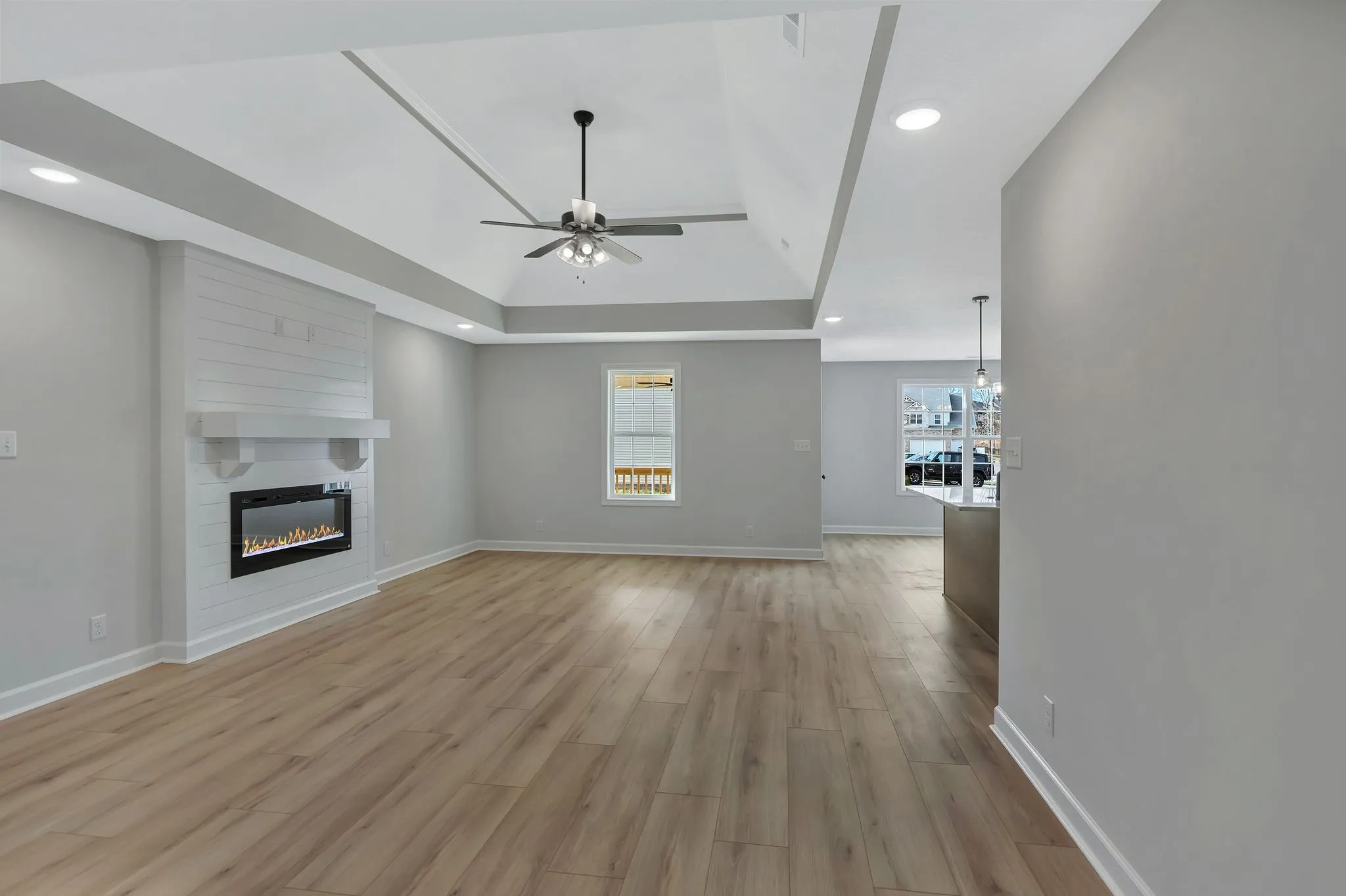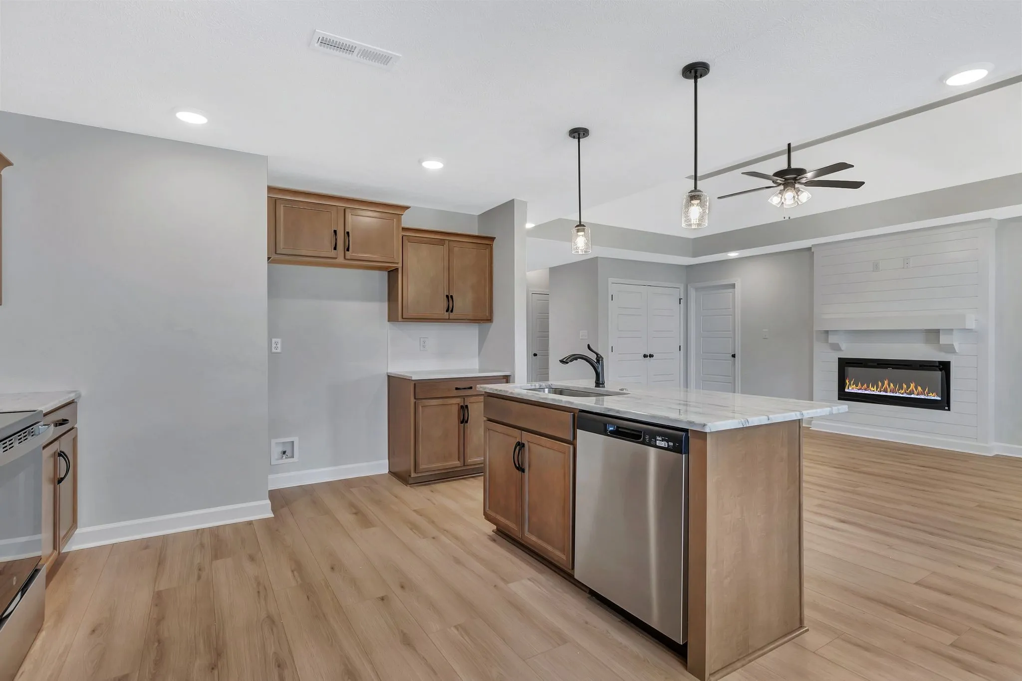 Adorable new construction ranch on a corner lot! This home offers a thoughtful split floor plan with an open living room, kitchen, and dining area that makes everyday living and entertaining easy. The living room features a shiplap fireplace as a focal point, while the kitchen and dining space flow seamlessly together with laminate flooring for a clean, modern look.