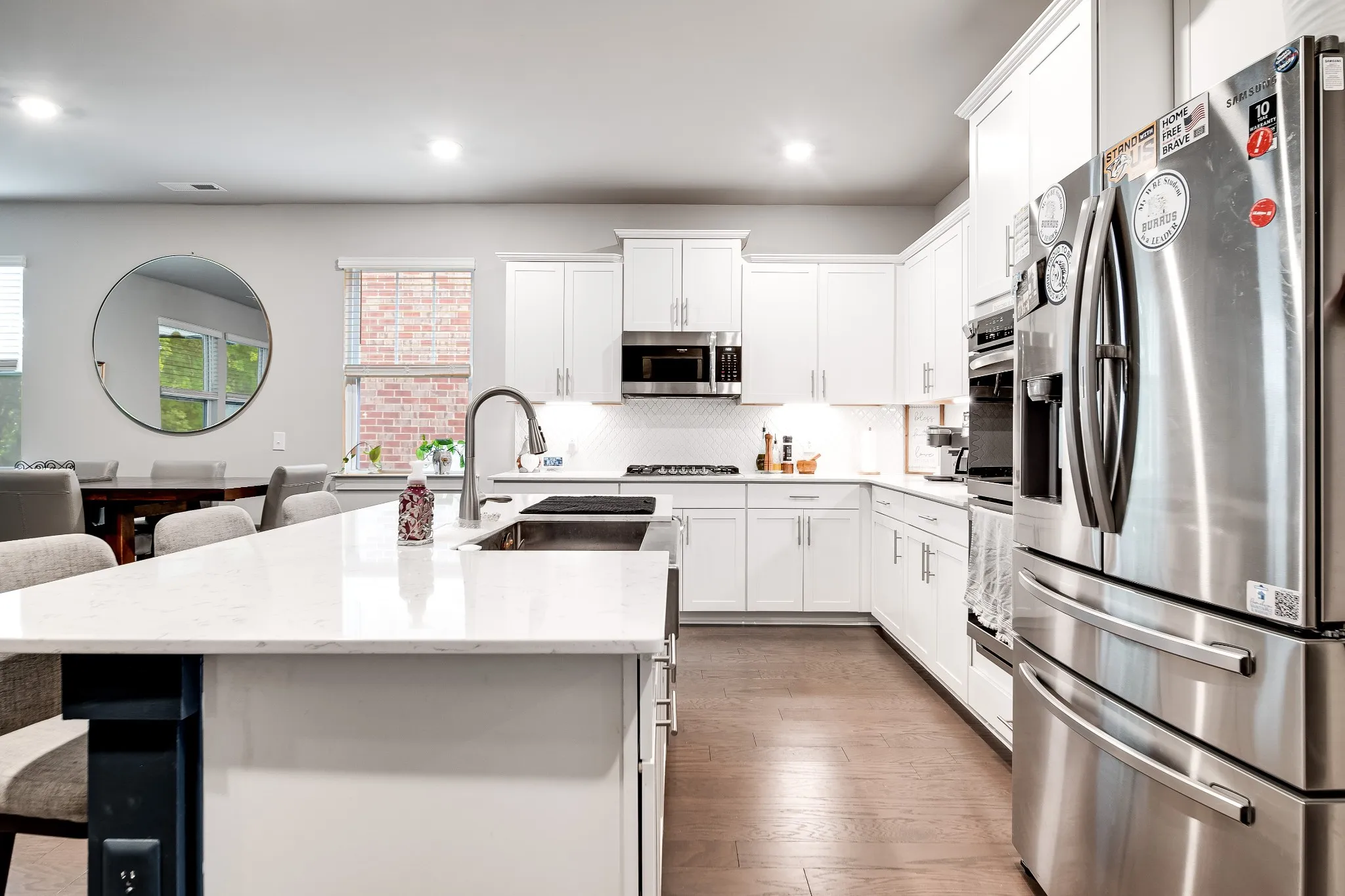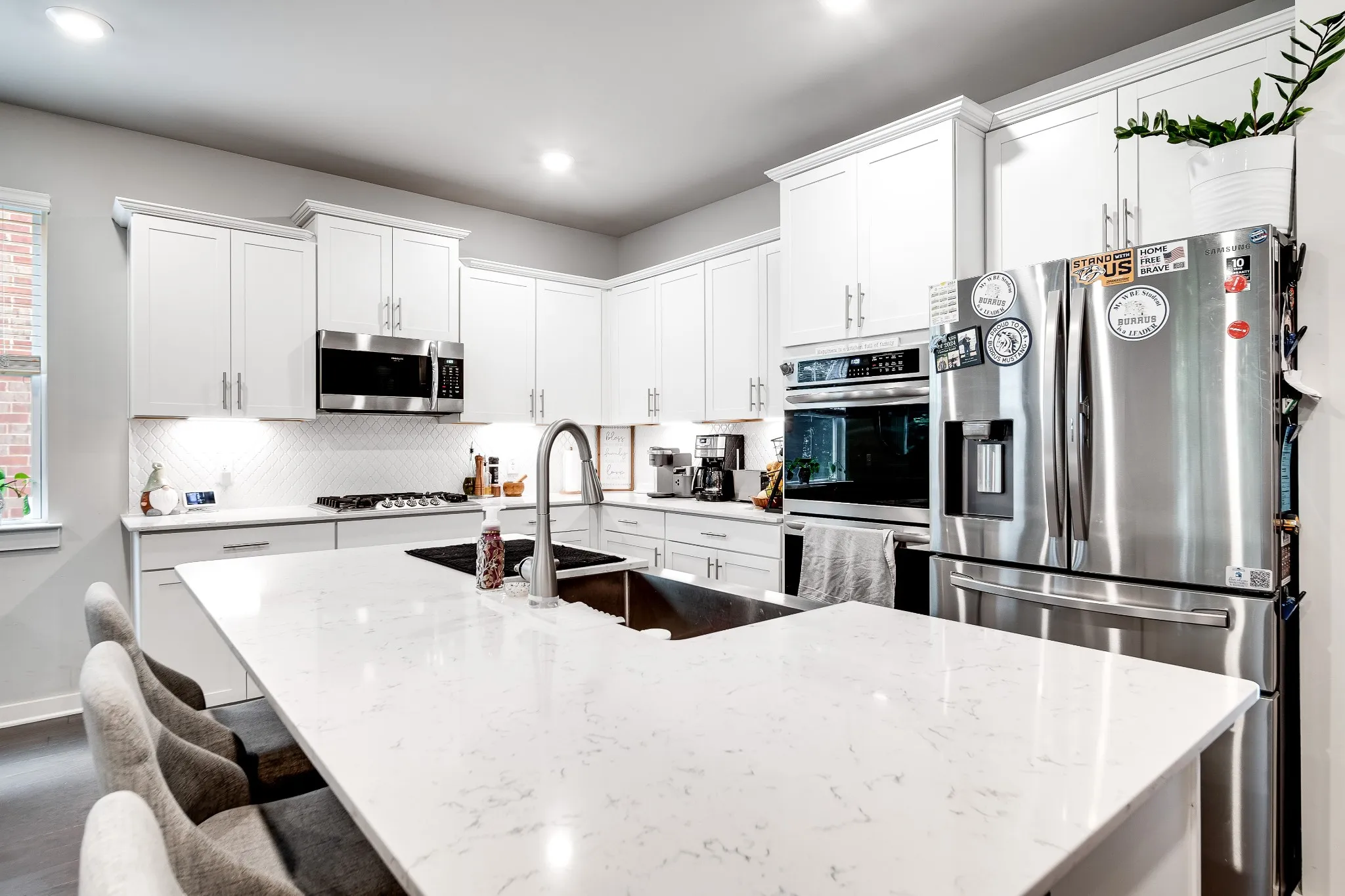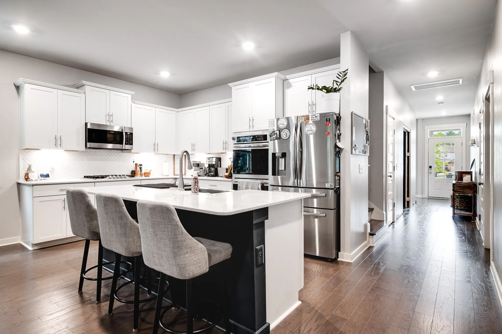 Step inside to find a stunning modern kitchen featuring a gas cooktop, double ovens, and a spacious island—perfectly designed for cooking, entertaining, and gathering. The kitchen flows seamlessly into the dining area and family room, creating an inviting open-concept living space. The main-level study can easily be converted into an additional bedroom to suit your needs.\n