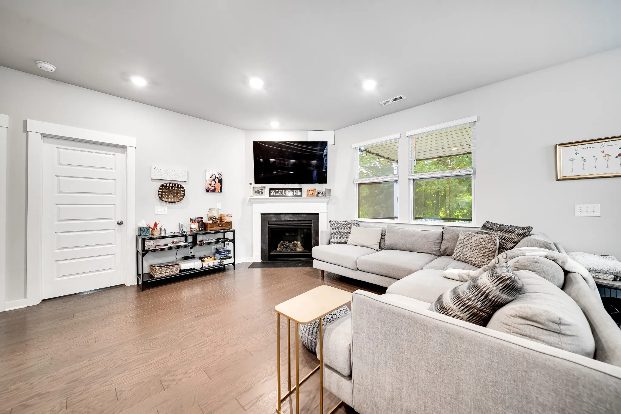Upstairs, discover a charming bedroom with a built-in bookcase that opens to a hidden bonus room—ideal for crafts, an office, a reading nook, or extra storage. Relax on the screened porch overlooking peaceful green space, offering the perfect retreat after a long day. Enjoy the professionally installed permanent soffit lighting for different holidays or everyday.