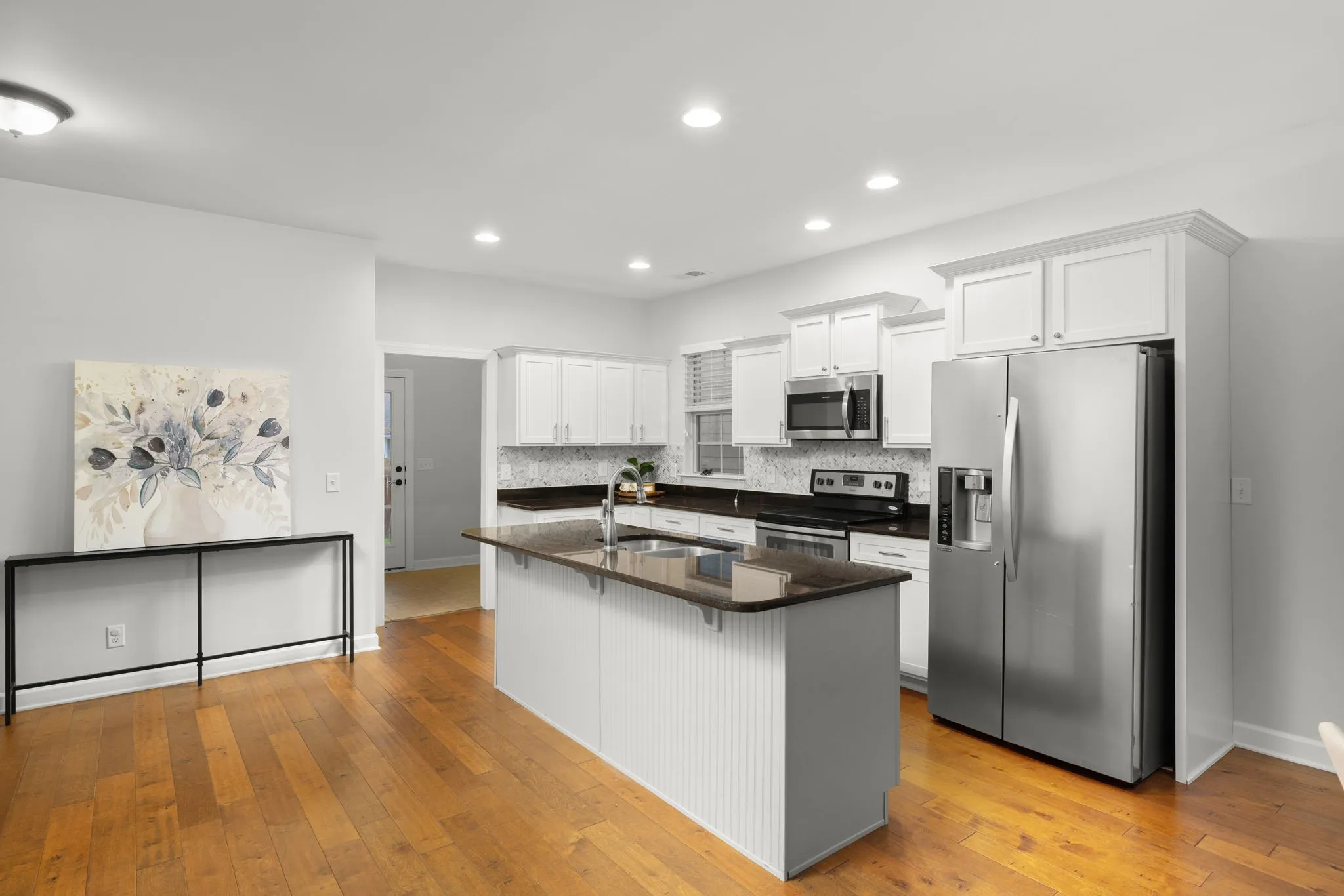 The open floor plan and cozy fireplace creates a warm and inviting atmosphere. The thoughtfully designed layout seamlessly connects the living area to the dining space and kitchen, ensuring that everyone can enjoy each other’s company while preparing meals or hosting gatherings.
