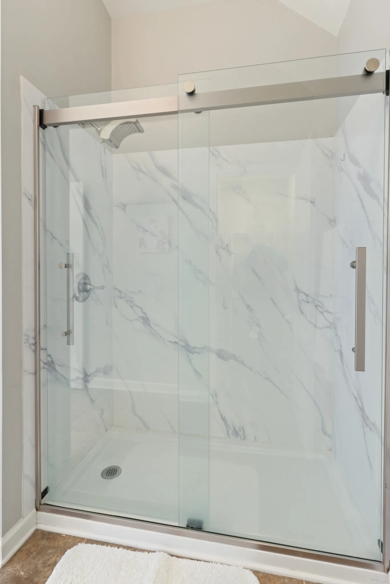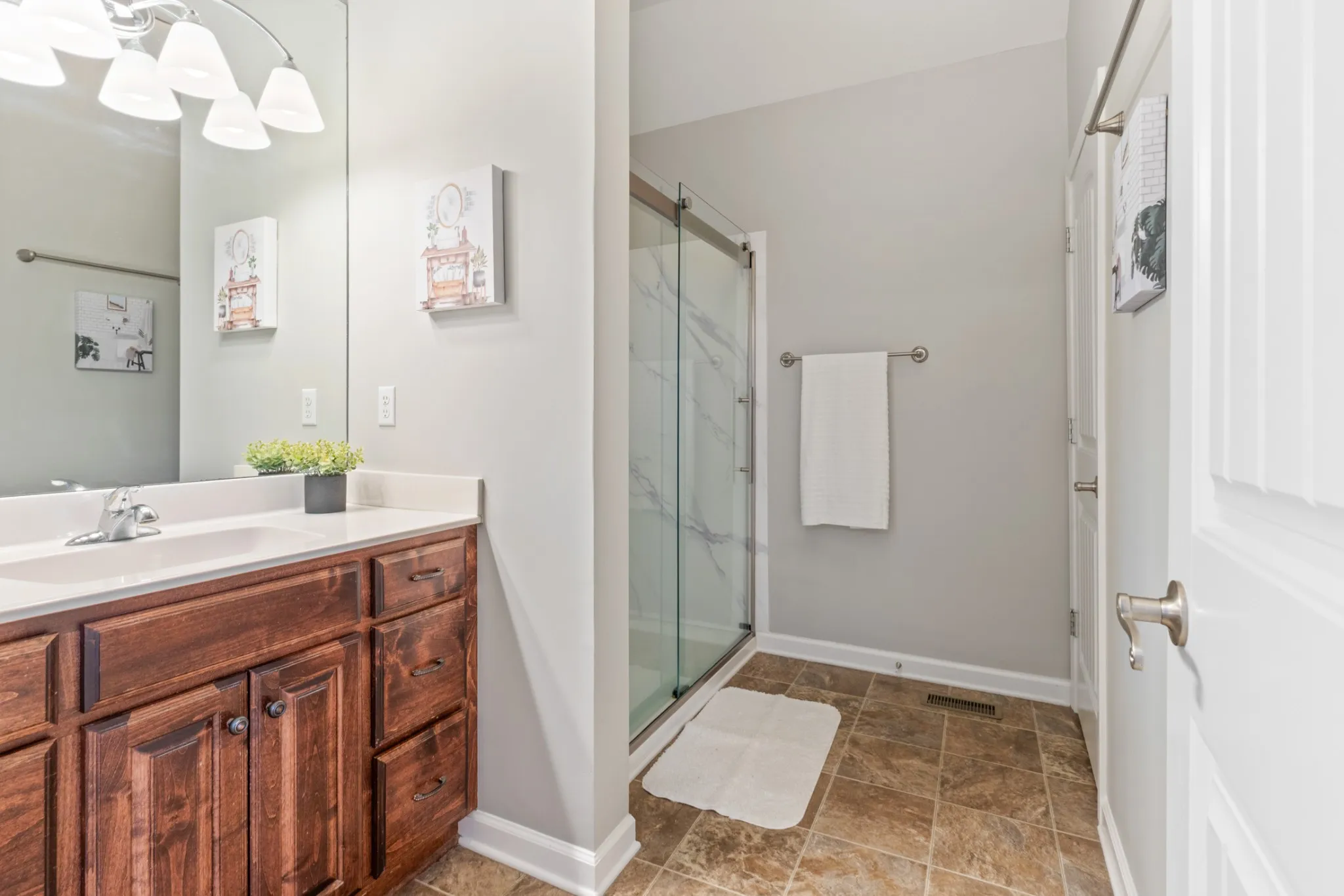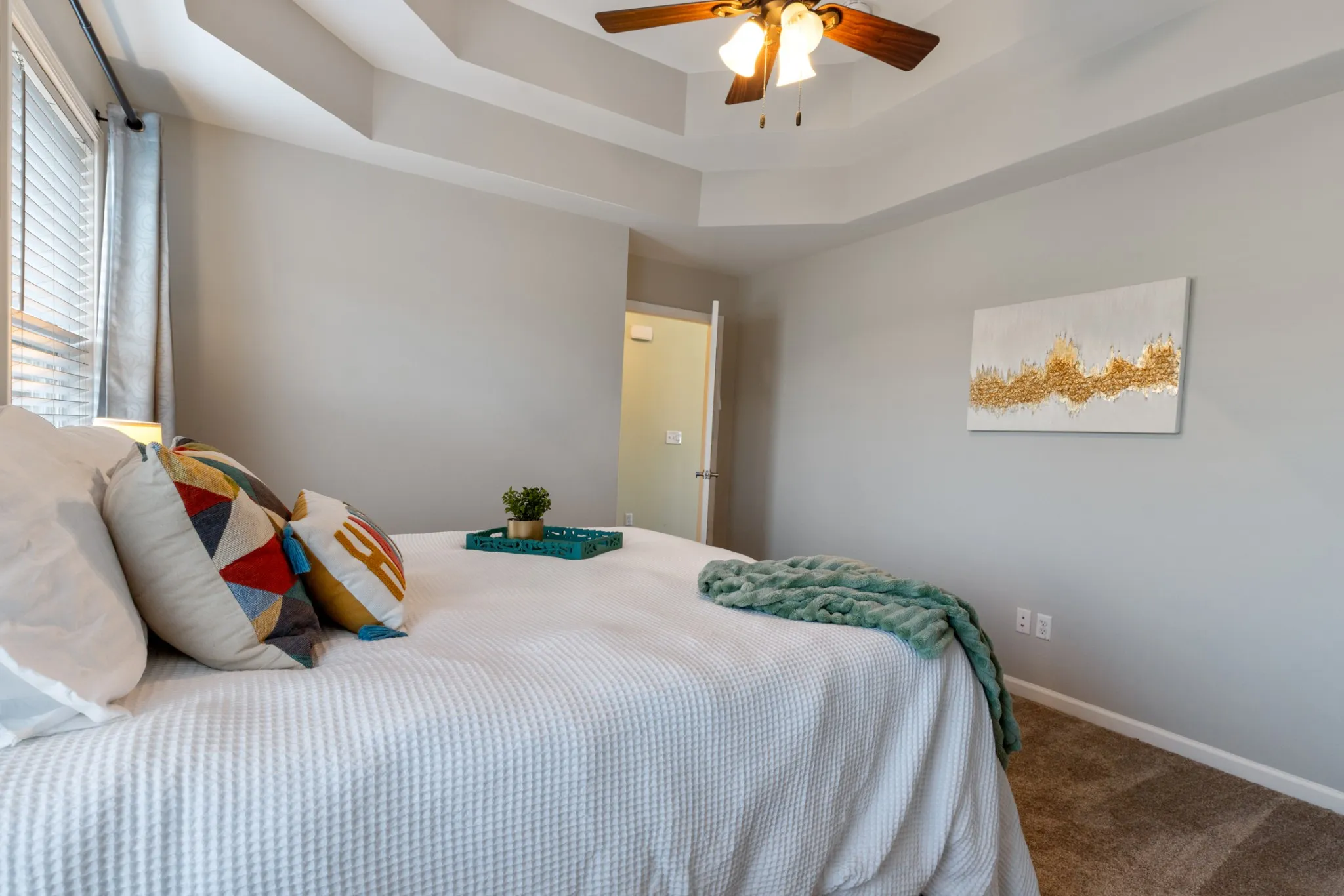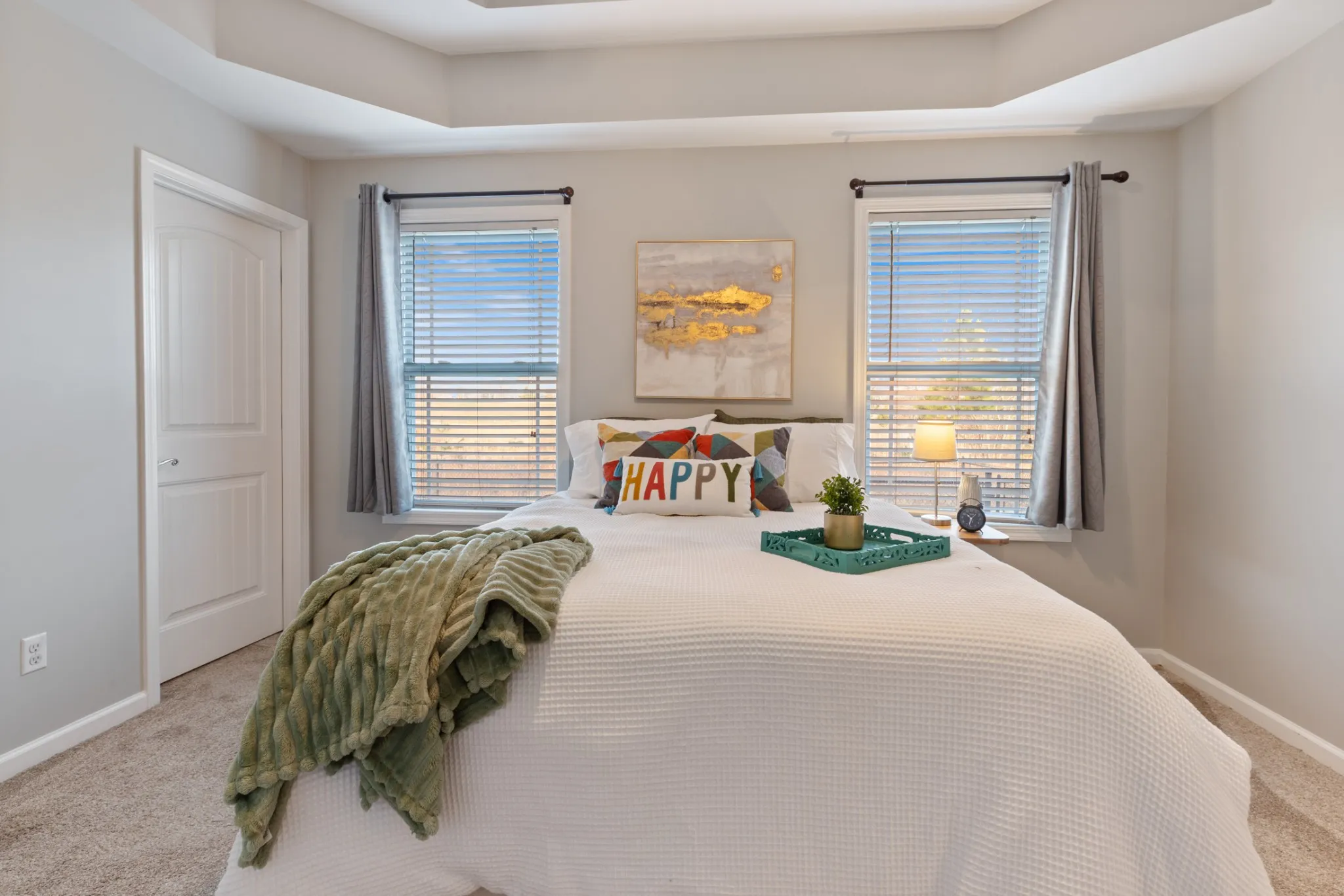 The primary suite located on the other side of the home from the other 2 bedrooms, offers a tray ceiling, walk-in closet, and a private bath with a large shower.