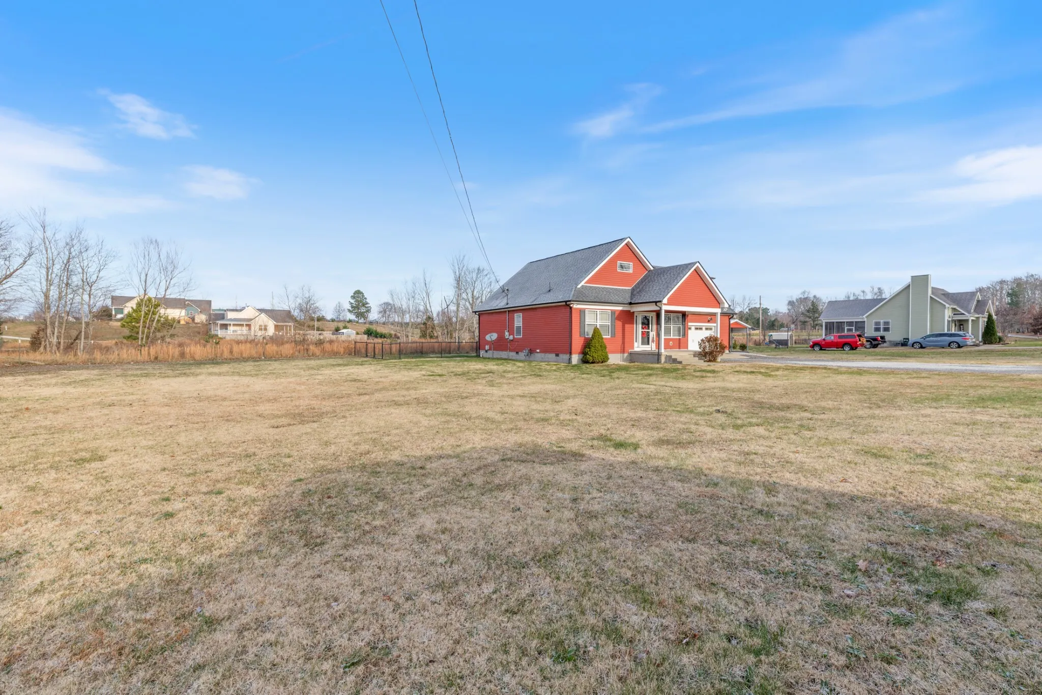 Welcome to this beautiful 3BR/2FB home that is perfectly situated on a .55-acre CORNER lot! The eye-catching red exterior, covered front porch, and two-car garage with a drive through garage door on the back side of the home, give this home instant curb appeal. Inside is a spacious open concept living area with vaulted ceilings, rich wood flooring, and plenty of natural light. The kitchen features warm cabinetry, Stainless steel appliances, and a bar that’s ideal for casual dining or entertaining guests.
