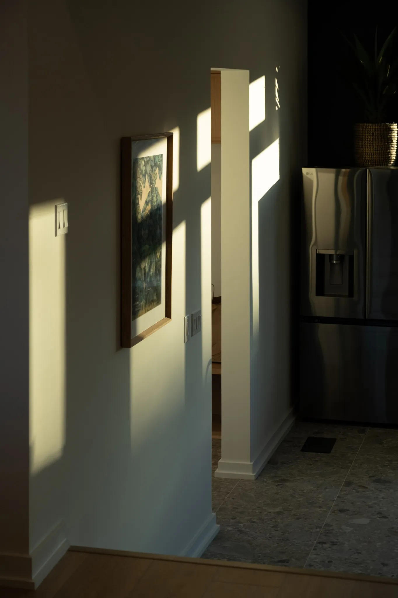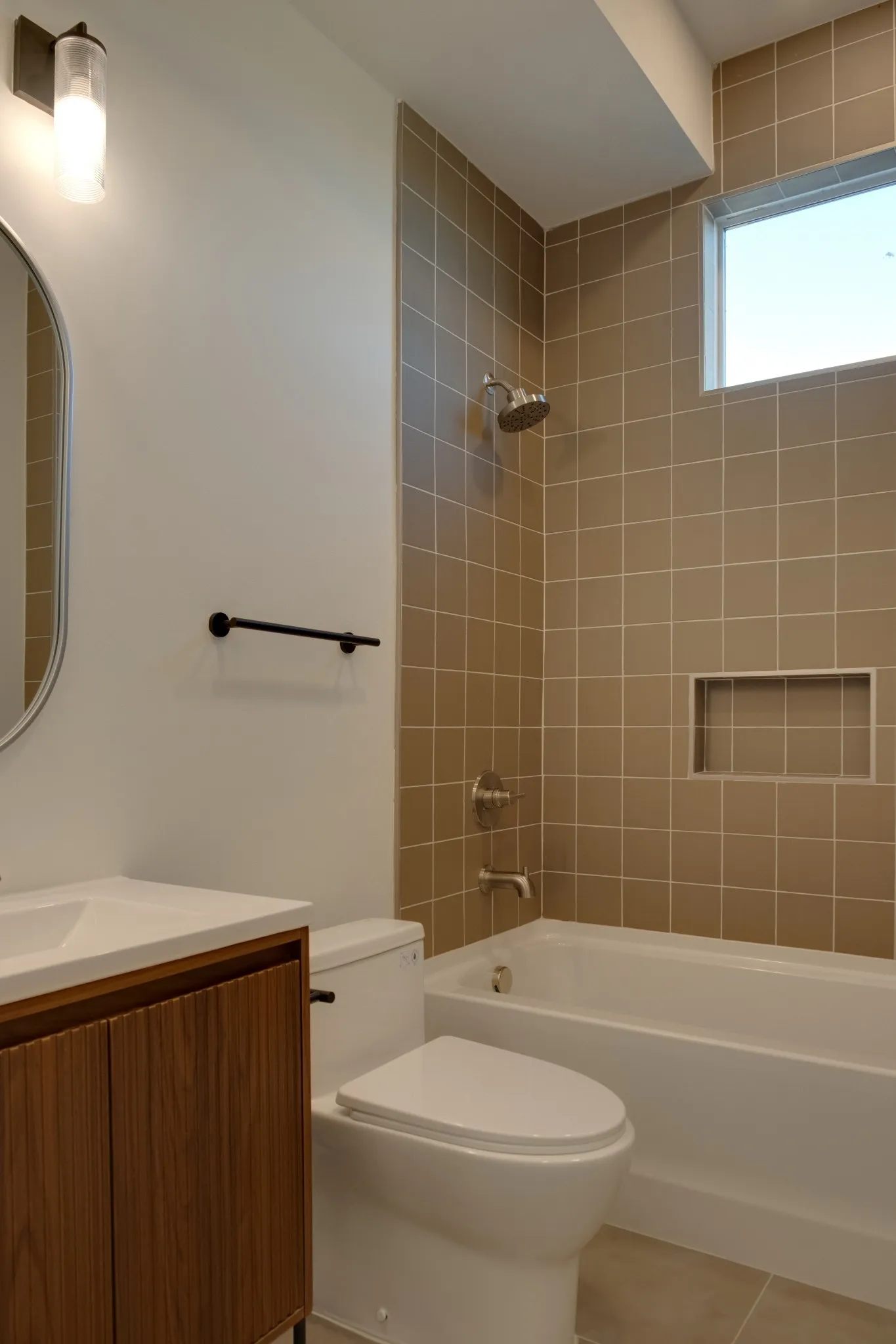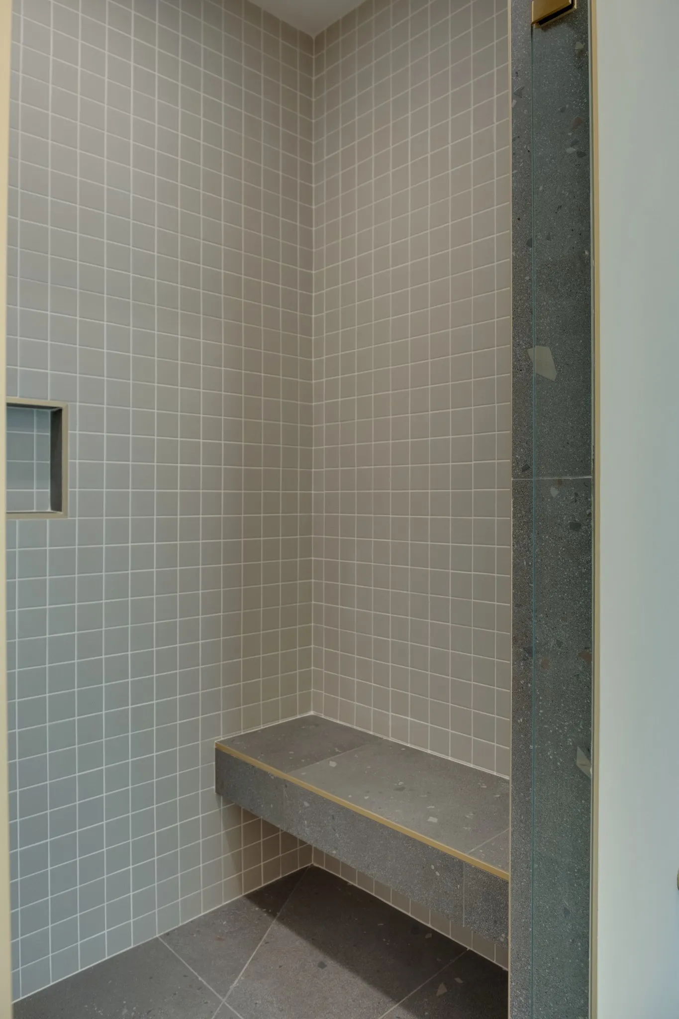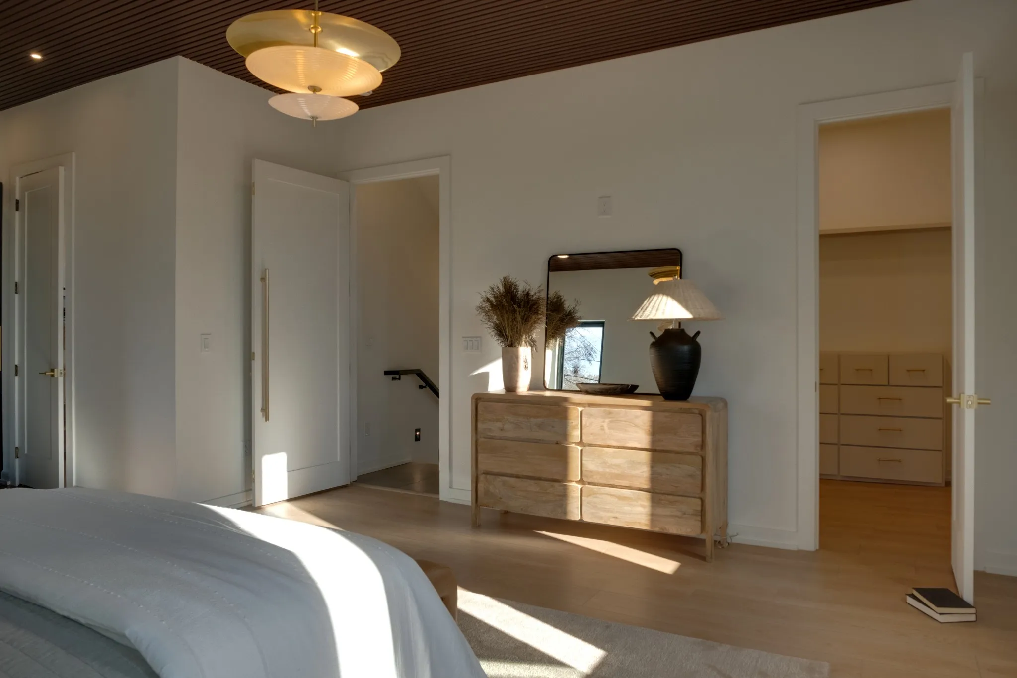 The primary suite is a private sanctuary featuring an open, naturalistic spa bath with sculptural fixtures, custom tilework, earthy Terrazzo, a soaking tub, dual closets, and an all-in-one washer and dryer integrated into your personal dressing wing.