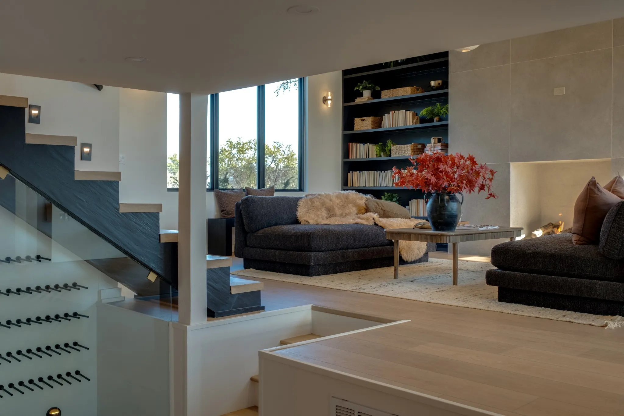 Enter into a striking living room anchored by a sleek gas-burning fireplace and wrapped in natural light. This is a space designed for elevated living, relaxed nights in, and unforgettable moments with guests.