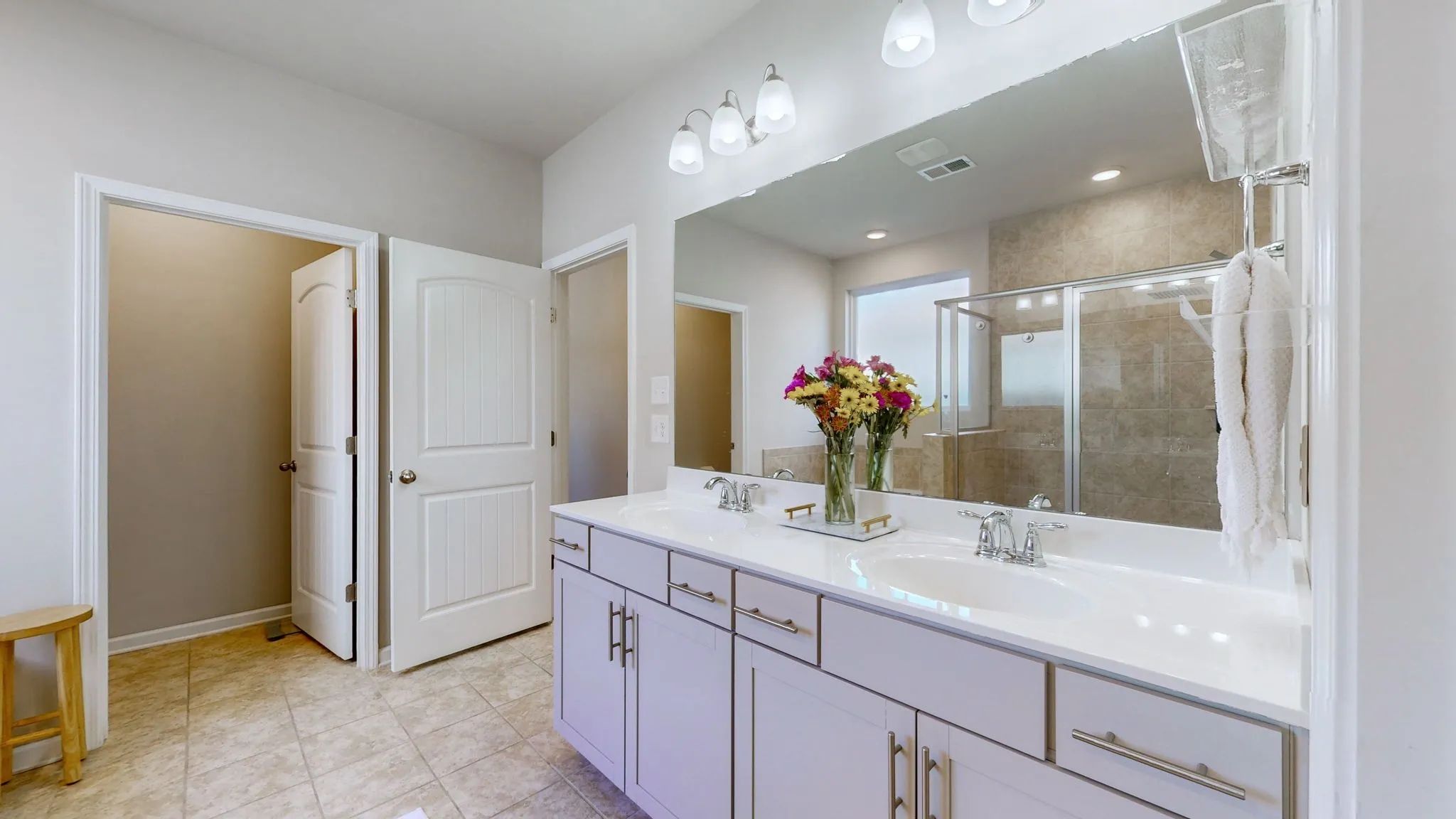 A flexible front room serves perfectly as an office, playroom, or optional 4th bedroom. The private primary suite is a true retreat, complete with a spa-inspired bath, dual vanities, soaking tub, separate shower, and a custom California Closet system.