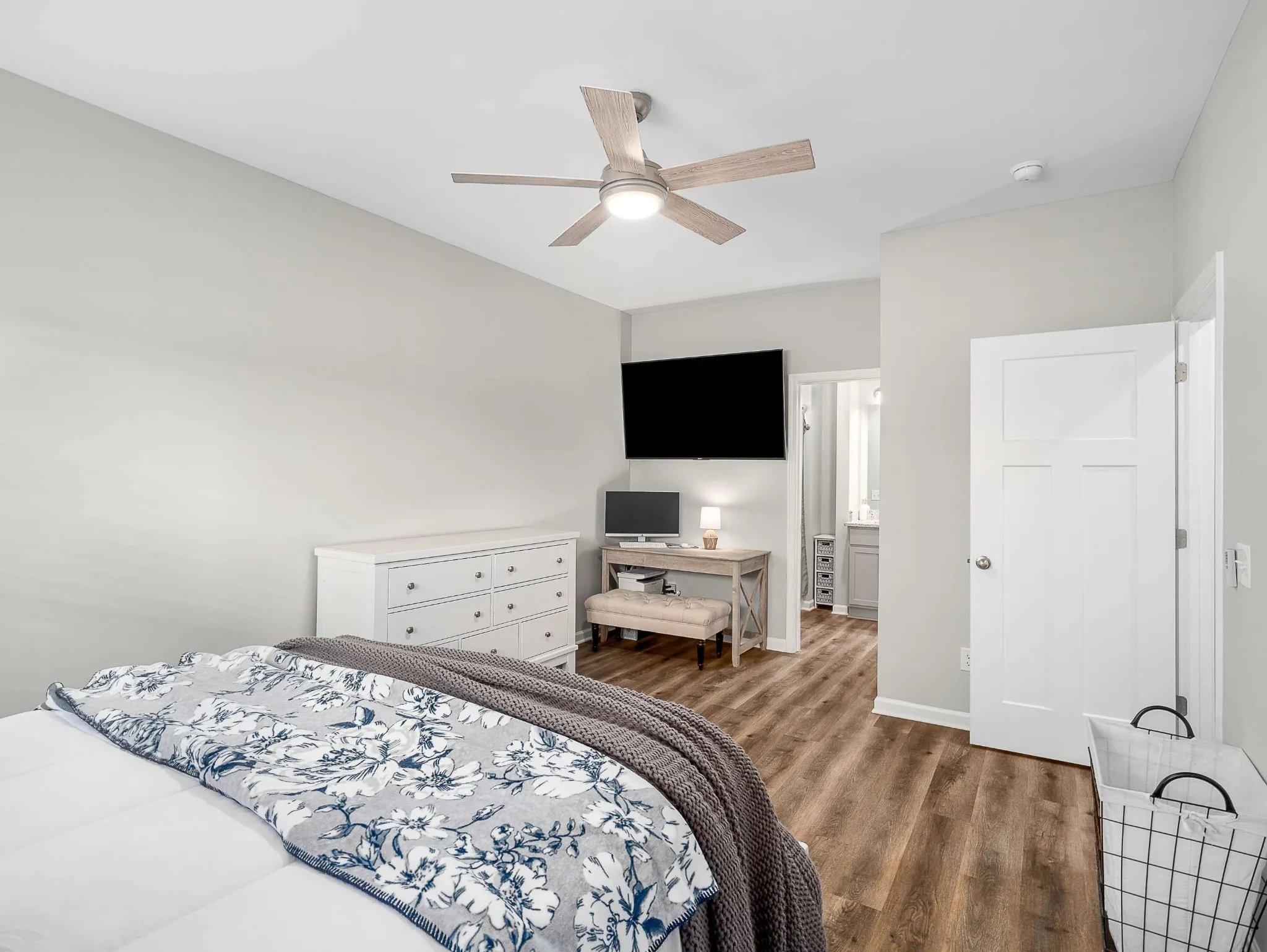 The spacious primary suite includes a walk-in closet and a relaxing en-suite bathroom with granite countertops and a soaking tub/shower combo. Two additional bedrooms and a second full bath offer comfortable space for guests, kids, or a home office.