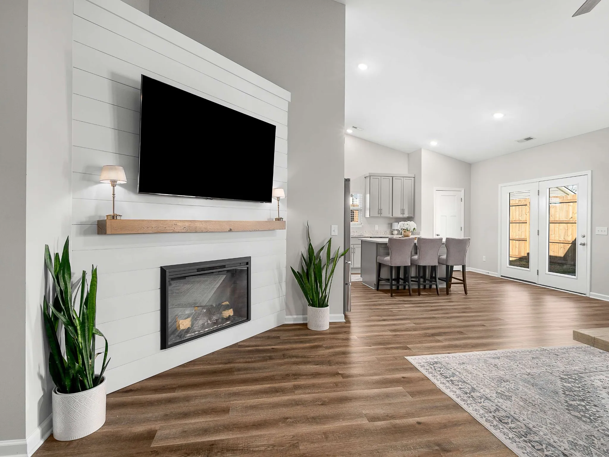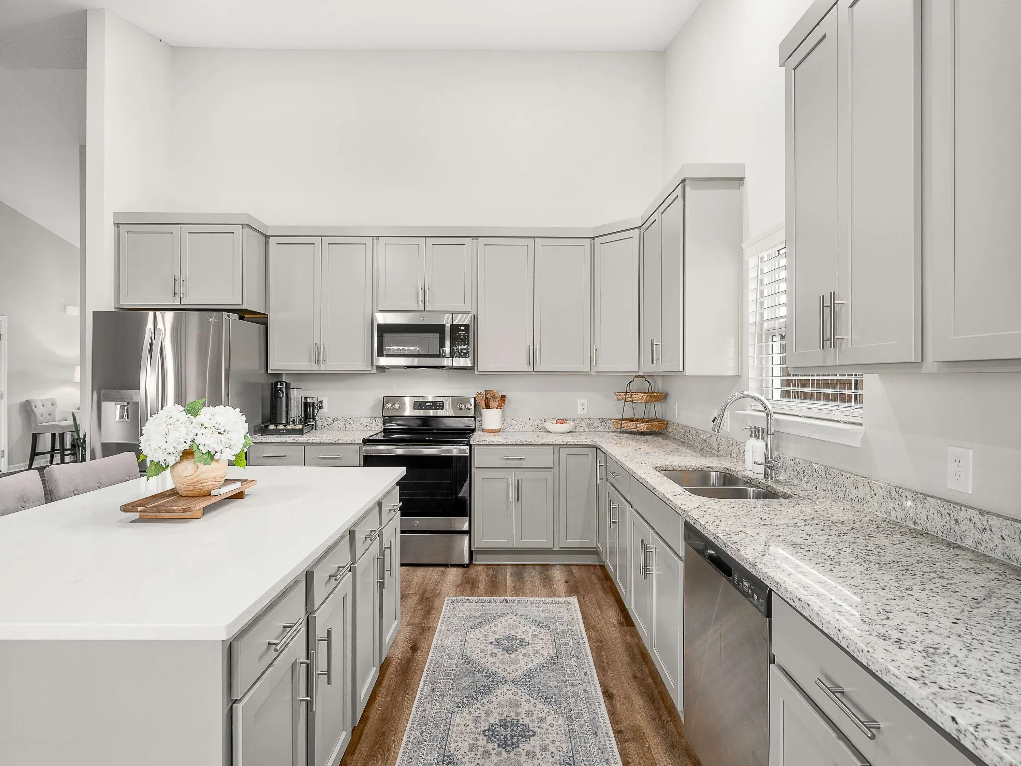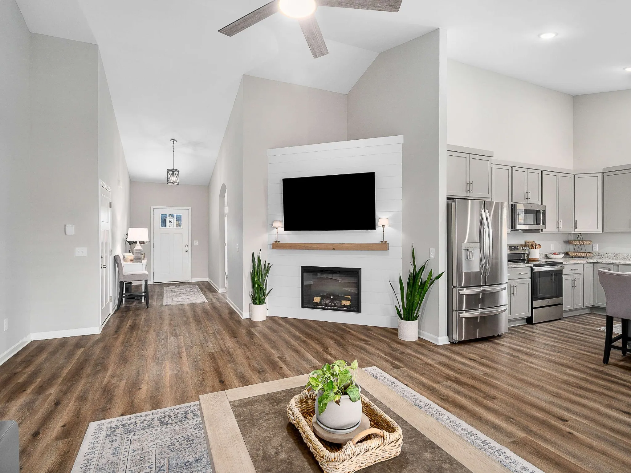 Step inside to an open-concept, cozy living area featuring an electric fireplace and a kitchen designed for both function and style—complete with a mix of granite and quartz countertops, GE stainless steel appliances, abundant cabinet storage, a pantry, and soft-close drawers. Whether hosting or prepping dinner for the family, this kitchen checks every box.