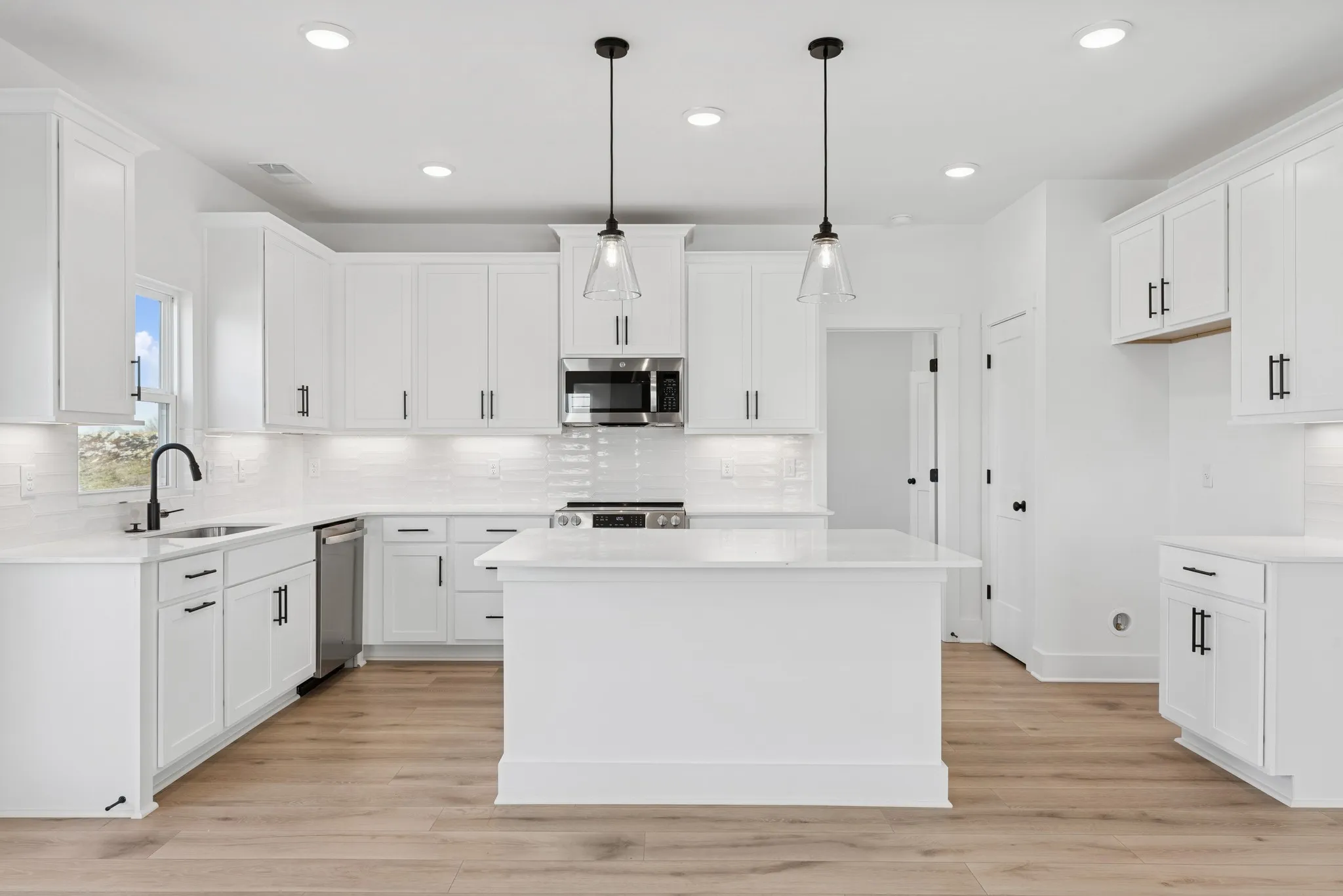 This spacious home features the Columbus floorplan that begins with a grand 8′ front door and a welcoming open foyer. Just off the entry, you’re greeted with a private study, perfect for remote work or a quiet retreat, along with a convenient half bath. The main living area is designed for family gatherings, celebrations, and entertaining, with a luxury kitchen boasting quartz countertops, upgraded cabinetry, under-cabinet lighting, and stainless steel appliances. The kitchen flows seamlessly into the open living and dining spaces, creating a warm and inviting atmosphere.