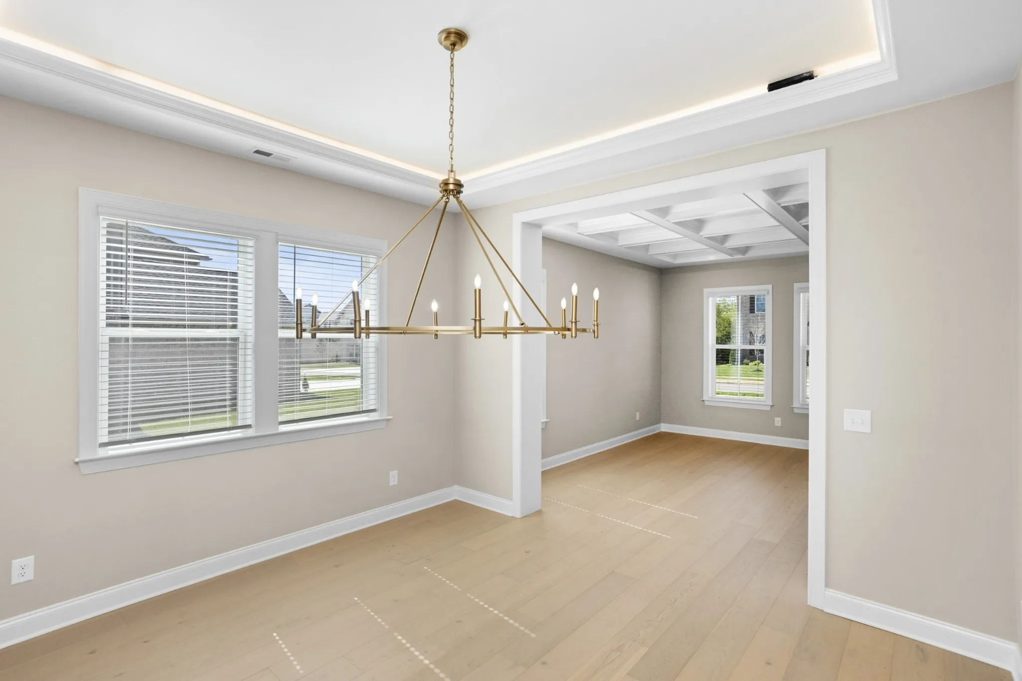 A grand two‑story entry leads to an open layout with tray and beamed ceilings, creating an inviting atmosphere for both daily life and memorable gatherings. The gourmet kitchen features a large island and walk‑in pantry and flows into a cozy breakfast nook and covered patio for effortless indoor‑outdoor living.