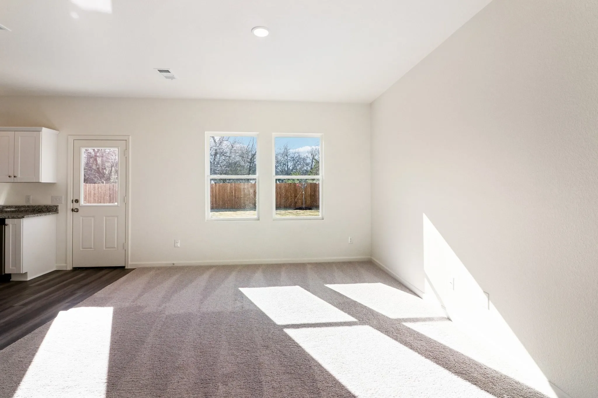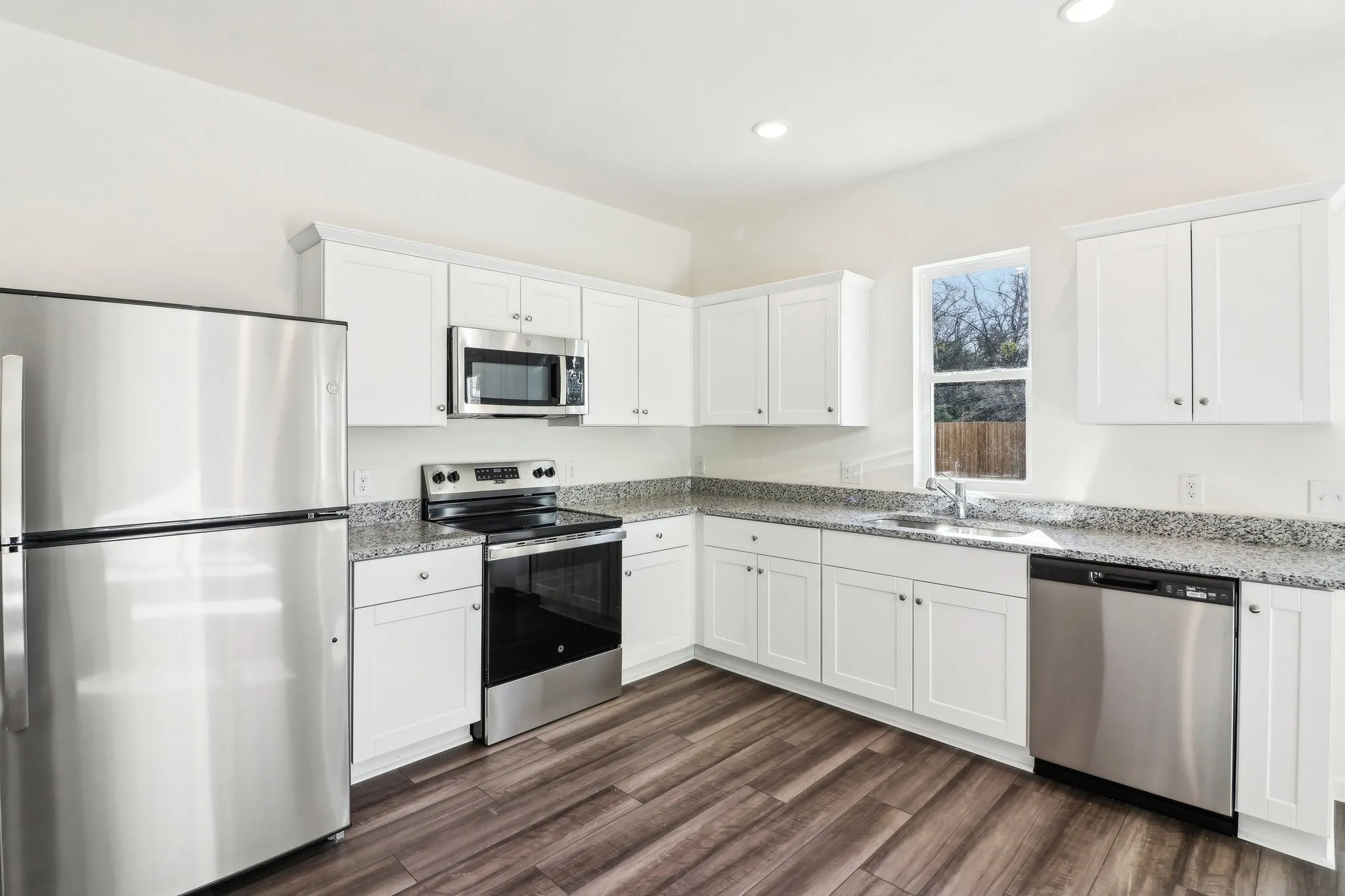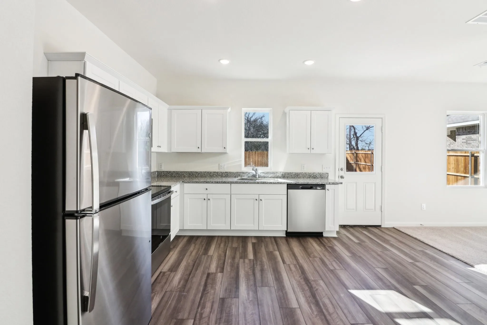 Step through the inviting covered porch into the foyer, where a convenient powder bath is located just down the hall. Beyond the entryway, the spacious family room opens seamlessly into the kitchen, creating an inviting space perfect for entertaining and everyday living. The kitchen stands out with its sleek granite countertops, brand-new stainless steel appliances, generous pantry, and easy access to the two-car garage.